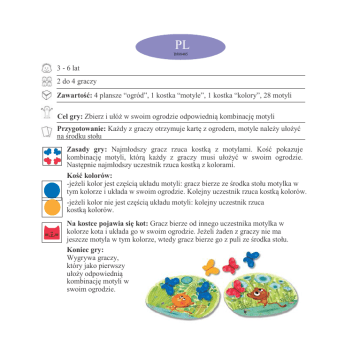 PL DJ084 3 - 6 lat 2 do 4 graczy Zawartość: 4 plansze “ogród”, 1 kostka “motyle”, 1 kostka “kolory”, 28 motyli Cel gry: Zbierz i ułóż w swoim ogrodzie odpowiednią kombinację motyli Przygotowanie: Każdy z graczy otrzymuje kartę z ogrodem, motyle należy ułożyć na środku stołu Zasady gry: Najmłodszy gracz rzuca kostką z motylami. Kość pokazuje kombinację motyli, którą każdy z graczy musi ułożyć w swoim ogrodzie. Następnie najmłodszy uczestnik rzuca kostką z kolorami. Kość kolorów: -jeżeli kolor jest częścią układu motyli: gracz bierze ze środka stołu motylka w tym kolorze i układa w swoim ogrodzie. Kolejny uczestnik rzuca kostką kolorów. -jeżeli kolor nie jest częścią układu motyli: kolejny uczestnik rzuca kostką kolorów. Na kostce pojawia się kot: Gracz bierze od innego uczestnika motylka w kolorze kota i układa go w swoim ogrodzie. Jeżeli żaden z graczy nie ma jeszcze motyla w tym kolorze, wtedy gracz bierze go z puli ze środka stołu. Koniec gry: Wygrywa graczy, który jako pierwszy ułoży odpowiednią kombinację motyli w swoim ogrodzie.