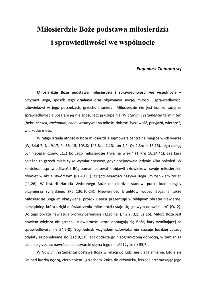 Miłosierdzie Boże podstawą miłosierdzia i sprawiedliwości we wspólnocie Eugeniusz Ziemann scj Miłosierdzie Boże podstawą miłosierdzia i sprawiedliwości we wspólnocie – przymiot Boga, sposób Jego działania oraz objawiania swojej miłości i sprawiedliwości człowiekowi w jego potrzebach, grzechu i śmierci. Miłosierdzie nie jest konfrontacją ze sprawiedliwością Bożą ani jej nie znosi, lecz ją uzupełnia. W Starym Testamencie termin ten (hebr. chesed, rachamim, chen) wskazywał na miłość, dobroć, życzliwość, przyjaźń, wierność, wielkoduszność. W religii Izraela ufność w Boże miłosierdzie zajmowała centralne miejsce w ich wierze (Wj 34,6‐7; Ne 9,17; Ps 86, 15; 103,8; 145,8; Jl 2,13; Jon 4,2; Oz 2,3n; Jr 15,15). Jego zasięg był nieograniczony: „(…) bo Jego miłosierdzie trwa na wieki” (1 Krn 16,34.41), zaś kara należna za grzech miała tylko wymiar czasowy, gdyż obejmowała jedynie kilka pokoleń. W kontekście sprawiedliwości Bóg zamanifestował i objawił człowiekowi swoje miłosierdzie również w akcie stwórczym (Ps 40,11). Księga Mądrości nazywa Boga „miłośnikiem życia” (11,26). W historii Narodu Wybranego Boże miłosierdzie stanowi punkt kulminacyjny przymierza synajskiego (Ps 136,10‐24). Niewierność Izraelitów wobec Boga, a także Miłosierdzie Boga im okazywane, prorok Ozeasz prezentuje w biblijnym obrazie niewiernej nierządnicy, która dzięki doświadczeniu miłosierdzia staje się „nowym człowiekiem” (Oz 2). Do tego obrazu nawiązują prorocy Jeremiasz i Ezechiel (Jr 2,2; 3,1; Ez 16). Miłość Boża jest bowiem większa niż grzech i niewierność, które domagają się Bożej kary wynikającej ze sprawiedliwości (Iz 54,5‐8). Bóg jednak względem człowieka nie stosuje ludzkiej zasadą odpłaty za popełniane zło (Ezd 9,13), lecz obdarza go nieograniczoną dobrocią, w zamian za uznanie grzechu, nawrócenie i otwarcie się na Jego miłość i życie (Iz 55,7). W Nowym Testamencie postawa Boga w relacji do ludzi nie ulega zmianie. Lituje się On nad ludzką nędzą, cierpieniem i grzechem. Zniża do człowieka, lecząc i przebaczając jego 2 słabości (Łk 1,50.54.58.72.78) w Jezusie Chrystusie, realizującego przymierze oraz obietnice Ojca w odniesieniu do grzeszników, którzy uważali, że są wykluczeni z królestwa Bożego (Łk 18,9‐14). Świadczą o tym liczne przypowieści Jezusa m.in. o nielitościwym dłużniku (Łk 18,23‐ 35) i synu marnotrawnym (Łk 15,11‐32). Szczytowy wyraz nowotestamentalnej refleksji nad Bożym Miłosierdziem stanowi list Pawła Apostoła do Efezjan (2,4‐5), akcentujący zbawcze dzieło Jezusa i dobroć Boga. Bóg bogaty w miłosierdzie przywrócił umarłą ludzkość do życia z Chrystusem w Duchu Świętym (2 J 3). Wczesne chrześcijaństwo, rozwijając naukę o wielkim Bożym miłosierdziu, ubogaciło ją nowymi treściami w świetle Objawienia Jezusa Chrystusa (1 P 1,3; Jk 3,17). W teologicznej i duchowej tradycji chrześcijaństwa Boże miłosierdzie stanowi relację Boga do człowieka, która usuwa braki, nieszczęścia i nędze. Każde bowiem dzieło Boga wyrażające Jego sprawiedliwość jest też manifestacją Jego miłosierdzia wobec ludzkiej słabości i grzechu. W Bożym miłosierdziu są obecne wszystkie aspekty miłości Boga zwłaszcza łaskawość względem człowieka doświadczającego zła i grzechu, które poniżają jego godność. Dzięki zbawczemu dziełu Jezusa Chrystusa Bóg uobecnił i ukazał swoje miłosierdzie. Kościół zrodzony z miłości Ukrzyżowanego i Zmartwychwstałego wyznaje Boże miłosierdzie, kiedy sprawuje sakramenty – pokotu i pojednania, wzywając go dla siebie i całego świata przez Serce Jezusa, które jest najbardziej dostępnym punktem objawienia miłosiernej miłości Ojca stanowiącej centralna treść mesjańskiego posłannictwa Syna Człowieczego. Objawione w Chrystusie i Jego dziele pozwala człowiekowi najpełniej odnaleźć jego godność, a przez czyny miłosierdzia Jezus nie tylko objawił miłosiernego Ojca, ale również sam stał się miłosiernym Zbawicielem oraz wzorem czynienia miłosierdzia. Dzięki temu można powiedzieć, że miłosierdzie jest rzeczywistym przymiotem Boga, uobecnionym i objawionym w Jezusie Chrystusie. Stąd też człowiek zanurzony w misterium wcielenia i odkupienia, winien odpowiadać miłością ofiarną i solidarną na wzór Zbawiciela, wydobywając każde dobro z pokładów zła, które zdominowało struktury społeczno‐religijne współczesnego świata. Do rozwoju kultu Bożego miłosierdzia w XX wieku, związanego z prywatnymi objawieniami siostry Faustyny Kowalskiej, przyczynił się św. papież Jan Paweł II. Zatroskany o każdego człowieka ogłosił 30 listopada 1980 roku encyklikę Dives in misericordia, poświęconą zagadnieniu Bożego miłosierdzia. Stanowiła ona kontynuację i przedłużenie 3 personalistyczno‐chrystologicznej encykliki Redemptor hominis (1979). We wstępie do tego dokumentu papież pisał: „Idąc za nauką Soboru Watykańskiego II i odpowiadając na szczególną potrzebę czasów, w których żyjemy, poświęciłem encyklikę Redemptor hominis prawdzie o człowieku, która w pełni i do końca odsłania się w Chrystusie. Nie mniejsza potrzeba tych przełomowych i trudnych czasów przemawia za tym, aby w tym samym Chrystusie odsłonić raz jeszcze oblicze Ojca, który Jest «Ojcem miłosierdzia oraz Bogiem wszelkiej pociechy» (2 Kor 1,3)” (1). Z tego dokumentu przebija krakowskie doświadczenie papieża Wojtyły, oparte na życiu i doświadczeniu św. Faustyny Kowalskiej, apostołki Bożego miłosierdzia, którą beatyfikował w 1993 roku i kanonizował w roku 2000. W tym samym roku ustanowił też święto Bożego miłosierdzia w 2. Niedzielę Wielkanocy, a w 2002 roku zatwierdził Światowe Centrum Bożego Miłosierdzia w Krakowie‐Łagiewnikach, a także zawierzył świat Bożemu miłosierdziu. We wspomnianej encyklice 