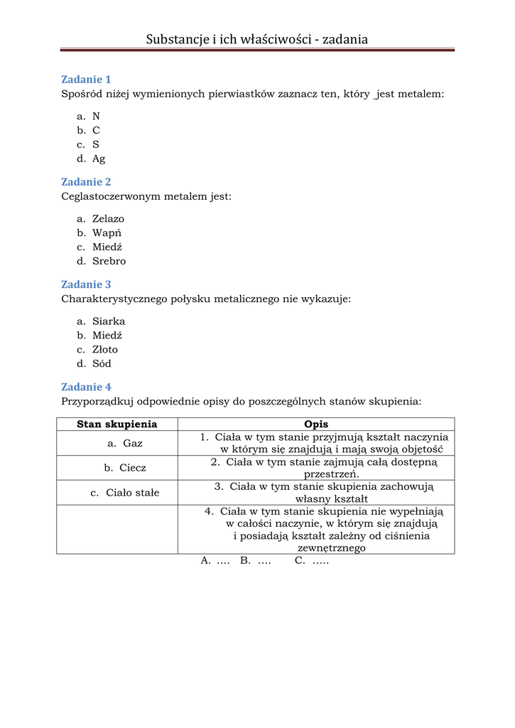 Substancje i ich właściwości - zadania Zadanie 1 Spośród niżej wymienionych pierwiastków zaznacz ten, który jest metalem: a. b. c. d. N C S Ag Zadanie 2 Ceglastoczerwonym metalem jest: a. b. c. d. Zelazo Wapń Miedź Srebro Zadanie 3 Charakterystycznego połysku metalicznego nie wykazuje: a. b. c. d. Siarka Miedź Złoto Sód Zadanie 4 Przyporządkuj odpowiednie opisy do poszczególnych stanów skupienia: Stan skupienia a. Gaz b. Ciecz c. Ciało stałe Opis 1. Ciała w tym stanie przyjmują kształt naczynia w którym się znajdują i mają swoją objętość 2. Ciała w tym stanie zajmują całą dostępną przestrzeń. 3. Ciała w tym stanie skupienia zachowują własny kształt 4. Ciała w tym stanie skupienia nie wypełniają w całości naczynie, w którym się znajdują i posiadają kształt zależny od ciśnienia zewnętrznego A. …. B. …. C. ….. Substancje i ich właściwości - zadania Zadanie 5 Zosia na pierwszej lekcji chemii sporządziła notatkę odnośnie regulaminu pracowni chemicznej, jednak popełniła kilka błędów. Rozstrzygnij, które ze zdań są prawdziwe, a które fałszywe, wpisując odpowiednio literę P lub literę F. Fragmenty notatki W pracowni chemicznej nie można spożywać posiłków. Do pracowni uczniowie wchodzą samodzielnie. Resztki niebezpiecznych substancji należy wyrzucać do kosza. Uczniowie nie mogą wynosić żadnych substancji z pracowni. P/F Zadanie 6 Dowodem ziarnistej budowy materii nie jest: a. b. c. d. Rozprzestrzenianie się zapachu pieczonego ciasta po mieszkaniu, Topnienie śniegu na wiosnę, Rozpuszczanie się cukru w wodzie, Wszystkie przykłady są dowodami na ziarnistą budowę materii Zadanie 7 Która z poniższych cech metali jest charakterystyczna dla wszystkich metali: a. b. c. d. Srebrzystoszara barwa, Dobre przewodnictwo elektryczne Stały stan skupienia, Kowalność Zadanie 8 Zakreśl właściwą odpowiedź w poniższej fragmencie notatki ucznia z lekcji. Mieszanina składa się z co najmniej dwóch/trzech substancji. Ze względu na stopień rozdrobnienia składników/ilość składników wyróżnia się: - mieszaninę jednorodną– mieszanina, w której nie można/można zobaczyć poszczególnych składników gołym okiem - mieszaninę niejednorodną – mieszanina, w której można/nie można zobaczyć poszczególne składniki mieszaniny Substancje i ich właściwości - zadania Zadanie 9 Mieszaninę solanki i muszli rozdzieli się używając kolejno następujących metod rozdziału substancji: a. b. c. d. Sedymentacja, filtracja, Filtracja, użycie magnesu, Filtracja, odparowanie rozpuszczalnika, Odparowanie rozpuszczalnika, filtracja Zadanie 10 Poniżej wypisano różnego rodzaju mieszaniny, podkreśl te, które są mieszaninami niejednorodnymi. Mgła, siarka i żelazo, solanka, pieprz i sól, powietrze, woda z olejem, mosiądz, brąz, zaprawa murarska, benzyna, woda z benzyną, aluminium Zadanie 11 Zmieszano mąkę z solą. Aby rozdzielić te substancje, należy: a. b. c. d. Dodać wodę i przesączyć Dodać wodę, przesączyć, a na końcu odparować wodę z przesączu, Użyć sito o odpowiednio dobranych oczkach, Rozpuścić w wodzie i przedestylować Zadanie 12 Aby wyodrębnić alkohol etylowy z szampana należy mieszaninę: a. b. c. d. Przedestylować Przesączyć, Oziębić Wszystkie odpowiedzi są poprawne Zadanie 13 Wskaż która z substancji nie pasuje do pozostałych: a. b. c. d. Dwutlenek węgla Chlorowodór Woda w temperaturze pokojowej Amoniak Substancje i ich właściwości - zadania Zadanie 14 Na lekcji chemii uczniowie mieli za zadanie udowodnić, że cukier jest substancją złożoną, jednak otrzymaną od nauczyciela instrukcje pomieszali. Pomóż kolegom, wpisując liczby o 1 do 4, tak aby utworzony sposób postępowania był logiczny. Kolejność (1-4) Wykonywana czynność Załączyć palnik gazowy Wsypać cukier do probówki Uchwycić probówkę w łapę do probówek Umieścić probówkę z cukrem nad palnikiem, tak aby wylot był skierowany w kierunku gdzie nikt się nie znajduje Zadanie 15 Poniżej przedstawiono dwie mieszaniny, dla każdej wskaż rodzaj mieszaniny oraz najlepszy sposób rozdziału. Mieszanina Rodzaj mieszaniny Sposób rozdziału Woda z olejem a. Jednorodna b. Niejednorodna c. Dekantacja d. Przy użyciu rozdzielacza Żelazo z cukrem a. Jednorodna b. niejednorodna c. filtracja d. przy użyciu magnesu Zadanie 16 Poniżej przedstawiono tabelę temperaturę wrzenia i topnienia różnych substancji. Na jej podstawie określ stan skupienia poszczególnych substancji w temperaturze 550C. substancja temp. topnienia[0C] temp. wrzenia [0C] woda 0 100 pentan -130 36 siarka 113 445 Woda: …………, pentan: …………………, siarka: …………………… Substancje i ich właściwości - zadania Zadanie 17 Poniżej przedstawiono opisy właściwości fizycznych różnych substancji. Przyporządkuj odpowiednie właściwości do nazw substancji. Substancja 1. Złoto 2. Cukier 3. Miedź 4. Siarka 1. 2. 3. 4. …. …. …. …. Właściwości a. Kruche ciało stałe o barwie żółtej o charakterystycznym zapachu b. Ciało stałe o barwie ceglastoczerwonej, posiadające charakterystyczny połysk c. Ciało stałe o barwie żółtej, posiadające charakterystyczny połysk d. Ciało stałe o barwie białej, rozpuszczalny w wodzie e. Ciało stałe o barwie srebrzystoszarej, kowalne, posiadające charakterystyczny połysk