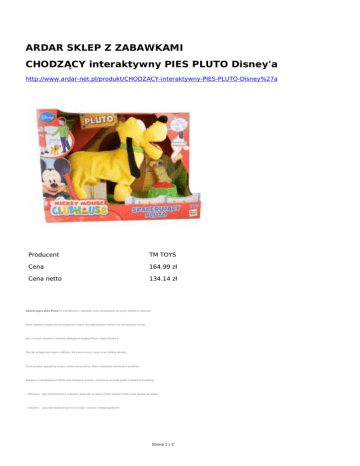 ARDAR SKLEP Z ZABAWKAMI CHODZĄCY interaktywny PIES PLUTO Disney'a http://www.ardar-net.pl/produkt/CHODZACY-interaktywny-PIES-PLUTO-Disney%27a Producent TM TOYS Cena 164.99 zł Cena netto 134.14 zł Spacerujący pies Pluto to interaktywna zabawka, która przypadnie do gustu każdemu dziecku! Pluto idealnie nadaje się na przyjaciela nawet dla najmłodszych dzieci (od 18 miesiąca życia). Jest uroczym pieskiem idealnie oddającym wygląd Pluta z bajki Disney'a. Tak jak w bajce jest koloru żółtego. Ma czarne uszy i ogon oraz zieloną obrożę. Pluto posiada specjalną smycz, zakończoną kością, która umożliwia sterowanie pieskiem. Zabawa z interaktywnym Pluto jest niezwykle prosta - wystarczy wcisnąć jeden z dwóch przycisków: - czerwony - gdy przytrzymamy czerwony przycisk na pilocie Pluto będzie chodził oraz wesoło szczekał. - niebieski - psiaczek będzie kręcił się na boki i wesoło merdał ogonkiem. Strona 1 z 2 Pluto chodzi, zatrzymuje się, szczeka i macha ogonem! ZAWARTOŚĆ: - interaktywny pies Pluto, - miska z jedzeniem, - smycz z pilotem w kształcie kości. WIEK: 1,5 + WYMIARY: opakowania: 39 x 30 x 16 cm Pluto: 33 x 28 x 13 cm ZASILANIE: 3 x bateria LR6 (AA) 1,5 V - załączone baterie testowe UWAGI: Nieodpowiednie dla dzieci poniżej 18 miesiąca życia. Przed udostępnieniem zabawki dziecku, usuń opakowanie, wszelkie elementy mocujące oraz zabezpieczenia. Należy zachować opakowanie na przyszłość, ponieważ zawiera ono bardzo istotne informacje. Strona 2 z 2