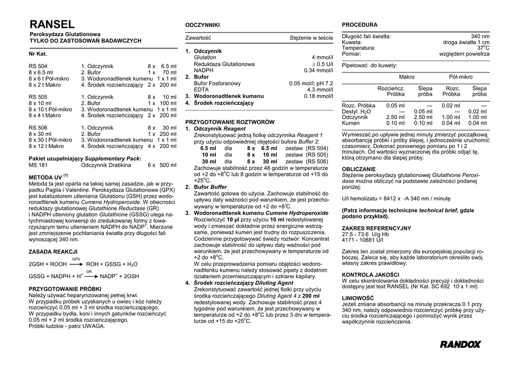 RANSEL ODCZYNNIKI Peroksydaza Glutationowa TYLKO DO ZASTOSOWAŃ BADAWCZYCH Zawartość Nr Kat. RS 504 8 x 6.5 ml 8 x 6 t Pół-mikro 8 x 2 t Makro 1. Odczynnik 8 x 6.5 ml 2. Bufor 1 x 70 ml 3. Wodoronadtlenek kumenu 1 x 1 ml 4. Środek rozcieńczający 2 x 200 ml RS 505 8 x 10 ml 8 x 10 t Pół-mikro 8 x 4 t Makro 1. Odczynnik 8 x 10 ml 2. Bufor 1 x 100 ml 3. Wodoronadtlenek kumenu 1 x 1 ml 4. Środek rozcieńczający 2 x 200 ml RS 506 8 x 30 ml 8 x 30 t Pół-mikro 8 x 12 t Makro 1. Odczynnik 8 x 30 ml 2. Bufor 1 x 250 ml 3. Wodoronadtlenek kumenu 1 x 1 ml 4. Środek rozcieńczający 4 x 200 ml Pakiet uzupełniający Supplementary Pack: MS 181 Odczynnik Drabkina 6 x 500 ml (1) METODA UV Metoda ta jest oparta na takiej samej zasadzie, jak w przypadku Paglia i Valentine. Peroksydaza Glutationowa (GPX) jest katalizatorem utleniania Glutationu (GSH) przez wodoronadtlenek kumenu Cumene Hydroperoxide. W obecności reduktazy glutationowej Glutathione Reductase (GR) i NADPH utleniony glutation Glutathione (GSSG) ulega natychmiastowej konwersji do zredukowanej formy z towa+ rzyszącym temu utlenieniem NADPH do NADP . Mierzone jest zmniejszenie pochłaniania światła przy długości fali wynoszącej 340 nm. ZASADA REAKCJI GPX 2GSH + ROOH ROH + GSSG + H2O + GSSG + NADPH + H GR + NADP + 2GSH PRZYGOTOWANIE PRÓBKI NaleŜy uŜywać heparynizowanej pełnej krwi. W przypadku próbek uzyskanych u owiec i kóz naleŜy rozcieńczyć 0.05 ml + 3 ml środka rozcieńczającego; W przypadku bydła, koni i innych gatunków rozcieńczyć 0.05 ml + 2 ml środka rozcieńczającego. Próbki ludzkie - patrz UWAGA. 1. Odczynnik Glutation Reduktaza Glutationowa NADPH 2. Bufor Bufor Fosforanowy EDTA 3. Wodoronadtlenek kumenu 4. Środek rozcieńczający PROCEDURA StęŜenie w teście 4 mmol/l ≥ 0.5 U/l 0.34 mmol/l Długość fali światła: Kuweta: Temperatura: Pomiar: 340 nm droga światła 1 cm o 37 C względem powietrza Pipetować do kuwety: Makro 0.05 mol/l; pH 7.2 4.3 mmol/l 0.18 mmol/l PRZYGOTOWANIE ROZTWORÓW 1. Odczynnik Reagent Zrekonstytuować jedną fiolkę odczynnika Reagent 1 przy uŜyciu odpowiedniej objętości bufora Buffer 2: 6.5 ml dla 8 x 6.5 ml zestaw (RS 504) 10 ml dla 8 x 10 ml zestaw (RS 505) 30 ml dla 8 x 30 ml zestaw (RS 506) Zachowuje stabilność przez 48 godzin w temperaturze o od +2 do +8 C lub 8 godzin w temperaturze od +15 do o +25 C. 2. Bufor Buffer Zawartość gotowa do uŜycia. Zachowuje stabilność do upływu daty waŜności pod warunkiem, Ŝe jest przechowywany w temperaturze od +2 do +8°C. 3. Wodoronadtlenek kumenu Cumene Hydroperoxide Rozcieńczyć 10 µl przy uŜyciu 10 ml redestylowanej wody i zmieszać dokładnie przez energiczne wstrząsanie, poniewaŜ kumen jest trudny do rozpuszczenia. Codziennie przygotowywać świeŜy roztwór. Koncentrat zachowuje stabilność do upływu daty waŜności pod warunkiem, Ŝe jest przechowywany w temperaturze od o +2 do +8 C. W celu przeprowadzenia pomiaru objętości wodoronadtlenku kumenu naleŜy stosować pipety z dodatnim działaniem przemieszczającym i szklane kapilary. 4. Środek rozcieńczający Diluting Agent Zrekonstytuować zawartość jednej fiolki przy uŜyciu środka rozcieńczającego Diluting Agent 4 z 200 ml redestylowanej wody. Zachowuje stabilność przez 4 tygodnie pod warunkiem, Ŝe jest przechowywany w o temperaturze od +2 do +8 C lub przez 3 dni w temperao turze od +15 do +25 C. Rozc. Próbka Destyl. H2O Odczynnik Kumen Pół-mikro Rozcieńcz. Próbka Ślepa próba Rozc. Próbka Ślepa próba 0.05 ml --2.50 ml 0.10 ml --0.05 ml 2.50 ml 0.10 ml 0.02 ml --1.00 ml 0.04 ml --0.02 ml 1.00 ml 0.04 ml Wymieszać,po upływie jednej minuty zmierzyć początkową absorbancję próbki i próby ślepej, i jednocześnie uruchomić czasomierz. Dokonać ponownego pomiaru po 1 i 2 minutach. Od wartości wyznaczonej dla próbki odjąć tę, którą otrzymano dla ślepej próby. OBLICZANIE StęŜenie peroksydazy glutationowej Glutathione Peroxidase moŜna obliczyć na podstawie zaleŜności podanej poniŜej: U/l hemolizatu = 8412 x -A 340 nm / minutę (Patrz informacje techniczne technical brief, gdzie podano przykład). ZAKRES REFERENCYJNY 27.5 - 73.6 U/g Hb 4171 - 10881 U/l Zakres ten został zmierzony dla europejskiej populacji roboczej. Zaleca się, aby kaŜde laboratorium określiło swój własny zakres prawidłowy. KONTROLA JAKOŚCI W celu skontrolowania dokładności precyzji i dokładności dostępny jest test RANSEL (Nr Kat. SC 692 10 x 1 ml) LINIOWOŚĆ JeŜeli zmiana absorbancji na minutę przekracza 0.1 przy 340 nm, naleŜy odpowiednio rozcieńczyć próbkę przy uŜyciu środka rozcieńczającego i pomnoŜyć wynik przez współczynnik rozcieńczenia. abc INSTRUKCJA - RANSEL - RS 504 (2,3) UWAGA W przypadku uŜywania pełnej, heparynizowanej krwi ludzkiej, do jej rozcieńczania zaleca się uŜycia odczynnika Drabkina. Wynika to z obecności peroksydaz w krwi ludzkiej, co moŜe dać fałszywie podwyŜszone wyniki, a dodanie cyjanku powoduje wyeliminowanie tego dodatniego zakłócenia. JednakŜe rozcieńczenie krwi przy uŜyciu środka rozcieńczającego (roztwór 4) jest niezbędne przed dodaniem odczynnika Drabkina w celu spowodowania przemiany glutationu w postać zredukowaną. Wynika to z tego, Ŝe cyjanek w formie utlenionej szybko prowadzi do inaktywacji. Metoda opisana poniŜej jest zalecana przy uŜyciu odczynnika Drabkina o podwójnej mocy (Nr Kat. MS 181): Przygotowanie: Rozcieńczyć zawartość jednej fiolki odczynnika Drabkina przy uŜyciu 480 ml wody redestylowanej. Przechowywać w taki sposób, aby zabezpieczyć go przed światłem. Zachowuje stabilność przez 6 miesięcy lub do upływu terminu waŜności, w zaleŜności od tego, co nastąpi wcześniej, pod warunkiem, Ŝe jest przechowywany o w temperaturze od +15 do +25 C. Strona 2 / 2 Roztwór 3 jest szkodliwy, jeŜeli zostanie połknięty lub dostanie się do organizmu w postaci wziewnej. Powoduje on podraŜnienie i jest łatwopalny. Roztwór Drabkina z