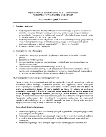 Ogólnokształcąca Szkoła Baletowa im. R. Turczynowicza PRZEDMIOTOWE ZASADY OCENIANIA Język angielski, język francuski I. Podstawy prawne: 1. Rozporządzenie Ministra Kultury i Dziedzictwa Narodowego w sprawie warunków i sposobu oceniania, klasyfikowania i promowania uczniów oraz przeprowadzania sprawdzianów i egzaminów w publicznych szkołach i placówkach artystycznych z dnia 8 kwietnia 2008 r. (Dz. U. Nr 65, poz. 400). 2. Rozporządzenie MEN z dnia 23 grudnia 2008 roku w sprawie podstawy programowej wychowania przedszkolnego oraz kształcenia ogólnego w poszczególnych typach szkół, opublikowane w dniu 15 stycznia 2009 r. w Dz. U. nr 4, poz.17. 3. Wewnątrzszkolny System Oceniania. II. Szczegółowe cele edukacyjne 1. rozwijanie i integracja sprawności językowych: słuchania, mówienia, czytania, pisania, 2. poszerzanie wiedzy ogólnej, 3. przygotowanie do egzaminu gimnazjalnego i maturalnego (poziom podstawowy i poziom rozszerzony), 4. doskonalenie umiejętności samodzielnego uczenia się, 5. umożliwienie uczniom rozwoju w jak najlepszych warunkach w zależności od ich możliwości, ze szczególnym uwzględnieniem uczniów o specyficznych trudnościach w uczeniu się, takimi jak dysleksja, dysortografia lub dysgrafia. III. Wymagania w zakresie sprawności językowych Uczeń oceniany jest na podstawie czterech sprawności językowych: rozumienie ze słuchu, rozumienie tekstu pisanego, wypowiedź pisemna, oraz wypowiedź ustna. Nauczyciel może wykorzystać następujące formy sprawdzania wiedzy: praca klasowa (min. 45 min), sprawdzian/test (max. 45 min), kartkówka (max. 15 minut, na podstawie materiału z ostatnich 3 lekcji), wypowiedź ustna, rozumienie ze słuchu, rozumienie tekstu pisanego, wypowiedź pisemna, prezentacja, praca domowa, aktywność bądź zeszyt. W semestrze musi odbyć się minimum jedna praca klasowa lub sprawdzian/test. Nauczyciel zobowiązany jest przedstawić wymagania edukacyjne na pierwszych zajęciach roku szkolnego, w tym określić kategorie, za które w danym roku szkolnym będą wystawiane oceny w danej klasie oraz ich wagę. Rozumienie tekstu słuchanego: 1. rozumienie ogólnego sensu oraz intencji prostych wypowiedzi osób posługujących się językiem jako macierzystym, 2. rozumienie sensu prostych, autentycznych wypowiedzi w różnych warunkach odbioru, 3. wyszukiwanie informacji szczegółowych w nieskomplikowanych wypowiedziach i dialogach, 4. rozumienie ogólnego sensu prostych wypowiedzi zawierających niezrozumiałe elementy, których znaczenia uczeń może się domyślić. Wypowiedź ustna: 1. uzyskiwanie i udzielanie informacji dotyczących dnia codziennego, 2. formułowanie w miarę płynnych, krótkich i spójnych wypowiedzi na określone tematy, 3. posługiwanie się odpowiednimi środkami językowymi dla wyrażenia intencji, uczuć, emocji w sytuacjach życia codziennego, 4. poprawne językowo i logiczne wyrażanie myśli i opinii na określone tematy, 5. relacjonowanie wypowiedzi innych osób, 6. właściwa reakcja językowa na wypowiedź rozmówcy oraz stosowanie rutynowych zachowań językowych, 7. inicjowanie i podtrzymywanie prostej rozmowy, 8. prowadzenie prostych negocjacji w sytuacjach życia codziennego, 9. opanowanie wymowy w stopniu zapewniającym zrozumiałość wypowiedzi osób posługującym się tym językiem jako macierzystym. Rozumienie tekstu pisanego: 1. 2. 3. 4. 5. rozumienie powszechnie spotykanych dokumentów i tekstów autentycznych, rozumienie prostego tekstu narracyjnego, rozumienie ogólnego sensu prostego tekstu przy czytaniu pobieżnym, rozumienie ogólnego sensu tekstu, który zawiera elementy niezrozumiałe, wyszukiwanie konkretnych informacji z częściowo niezrozumiałego tekstu. Wypowiedź pisemna: 1. 2. 3. 4. sformułowanie i zapisanie własnego oraz otrzymanego prostego komunikatu, napisanie prostego tekstu użytkowego, napisanie streszczenia prostego tekstu, stosowanie właściwego słownictwa, struktur leksykalno-gramatycznych i zasad ortografii w prostych tekstach. Inne umiejętności – korzystanie ze słownika jedno- i dwujęzycznego oraz innych źródeł informacji, w tym również elektronicznych. IV. Sprawdzanie postępów uczniów 1. Sprawdzanie stopnia opanowania czterech sprawności językowych oraz gramatyki i leksyki przeprowadza się za pomocą następujących form kontroli: a) PRACA KLASOWA praca samodzielna w formie pisemnej obejmująca wiadomości i umiejętności z co najmniej jednego działu, trwająca min. 45 min, zapowiedziana z przynajmniej tygodniowym wyprzedzeniem, prace klasowe są obowiązkowe i w przypadku, gdy uczeń z przyczyn losowych nie może pisać pracy z całą klasą, powinien uczynić to na pierwszej lekcji od powrotu do szkoły na warunkach określonych przez nauczyciela. b) SPRAWDZIAN / TEST praca samodzielna w formie pisemnej obejmująca wiadomości i umiejętności z co najmniej jednego działu, trwająca max. 45 min, zapowiedziana z przynajmniej tygodniowym wyprzedzeniem, sprawdziany / testy są obowiązkowe i w przypadku, gdy uczeń z przyczyn losowych nie może pisać pracy z całą klasą, powinien uczynić to na pierwszej lekcji od powrotu do szkoły na warunkach określonych przez nauczyciela. c) KARTKÓWKA praca samodzielna na lekcji w formie pisemnej obejmująca zakres do 3 ostatnich tematów realizowanego materiału, która trwa około 15 minut i nie musi być zapowiedziana przez nauczyciela. Nauczyciele stosują odpowiednie typy zadań / techniki do testowania poszczególnych sprawności w zależności od poziomu grupy uczniów. d) WYDPOWIEDŹ USTNA sprawdzenie wiadomości i umiejętności ucznia w formie ustnej odpowiedzi, która może być niezapowiedziana (do trzech ostatnich tematów) lub zapowiedziana (z większej partii materiału). e) ROZUMIENIE ZE SŁUCHU praca samodzielna na lekcji, polegająca na udzieleniu odpowiedzi na pytania zadane przez nauczyciela, w oparciu o tekst, który uczniowie usłyszą na zajęciach. f) ROZUMIEN