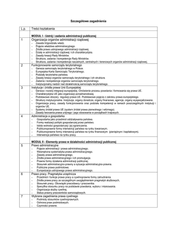 Szczegółowe zagadnienia L.p. Treści kształcenia MODUŁ I - Ustrój i zadania administracji publicznej 1 Organizacja organów administracji rządowej ˗ ˗ ˗ ˗ ˗ ˗ ˗ Zasada trójpodziału władz. Pojęcie władztwa administracyjnego. Źródła prawa ustrojowego administracji rządowej. Działy w administracji rządowej i ich charakterystyka. Zasady kreacji Rady Ministrów. Struktura, zadania i kompetencje Rady Ministrów. Struktura, zadania i kompetencje naczelnych, centralnych i terenowych organów administracji rządowej. 2 Funkcjonowanie samorządu terytorialnego 3 Instytucje i źródła prawa Unii Europejskiej ˗ ˗ ˗ ˗ ˗ ˗ ˗ ˗ ˗ ˗ ˗ ˗ ˗ Geneza samorządu terytorialnego w Polsce. Europejska Karta Samorządu Terytorialnego. Podziały terytorialne państwa. Zasady kreacji organów samorządu terytorialnego i ich struktura. Zadania i kompetencje organów samorządu terytorialnego. Instytucjonalny nadzór nad działalnością samorządu terytorialnego. Geneza i rozwój integracji europejskiej. Omówienie procesu powstania i formowania się prawa UE. Charakterystyka UE jako organizacji ponadnarodowej. Podstawowe obszary regulacji prawa UE. Podstawowe pojęcia z zakresu prawa europejskiego. Struktury instytucjonalne. Instytucje, organy doradcze, organy finansowe, agencje, organy wyspecjalizowane. Organizacja pracy, zasady funkcjonowania oraz podziału kompetencji w ramach poszczególnych instytucji i organów UE. Systemy źródeł prawa UE (system źródeł prawa pierwotnego i wtórnego). Zasady tworzenia prawa unijnego i jego stosowania w porządkach krajowych. 4 Administracja a gospodarka 5 MODUŁ II - Elementy prawa w działalności administracji publicznej Prawo administracyjne 6 Prawo pracy. Pragmatyka urzędnicza 7 Wybrane zagadnienia prawa cywilnego ˗ ˗ ˗ ˗ ˗ ˗ ˗ ˗ ˗ ˗ ˗ ˗ ˗ ˗ ˗ ˗ ˗ ˗ ˗ ˗ ˗ ˗ ˗ Gospodarka jako przedmiot oddziaływania państwa. Formy realizacji polityki gospodarczej przez państwo. Istota wolności gospodarczej i jej ograniczenia. Publicznoprawne formy interwencji państwa na rynku towarowym. Publicznoprawne formy interwencji państwa na rynku finansowym (pieniężnym i kapitałowym). Interwencja państwa na rynku pracy. Pojęcie administracji i prawa administracyjnego. Wewnętrzna systematyka prawa administracyjnego. Zasady prawa administracyjnego. Źródła prawa administracyjnego i ich promulgacja. Prawne formy działania administracji publicznej. Stosunek administracyjno-prawny a sytuacja administracyjno-prawna. Publiczne prawa podmiotowe; Europeizacja ustrojowego prawa administracyjnego. Przedmiot i funkcje prawa pracy a cywilnoprawne formy zatrudnienia. Źródła prawa pracy ze szczególnym uwzględnieniem pragmatyk służbowych, Stosunek pracy. Obowiązki pracodawcy i pracownika. Specyfika stosunku pracy na podstawie powołania, wyboru i mianowania. Organizacja służby cywilnej. Status prawny pracowników samorządowych. Podmioty stosunków cywilnoprawnych. Ochrona praw podmiotowych. Czynności prawne. ˗ ˗ ˗ ˗ ˗ 8 Przedstawicielstwo, Upływ czasu w prawie cywilnym. Własność i ochrona własności. Prawa rzeczowe ograniczone. Umowy w obrocie cywilnoprawnym. Prawo zagospodarowania przestrzeni ˗ ˗ ˗ ˗ ˗ Uwarunkowania prawne planowania i zagospodarowania przestrzennego. System aktów planowania przestrzennego. Studium uwarunkowań i kierunków zagospodarowania przestrzennego oraz miejscowy plan zagospodarowania przestrzennego. Wybrane zagadnienia prawa budowlanego. Publicznoprawna ingerencja w prawo własności nieruchomości. 9 Elementy prawa energetycznego i prawa ochrony środowiska 10 Prawo zamówień publicznych 11 Wybrane zagadnienia prawa karnego ˗ Co to jest przestępstwo i wykroczenie. ˗ Wina w prawie karnym i okoliczności wyłączające winę. ˗ Okoliczności wyłączające bezprawność czynu. ˗ Kary zasadnicze i środki karne. ˗ ˗ ˗ ˗ ˗ ˗ ˗ ˗ ˗ ˗ ˗ ˗ ˗ ˗ ˗ Dyrektywy unijne dotyczące energetyki oraz ochrony środowiska. Obowiązujące w Polsce prawo w zakresie energetyki oraz ochrony środowiska. Projekty ustaw dotyczących prawa energetycznego, odnawialnych źródeł energii oraz prawa gazowego. Koszty wdrożenia pakietu klimatyczno – energetycznego dla gospodarki Polski. Ustawy dotyczące emisji przemysłowych i gospodarcze skutki wdrożenia dyrektywy EID. Efektywność energetyczna w prawie UE oraz w prawie krajowym. Zasady naczelne zamówień publicznych. Charakterystyka prawa zamówień publicznych. Procedury udzielania zamówień publicznych. Dokumentowanie czynności postępowania. Kontrola i nadzór w prawie zamówień publicznych. Zasady odpowiedzialności karnej za przestępstwa i wykroczenia. Tryby ścigania przestępstw publicznoskargowych, prywatnoskargowych i ściganych na wniosek pokrzywdzonego. Rodzajowe przedmioty ochrony i kategorie czynów zabronionych. Organizacja i funkcjonowanie aparatu przymusu i organów wymiaru sprawiedliwości. MODUŁ III- Finanse publiczne i prawo finansowe 12 Prawo finansowe 13 Finanse publiczne. Budżet 14 Audyt i rachunkowość zarządcza w instytucjach publicznych ˗ ˗ ˗ ˗ ˗ ˗ ˗ ˗ ˗ ˗ ˗ ˗ ˗ ˗ ˗ ˗ ˗ ˗ Źródła prawa finansowego. Podmioty prawa finansowego. Prawo budżetowe. Prawo podatkowe. Pojęcie podatku, opłaty i dopłaty.. System podatków i opłat w Polsce. Organy podatkowe. Podstawowe zagadnienia prawa dewizowego i elementy prawa celnego. Publiczne prawo bankowe. Regulacja prawna finansów publicznych. System finansów publicznych. Charakter środków publicznych. Organizacja sektora finansów publicznych w Polsce. Dyscyplina finansów publicznych. Kontrola zarządcza w jednostkach sektora finansów publicznych. Podstawy tworzenia i wykonywania budżetu. Budżet państwa, budżet środków europejskich oraz Wieloletni Plan Finansowy Państwa. Gospodarka finansowa jednostek samorządu terytorialnego. Charakterystyka podatków i opłat lokalnych. Audyt wewnętrzny w sektorze finansów publicznych. Standard