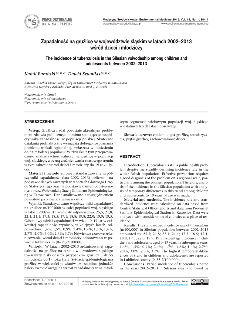 Medycyna Środowiskowa - Environmental Medicine 2015, Vol. 18, No. 1, 38-44 www.environmental-medicine-journal.eu www.medycynasrodowiskowa.pl Zapadalność na gruźlicę w województwie śląskim w latach 2002–2013 wśród dzieci i młodzieży The incidence of tuberculosis in the Silesian voivodeship among children and adolescents between 2002–2013 Kamil Barański (a, b, c), Dawid Szumilas (a, b, c) Katedra i Zakład Epidemiologii, Śląski Uniwersytet Medyczny w Katowicach Kierownik Katedry i Zakładu: Prof. dr hab. n. med. J. E. Zejda zgromadzenie danych zgromadzenie piśmiennictwa (c) przygotowanie i edycja manuskryptu (a) (b) StrESzczENiE Wstęp. Gruźlica nadal pozostaje aktualnym problemem zdrowia publicznego pomimo spadającego współczynnika zapadalności w populacji polskiej. Skuteczne działania profilaktyczne wymagają dobrego rozpoznania problemu w skali regionalnej, zwłaszcza w odniesieniu do najmłodszej populacji. W związku z tym przeprowadzono analizę zachorowalności na gruźlicę w populacji woj. śląskiego, z oceną zróżnicowania czasowego trendu w tym zakresie wśród dzieci i młodzieży do 19 roku życia. Materiał i metody. Surowe i standaryzowane współczynniki zapadalności (lata 2002–2013) obliczono na podstawie danych zawartych w raportach Głównego Urzędu Statystycznego oraz na podstawie danych udostępnionych przez Wojewódzką Stację Sanitarno-Epidemiologiczną w Katowicach. Dane analizowano z uwzględnieniem powiatów jako miejsca zamieszkania. Wyniki. Standaryzowane współczynniki zapadalność na gruźlicę (n/100 000) w całej populacji woj. śląskiego w latach 2002–2013 wyniosły odpowiednio: 25,5; 21,8; 22,1; 21,1; 17,3; 18,5; 17,1; 18,8; 19,8; 22,0; 19,9; 19,5. Odsetkowy udział zapadalności w wieku 0–19 lat w całkowitej zapadalności wyniosły, w kolejnych latach, odpowiednio: 1,4%; 1,5%; 0,9%; 2,4%; 1,7%; 1,8%; 1,4%; 2,7%; 2,0%; 3,0%; 2,3%; 3,7% Największe czasowe zróżnicowanie, wśród dzieci i młodzieży odnotowano w powiecie lublinieckim (0–35,2/100 000). Wnioski. W latach 2002–2013 zróżnicowanej zapadalności na gruźlicę na terenie województwa śląskiego towarzyszy niski odsetek przypadków gruźlicy u dzieci i młodzieży do 19 roku życia. Sytuacja epidemiologiczna gruźlicy w większości powiatów jest stabilna, jednakże należy zwrócić uwagę na wzrost zapadalności w najmłodNadesłano: 20.10.2014 Zatwierdzono do druku: 16.01.2015 szym segmencie wiekowym populacji woj. śląskiego w ostatnich trzech latach obserwacji. Słowa kluczowe: epidemiologia gruźlicy, standaryzacja, prątki gruźlicy, zachorowalność dzieci AbStrAct Introduction. Tuberculosis is still a public health problem despite the steadily declining incidence rate in the wider Polish population. Effective prevention requires a good diagnosis of the problem on a regional scale, particularly among the younger population. Therefore, analysis of the incidence in the Silesian population with analysis of temporary differences in this trend among children and adolescents to 19 years of age was made. Material and methods. The incidence rate and standardized incidence were calculated on data based from Central Statistical Office reports and data from Provincial Sanitary Epidemiological Station in Katowice. Data were analyzed with consideration of counties as a place of residence. Results. The standardized incidence rate of tuberculosis (n/100,000) in Silesian population between 2002–2013 amounted to: 25.5; 21.8; 22.1; 21.1; 17.3; 18.5; 17.1; 18.8; 19.8; 22.0; 19.9; 19.5. Percentage incidence in children and adolescents aged 0–19 years in subsequent years: 1.4%; 1.5%; 0.9%; 2.4%; 1.7%; 1.8%; 1.4%; 2.7%; 2.0%; 3.0%; 2.3%; 3.7%. The highest temporary differences of trend in children and adolescents are reported in Lubliniec county (0–35.2/100,000). Conclusions. Varied incidence of tuberculosis noted in the years 2002–2013 in Silesian area is followed by Niniejszy materiał jest udostępniony na licencji Creative Commons – Uznanie autorstwa 3.0 PL. Pełne postanowienia tej licencji są dostępne pod: http://creativecommons.org/licenses/by/3.0/pl/legalcode Medycyna Środowiskowa - Environmental Medicine 2015, Vol. 18, No. 1 Kamil Barański, Dawid Szumilas: Zapadalność na gruźlicę wśród dzieci i młodzieży low percentage of tuberculosis cases in children and adolescents aged 0–19 years. The epidemiological situation of tuberculosis in most counties is stable. However, the increasing incidence in the youngest segment of the Sile- WStęp Zapadalność na gruźlicę w ujęciu globalnym jest bardzo zróżnicowana i można ją podzielić ze względu na obszary występowania. Najwięcej ludzi z powodu tej choroby umiera w krajach trzeciego świata, natomiast uwzględniając obszar Europy, najwyższą zapadalność odnotowano na Ukrainie, Mołdawii oraz Rosji 75–92/100 000. Mniejszy wskaźnik zapadalności zaobserwowano w Europie Środkowej w krajach takich jak Polska czy Słowenia, gdzie współczynnik ten wynosi od 18 do 26 przypadków na 100 tys. ludzi. Najmniejszą zapadalność odnotowano we Włoszech, Niemczech, Danii, Francji oraz Wielkiej Brytanii w których współczynnik ten utrzymuje się w zakresie od 7 do 10 przypadków na 100 tys. ludzi [1]. Gruźlica wśród dzieci stanowi istotny problem medyczny bowiem zachorowania w tej grupie wiekowej odzwierciedlają sytuację epidemiologiczną gruźlicy w populacji osób dorosłych. W 1990 roku Światowa Organizacja Zdrowia (WHO) oszacowała, że w ujęciu globalnym 650 tys. dzieci zachorowało na gruźlicę [2]. Obecnie liczba ta kształtuje się na stałym poziomie 530 tys. dzieci rocznie z czego 74 tys. dzieci umiera [3]. Aktualne dane epidemiologiczne wskazują na wzrastające ryzyko zachorowania na gruźlicę w Polsce. Opublikowany przez WHO raport w 2013 roku wskazał, że w Polsce w 2011 roku na gruźlicę zachorowało 111 dzieci w wieku do 15 roku życia, natomiast od 15 d