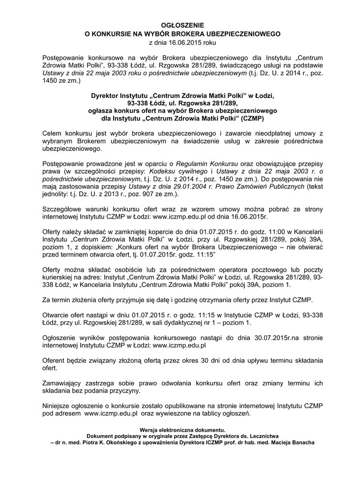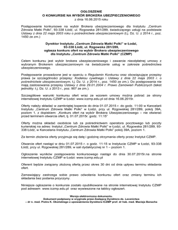 OGŁOSZENIE O KONKURSIE NA WYBÓR BROKERA UBEZPIECZENIOWEGO z dnia 16.06.2015 roku Postępowanie konkursowe na wybór Brokera ubezpieczeniowego dla Instytutu „Centrum Zdrowia Matki Polki”, 93-338 Łódź, ul. Rzgowska 281/289, świadczącego usługi na podstawie Ustawy z dnia 22 maja 2003 roku o pośrednictwie ubezpieczeniowym (t.j. Dz. U. z 2014 r., poz. 1450 ze zm.) Dyrektor Instytutu „Centrum Zdrowia Matki Polki” w Łodzi, 93-338 Łódź, ul. Rzgowska 281/289, ogłasza konkurs ofert na wybór Brokera ubezpieczeniowego dla Instytutu „Centrum Zdrowia Matki Polki” (CZMP) Celem konkursu jest wybór brokera ubezpieczeniowego i zawarcie nieodpłatnej umowy z wybranym Brokerem ubezpieczeniowym na świadczenie usług w zakresie pośrednictwa ubezpieczeniowego. Postępowanie prowadzone jest w oparciu o Regulamin Konkursu oraz obowiązujące przepisy prawa (w szczególności przepisy: Kodeksu cywilnego i Ustawy z dnia 22 maja 2003 r. o pośrednictwie ubezpieczeniowym, t.j. Dz. U. z 2014 r., poz. 1450 ze zm.). Do postępowania nie mają zastosowania przepisy Ustawy z dnia 29.01.2004 r. Prawo Zamówień Publicznych (tekst jednolity: t.j. Dz. U. z 2013 r., poz. 907 ze zm.). Szczegółowe warunki konkursu ofert wraz ze wzorem umowy można pobrać ze strony internetowej Instytutu CZMP w Łodzi: www.iczmp.edu.pl od dnia 16.06.2015r. Oferty należy składać w zamkniętej kopercie do dnia 01.07.2015 r. do godz. 11:00 w Kancelarii Instytutu „Centrum Zdrowia Matki Polki” w Łodzi, przy ul. Rzgowskiej 281/289, pokój 39A, poziom 1, z dopiskiem: „Konkurs ofert na wybór Brokera Ubezpieczeniowego – nie otwierać przed terminem otwarcia ofert, tj. 01.07.2015r. godz. 11:15” Oferty można składać osobiście lub za pośrednictwem operatora pocztowego lub poczty kurierskiej na adres: Instytut „Centrum Zdrowia Matki Polki” w Łodzi, ul. Rzgowska 281/289, 93338 Łódź, w Kancelaria Instytutu „Centrum Zdrowia Matki Polki” pokój 39A, poziom 1. Za termin złożenia oferty przyjmuje się datę i godzinę otrzymania oferty przez Instytut CZMP. Otwarcie ofert nastąpi w dniu 01.07.2015 r. o godz. 11:15 w Instytucie CZMP w Łodzi, 93-338 Łódź, przy ul. Rzgowskiej 281/289, w sali dydaktycznej nr 1 – poziom 1. Ogłoszenie wyników postępowania konkursowego nastąpi do dnia 30.07.2015r.na stronie internetowej Instytutu CZMP w Łodzi: www.iczmp.edu.pl Oferent będzie związany złożoną ofertą przez okres 30 dni od dnia upływu terminu składania ofert. Zamawiający zastrzega sobie prawo odwołania konkursu ofert oraz zmiany terminu ich składania bez podania przyczyny. Niniejsze ogłoszenie o konkursie zostało opublikowane na stronie internetowej Instytutu CZMP pod adresem www.iczmp.edu.pl oraz wywieszone na tablicy ogłoszeń. Wersja elektroniczna dokumentu. Dokument podpisany w oryginale przez Zastępcę Dyrektora ds. Lecznictwa – dr n. med. Piotra K. Okońskiego z upoważnienia Dyrektora ICZMP prof. dr hab. med. Macieja Banacha
