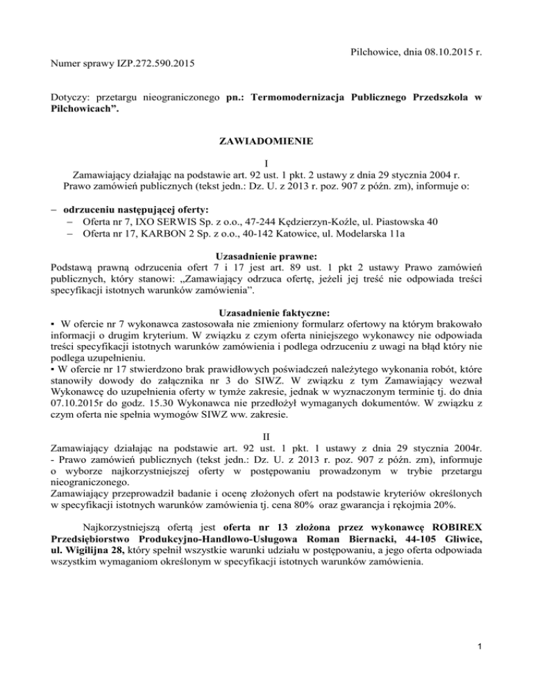 Pilchowice, dnia 08.10.2015 r. Numer sprawy IZP.272.590.2015 Dotyczy: przetargu nieograniczonego pn.: Termomodernizacja Publicznego Przedszkola w Pilchowicach”. ZAWIADOMIENIE I Zamawiający działając na podstawie art. 92 ust. 1 pkt. 2 ustawy z dnia 29 stycznia 2004 r. Prawo zamówień publicznych (tekst jedn.: Dz. U. z 2013 r. poz. 907 z późn. zm), informuje o: − odrzuceniu następującej oferty: − Oferta nr 7, IXO SERWIS Sp. z o.o., 47-244 Kędzierzyn-Koźle, ul. Piastowska 40 − Oferta nr 17, KARBON 2 Sp. z o.o., 40-142 Katowice, ul. Modelarska 11a Uzasadnienie prawne: Podstawą prawną odrzucenia ofert 7 i 17 jest art. 89 ust. 1 pkt 2 ustawy Prawo zamówień publicznych, który stanowi: „Zamawiający odrzuca ofertę, jeżeli jej treść nie odpowiada treści specyfikacji istotnych warunków zamówienia”. Uzasadnienie faktyczne: ▪ W ofercie nr 7 wykonawca zastosowała nie zmieniony formularz ofertowy na którym brakowało informacji o drugim kryterium. W związku z czym oferta niniejszego wykonawcy nie odpowiada treści specyfikacji istotnych warunków zamówienia i podlega odrzuceniu z uwagi na błąd który nie podlega uzupełnieniu. ▪ W ofercie nr 17 stwierdzono brak prawidłowych poświadczeń należytego wykonania robót, które stanowiły dowody do załącznika nr 3 do SIWZ. W związku z tym Zamawiający wezwał Wykonawcę do uzupełnienia oferty w tymże zakresie, jednak w wyznaczonym terminie tj. do dnia 07.10.2015r do godz. 15.30 Wykonawca nie przedłożył wymaganych dokumentów. W związku z czym oferta nie spełnia wymogów SIWZ ww. zakresie. II Zamawiający działając na podstawie art. 92 ust. 1 pkt. 1 ustawy z dnia 29 stycznia 2004r. - Prawo zamówień publicznych (tekst jedn.: Dz. U. z 2013 r. poz. 907 z późn. zm), informuje o wyborze najkorzystniejszej oferty w postępowaniu prowadzonym w trybie przetargu nieograniczonego. Zamawiający przeprowadził badanie i ocenę złożonych ofert na podstawie kryteriów określonych w specyfikacji istotnych warunków zamówienia tj. cena 80% oraz gwarancja i rękojmia 20%. Najkorzystniejszą ofertą jest oferta nr 13 złożona przez wykonawcę ROBIREX Przedsiębiorstwo Produkcyjno-Handlowo-Usługowa Roman Biernacki, 44-105 Gliwice, ul. Wigilijna 28, który spełnił wszystkie warunki udziału w postępowaniu, a jego oferta odpowiada wszystkim wymaganiom określonym w specyfikacji istotnych warunków zamówienia. 1 Wykonawcy, którzy złożyli oferty niepodlegające odrzuceniu: Nr ofe rty Oferent Adres Wartość oferty brutto Gwara ncja PKT Cena PKT Gwara ncja Suma pkt 1 2 3 4 5 6 7 8 43-300 Bielsko Biała; ul. PORTAL S.C. Dagmara Leszczyńska 65 Malmon-Lech, Paweł Lech 43-300 Bielsko Biała; ul. 1 F.H.U ELIOS Bogdan Malmon Leszczyńska 65 Przedsiębiorstwo budowlane 2 ELBUD J. Szymański Sp. j. 3 BAU Sp. z o.o. POL-KATO II F.H.U 4 Agnieszka Ciosek PrzedsiębiorstwoprodukcyjnoUsługowe AGROCOM Sp. z 5 o.o. F.H.U.B."ZABŁOCKI" Robert Zabłocki, PPHU Bogdan 6 Romanek Zakład Produkcyjno Remontowo Budowlany Artur 8 Marcinek Zakład RemontowoBudowlany MICRO-MAX 9 Sp.z o.o. 28-200 Staszów; ul. Towarowa 7E 42-152 Opatów; ul. Kuźniczka 1, do kontaktu 42-202 Częstochowa; ul. Wręczycka 11A lok 202 40-872 Katowice; ul. Zawiszy Czarnego 16a 41-303 Dąbrowa Górnicza,ul.Aleja Józefa Piłsudskiego 2 1 093 698,71 zł 60,00 60,64 10,00 70,64 1 121 822,25 zł 60,00 59,12 10,00 69,12 966 736,26 zł 120,00 68,61 20,00 88,61 1 061 748,89 zł 60,00 62,47 10,00 72,47 1 030 425,21 zł 60,00 64,37 10,00 74,37 33-334 Kamionka Wielka 343 lider konsorcjum, 33-340 Stary Sącz oś. 1000-lecia 4B/12 1 001 485,24 zł 72,00 66,23 12,00 78,23 44-373 Wodzisław Śląski,ul.Długa 61c 62,07 10,00 72,07 1 068 555,70 zł 60,00 44-194 Knurów, ul.1-goMaja 51 840 090,00 zł 120,00 78,95 Przedsiębiorstwo Produkcyjno10 Handlowe"OMNIX" Sp.z o.o. DOMTON mgr inż.. Andrzej 11 Wnuk Przedsiębiorstwo Usługowo Handlowe ECOMPLEX Grinspek Ewa, PERFECT12 BUD Sp. z o.o. ROBIREX Przedsiębiorstwo Produkcyjno-Handlowo13 Usługowa Roman Biernacki REMBUD Spółka z ograniczoną 14 odpowiedzialnością 41-811 Zabrze, ul.Jana Styki 24 44-144 Żernica, ul.Wrzosowa 3 44-282 ŁukówŚląski , ul.Lipowa 2c, 44-208 Rydułtowy, ul.Bohaterów Warszawy 13 Firma Remontowo-Budowlana 15 DAW-BUD Daniel Wywiał Firma Budowlana Adam 16 Czupryn 42-260 Kamienica Wielka, ul.Brzozowa 5A 44-190 Knurów, ul.Dworcowa 10A/316 860 998,77 zł 84,00 20,00 98,95 77,03 14,00 91,03 1 169 199,48 zł 120,00 56,73 902 291,53 zł 60,00 20,00 76,73 73,51 10,00 83,51 44-105 Gliwice, ul.Wigilijna 28 829 042,35 zł 120,00 80,00 20,00 100,00 44-203 Rybnik, ul.Sosnowa 7 952 363,98 zł 120,00 69,64 20,00 89,64 1 063 950,01 zł 72,00 62,34 12,00 74,34 1 401 345,72 zł 96,00 47,33 16,00 63,33 Zgodnie z art. 94 ustawy PZP podpisanie umowy nastąpi w terminie nie krótszym niż 5 dni od dnia przesłania zawiadomienia o wyborze najkorzystniejszej oferty. Jednocześnie na podstawie art. 27 ust. 2 ustawy PZP Zamawiający prosi o niezwłoczne potwierdzenie otrzymania niniejszego zawiadomienia. Przewodniczący Komisji Przetargowej Łukasz Gwóźdź 2