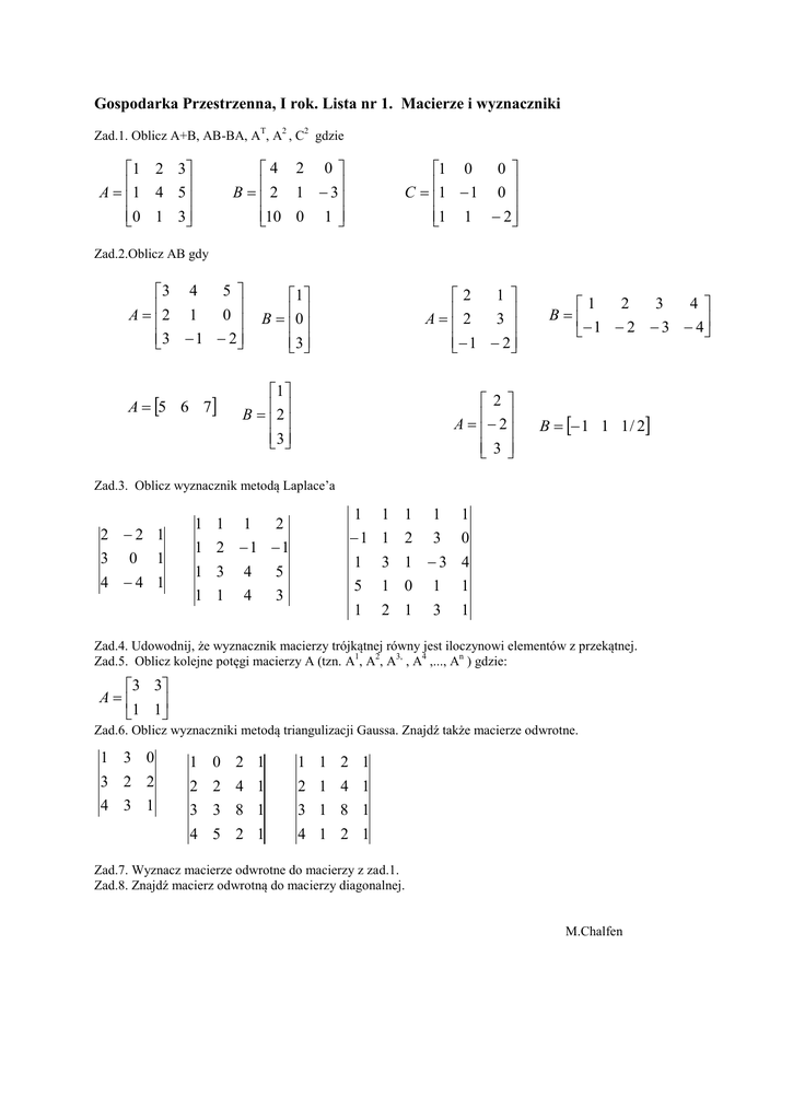 Gospodarka Przestrzenna, I rok. Lista nr 1. Macierze i wyznaczniki