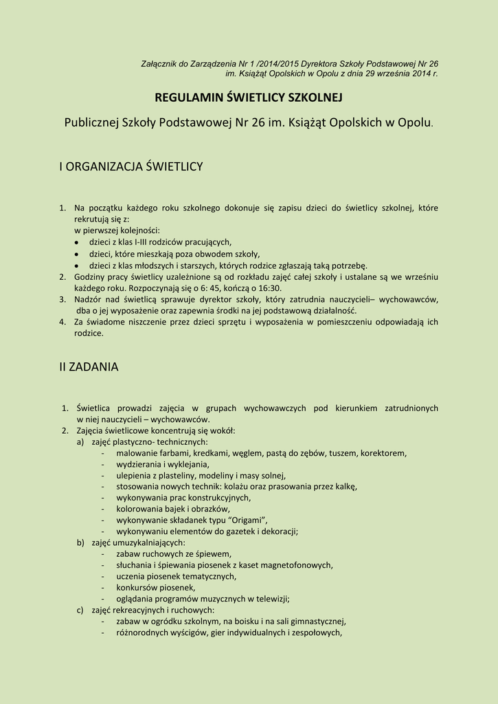 Załącznik do Zarządzenia Nr 1 /2014/2015 Dyrektora Szkoły Podstawowej Nr 26 im. Książąt Opolskich w Opolu z dnia 29 września 2014 r. REGULAMIN ŚWIETLICY SZKOLNEJ Publicznej Szkoły Podstawowej Nr 26 im. Książąt Opolskich w Opolu. I ORGANIZACJA ŚWIETLICY 1. Na początku każdego roku szkolnego dokonuje się zapisu dzieci do świetlicy szkolnej, które rekrutują się z: w pierwszej kolejności: dzieci z klas I-III rodziców pracujących, dzieci, które mieszkają poza obwodem szkoły, dzieci z klas młodszych i starszych, których rodzice zgłaszają taką potrzebę. 2. Godziny pracy świetlicy uzależnione są od rozkładu zajęć całej szkoły i ustalane są we wrześniu każdego roku. Rozpoczynają się o 6: 45, kończą o 16:30. 3. Nadzór nad świetlicą sprawuje dyrektor szkoły, który zatrudnia nauczycieli– wychowawców, dba o jej wyposażenie oraz zapewnia środki na jej podstawową działalność. 4. Za świadome niszczenie przez dzieci sprzętu i wyposażenia w pomieszczeniu odpowiadają ich rodzice. II ZADANIA 1. Świetlica prowadzi zajęcia w grupach wychowawczych pod kierunkiem zatrudnionych w niej nauczycieli – wychowawców. 2. Zajęcia świetlicowe koncentrują się wokół: a) zajęć plastyczno- technicznych: - malowanie farbami, kredkami, węglem, pastą do zębów, tuszem, korektorem, - wydzierania i wyklejania, - ulepienia z plasteliny, modeliny i masy solnej, - stosowania nowych technik: kolażu oraz prasowania przez kalkę, - wykonywania prac konstrukcyjnych, - kolorowania bajek i obrazków, - wykonywanie składanek typu “Origami”, - wykonywaniu elementów do gazetek i dekoracji; b) zajęć umuzykalniających: - zabaw ruchowych ze śpiewem, - słuchania i śpiewania piosenek z kaset magnetofonowych, - uczenia piosenek tematycznych, - konkursów piosenek, - oglądania programów muzycznych w telewizji; c) zajęć rekreacyjnych i ruchowych: - zabaw w ogródku szkolnym, na boisku i na sali gimnastycznej, - różnorodnych wyścigów, gier indywidualnych i zespołowych, - wycieczek po najbliższej okolicy, d) zajęć z mowy ojczystej: - swobodnych wypowiedzi dzieci na określony temat, - słuchanie i czytanie: bajek, wierszyków, opowiadań, lektur obowiązujących w nauczaniu zintegrowanym, czasopism dziecięcych oraz wybranych tekstów, - doskonalenie technik pisania przez konkursy ortograficzne, uzupełnianie zdań wyrazami lub wyrazów literami, - utrwalenie reguł ortograficznych, - rozwiązywanie różnorodnych: krzyżówek, rebusów, zagadek, łamigłówek; e) gier i zabaw świetlicowych: - zabaw bieżnych, skocznych, rzutnych, orientacyjno- porządkowych, - zabaw ze śpiewem, ludowych wyliczanek, - zabaw relaksacyjnych, - zabaw i gier świetlicowych różnego typu; f) zajęć graficzno – motorycznych: - ćwiczeń z percepcji wzrokowej lub słuchowej, - ćwiczeń z percepcji wzrokowo – słuchowej, g) stałej opieki i przygotowania do zajęć z nauczania zintegrowanego lub blokowego: - odrabiania zadań domowych, - otaczanie dzieci opieką podczas pobytu w świetlicy. III ZAPEWNIENIE BEZPIECZEŃSTWA 1. Pracujący wychowawcy zapewniają bezpieczeństwo podczas zajęć, dlatego dzieci nie mogą samowolnie opuszczać świetlicy. Na każde wyjście ze świetlicy powinna być uzyskana zgoda wychowawcy. 2. Dzieci z klas I przyprowadza do świetlicy wychowawca lub nauczyciel po ostatnich zajęciach, natomiast z pozostałych klas obowiązane są przyjść samodzielnie bezpośrednio po zajęciach lekcyjnych. 3. Dzieci odbierane są ze świetlicy przez rodziców, rodzeństwo, lub wyznaczoną przez rodziców pisemnie osobę. 4. Rodzice uczniów, którzy udają się do domu samodzielnie, obowiązani są dostarczyć na to pisemną zgodę z uwzględnieniem godziny zwolnienia dziecka do domu. IV POSTANOWIENIE KOŃCOWE 1. Nauczyciele zatrudnieni w świetlicy zobowiązani są do: - składania sprawozdania z jej działalności na radach pedagogicznych podsumowujących I i II semestr, - dbanie o estetykę pomieszczenia, - zapewnienia radosnej atmosfery w czasie zajęć w celu likwidowania napięć i stresów u dzieci. 2. Dzieci obowiązuje: - kulturalne zachowanie się, - utrzymywanie porządku wokół siebie, - wykonywanie poleceń wychowawcy, - koleżeńska postawa wobec innych.