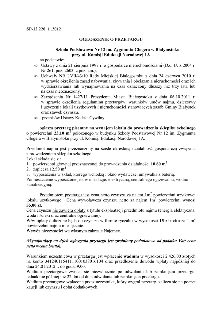 SP-12.220. 1 .2012 OGŁOSZENIE O PRZETARGU • • • • Szkoła Podstawowa Nr 12 im. Zygmunta Glogera w Białymstoku przy ul. Komisji Edukacji Narodowej 1A na podstawie: Ustawy z dnia 21 sierpnia 1997 r. o gospodarce nieruchomościami (Dz.. U. z 2004 r. Nr 261, poz. 2603 z póz. zm.), Uchwały NR LVII/43/10 Rady Miejskiej Białegostoku z dnia 24 czerwca 2010 r. w sprawie określenia zasad nabywania, zbywania i obciążania nieruchomości oraz ich wydzierżawiania lub wynajmowania na czas oznaczony dłuższy niż trzy lata lub na czas nieoznaczony, Zarządzenia Nr 1427/11 Prezydenta Miasta Białegostoku z dnia 06.10.2011 r. w sprawie określenia regulaminu przetargów, warunków umów najmu, dzierżawy i użyczenia lokali użytkowych i nieruchomości stanowiących zasób Gminy Białystok oraz stawek czynszu. przepisów Ustawy Kodeks Cywilny ogłasza przetarg pisemny na wynajem lokalu do prowadzenia sklepiku szkolnego o powierzchni 23,10 m2 położonego w budynku Szkoły Podstawowej Nr 12 im. Zygmunta Glogera w Białymstoku przy ul. Komisji Edukacji Narodowej 1A. Przedmiot najmu jest przeznaczony na ściśle określoną działalność gospodarczą związaną z prowadzeniem sklepiku szkolnego . Lokal składa się z : 1. powierzchni głównej przeznaczonej do prowadzenia działalności 10,60 m2 2. zaplecza 12,50 m2 3. wyposażenia w skład, którego wchodzą : okno wydawcze, umywalka z baterią. Pomieszczenie wyposażone jest w instalacje: elektryczną, centralnego ogrzewania, wodnokanalizacyjną. Przedmiotem przetargu jest cena netto czynszu za najem 1m2 powierzchni użytkowej lokalu użytkowego. Cena wywoławcza czynszu netto za najem 1m2 powierzchni wynosi 35,00 zł. Cena czynszu nie zawiera opłaty z tytułu eksploatacji przedmiotu najmu (energia elektryczna, woda i ścieki oraz centralne ogrzewanie). W/w opłaty doliczone będą do czynszu w formie ryczałtu w wysokości 15 zł netto za 1 m2 powierzchni najmu miesięcznie. Wywóz nieczystości we własnym zakresie Najemcy. (Wynajmujący na dzień ogłoszenia przetargu jest zwolniony podmiotowo od podatku Vat; cena netto = cena brutto). Warunkiem uczestnictwa w przetargu jest wpłacenie wadium w wysokości 2.426,00 złotych na konto 34124011541111001038016104 oraz przedłożenie dowodu wpłaty najpóźniej do dnia 24.01.2012 r. do godz. 9.00. Wadium przetargowe zwraca się niezwłocznie po odwołaniu lub zamknięciu przetargu, jednak nie później niż 22 dni od dnia odwołania lub zamknięcia przetargu. Wadium przetargowe wpłacone przez uczestnika, który wygrał przetarg, zalicza się na poczet kaucji lub czynszu i opłat dodatkowych. Po wynajęciu od szkoły w/w pomieszczenia oferent zobowiązany będzie do prowadzenia sklepiku na następujących zasadach: - godziny otwarcia sklepiku od 8.00 do 16.00, - prowadzenie działalności zgodnie z przepisami bhp, ppoż., Sanepidu, - wyposażenie sklepiku w niezbędny sprzęt i meble, - utrzymanie czystości i porządku na terenie sklepiku oraz w bezpośrednim jego sąsiedztwie, - konsultowanie z Dyrektorem Szkoły oferowanego asortymentu. Asortyment nie może zagrażać zdrowiu i życiu uczniów, powinien on obejmować „zdrową żywność” m.in. soki naturalne, wodę mineralną, batony i ciastka zbożowe, czekoladę pełnowartościową, owoce sezonowe i suszone, drożdżówki, kanapki wykonane ze świeżych produktów. W asortymencie sklepiku mogą znaleźć się również artykuły szkolne np. zeszyty, długopisy, ołówki, gumki itp. - zakaz sprzedawania artykułów tytoniowych, alkoholowych, pirotechnicznych, łatwopalnych itp. Otwarcie ofert odbędzie się w dniu 24.01.2012 r. o godzinie 10.00 w siedzibie Szkoły Podstawowej Nr 12 im. Zygmunta Glogera w Białymstoku przy ul. Komisji Edukacji Narodowej 1A w sali konferencyjnej. Oferty w formie pisemnej, w nieprzejrzystych zamkniętych kopertach nie identyfikujących oferenta z napisem „Przetarg na wynajem lokalu do prowadzenia sklepiku szkolnego w budynku Szkoły Podstawowej Nr 12 im. Zygmunta Glogera przy ul. Komisji Edukacji Narodowej 1A w Białymstoku”, należy składać w terminie od 18.01.2012 r. do 24.01.2012 r. do godziny 9.45 w siedzibie zamawiającego tj. Szkole Podstawowej Nr 12 im. Zygmunta Glogera w Białymstoku przy ul. Komisji Edukacji Narodowej 1A – sekretariat. Oferty złożone po upływie terminu przewidzianego na składanie ofert nie będą przyjmowane. Niedopuszczalna jest zmiana w ofertach już złożonych. Umowa zostanie zawarta na czas nieoznaczony. Wygrywający przetarg zobowiązany jest do zawarcia umowy najmu w terminie do 7 dni od daty zakończenia przetargu. W przypadku niepodpisaniu umowy z przyczyn niezależnych od organizatora przetargu wpłacone wadium przepada. Wygrywa oferent z najwyższą ceną najmu za 1m2 powierzchni lokalu. Lokal można oglądać codziennie w godzinach od 900 do 1400. Szczegółowych informacji w sprawie przetargu udziela Monika Kucharczyk – kierownik administracyjno-gospodarczy SP12, tel. 535 100 234 Wzór oferty, wzór umowy najmu oraz regulamin przetargu można pobrać ze strony internetowej Szkoły Podstawowej Nr 12 im. Zygmunta Glogera w Białymstoku przy ul. Komisji Edukacji Narodowej 1A – www.sp12bialystok.pl Dyrektor Szkoły Anna Satuła UWAGA! W ogłoszeniu o przetargu na wynajem pomieszczenia na prowadzenie sklepiku szkolnego w budynku SP12 przy ul. KEN 1A w Białymstoku opublikowano mylny numer rachunku bankowego. Wadium należy wpłacać na rachunek podany w niniejszym ogłoszeniu tj. 34124011541111001038016104
