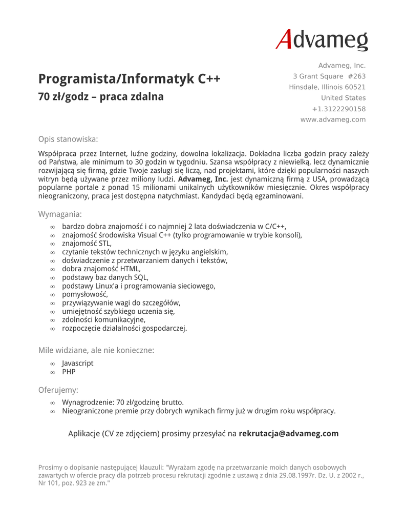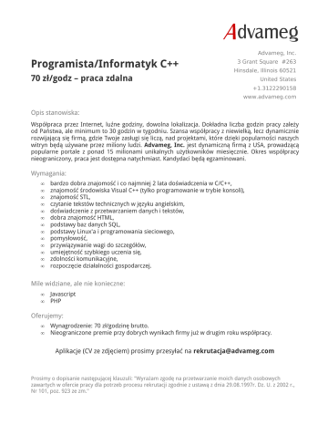 Advameg, Inc. Programista/Informatyk C++ 70 zł/godz – praca zdalna 3 Grant Square #263 Hinsdale, Illinois 60521 United States +1.3122290158 www.advameg.com Opis stanowiska: Współpraca przez Internet, luźne godziny, dowolna lokalizacja. Dokładna liczba godzin pracy zależy od Państwa, ale minimum to 30 godzin w tygodniu. Szansa współpracy z niewielką, lecz dynamicznie rozwijającą się firmą, gdzie Twoje zasługi się liczą, nad projektami, które dzięki popularności naszych witryn będą używane przez miliony ludzi. Advameg, Inc. jest dynamiczną firmą z USA, prowadzącą popularne portale z ponad 15 milionami unikalnych użytkowników miesięcznie. Okres współpracy nieograniczony, praca jest dostępna natychmiast. Kandydaci będą egzaminowani. Wymagania: • • • • • • • • • • • • • bardzo dobra znajomość i co najmniej 2 lata doświadczenia w C/C++, znajomość środowiska Visual C++ (tylko programowanie w trybie konsoli), znajomość STL, czytanie tekstów technicznych w języku angielskim, doświadczenie z przetwarzaniem danych i tekstów, dobra znajomość HTML, podstawy baz danych SQL, podstawy Linux'a i programowania sieciowego, pomysłowość, przywiązywanie wagi do szczegółów, umiejętność szybkiego uczenia się, zdolności komunikacyjne, rozpoczęcie działalności gospodarczej. Mile widziane, ale nie konieczne: • • Javascript PHP Oferujemy: • • Wynagrodzenie: 70 zł/godzinę brutto. Nieograniczone premie przy dobrych wynikach firmy już w drugim roku współpracy. Aplikacje (CV ze zdjęciem) prosimy przesyłać na [email protected] Prosimy o dopisanie następującej klauzuli: "Wyrażam zgodę na przetwarzanie moich danych osobowych zawartych w ofercie pracy dla potrzeb procesu rekrutacji zgodnie z ustawą z dnia 29.08.1997r. Dz. U. z 2002 r., Nr 101, poz. 923 ze zm."