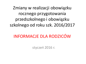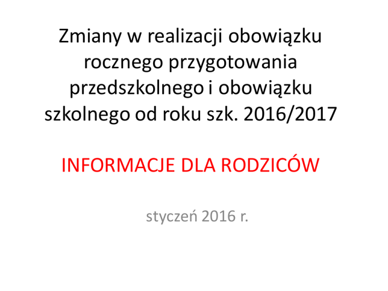 Zmianywrealizacjiobowiązku rocznegoprzygotowania przedszkolnegoiobowiązku szkolnegoodrokuszk.2016/2017 INFORMACJEDLARODZICÓW styczeń2016r. Ustawaz29grudnia2015r.ozmianieustawyosystemieoświatyoraz niektórychinnychustaw (Dz.U.2016, poz.35) Najważniejsze zmianywprowadzonewustawieosystemieoświatyto: 1. prawodzieckaod3.do5.rokużyciadokorzystaniazwychowaniaprzedszkolnego, 2. obowiązekodbyciarocznegoprzygotowaniaprzedszkolnegowprzedszkolulubinnejformie wychowaniaprzedszkolnego przezdziecko6- letnie, 3. obowiązekszkolnyod7.rokużycia, 4. prawodzieckadorozpoczęciaedukacjiszkolnej- nawniosek rodziców- od6.rokużycia,pod warunkiemodbyciarocznegoprzygotowaniaprzedszkolnego, lubuzyskaniaopiniiporadnio możliwościwcześniejszegoprzyjęciadzieckadoszkołypodstawowej wprzypadku niekorzystaniaprzezdzieckozprzygotowaniaprzedszkolnego, 5. możliwośćodroczeniaobowiązkuszkolnego - niedłużejjednakniżojedenrok, 6. wydłużeniemożliwościodroczeniaobowiązkuszkolnegowprzypadkudzieciposiadających orzeczenieopotrzebiekształceniaspecjalnegodo9.rokużycia, 7. 8. 9. 10. wzmocnienierolikuratoraoświatywkształtowaniusieciprzedszkoliiplanusieciszkół- wtymprzywrócenieobowiązkuuzyskiwania pozytywnejopiniiorganunadzorupedagogicznegowprzypadkulikwidacjiszkołylubplacówkiprowadzonejprzezjednostkęsamorządu terytorialnego, przywrócenieobowiązkuuzyskiwaniapozytywnejopiniikuratorawprzypadkuudzielaniaprzezjednostkęsamorząduterytorialnego zezwolenianazałożenie przezosobęfizycznąlubosobęprawnąinnąniżjednostkasamorząduterytorialnegopublicznejszkołylub placówki, przywrócenieobowiązkuopiniowaniaprzezkuratoraoświatyplanówpracypublicznychplacówekdoskonalenianauczycieli, powierzenieministrowiwłaściwemudosprawoświatyiwychowaniakompetencjipowoływaniaiodwoływaniakuratorówi wicekuratorówoświaty. Dzieciurodzonew2010r. Rodzicemająprawozapisaćdziecko6-letniedopierwszejklasy szkołypodstawowej,jeżelidziecko: • korzystałozwychowaniaprzedszkolnegowrokuszkolnym poprzedzającymrokszkolny,wktórymmarozpocząćnaukęw szkolepodstawowej,albo • posiadaopinięzporadnipsychologiczno-pedagogicznejo możliwościrozpoczęcianaukiwszkolepodstawowej, albo • rodzicemająprawopozostawićdzieckowoddziale przedszkolnym/przedszkolu. Skutkizapisaniadziecka6-letniegodopierwszejklasy • Dzieckojestprzyjmowanedoszkołyzurzędu– jeżeli uczęszczało dooddziałuprzedszkolnegowtejsamejszkole • Dzieckootrzymabezpłatniedokorzystaniapodręczniki(są wypożyczanezbibliotekiszkolnej)orazmateriały ćwiczeniowe(sąprzekazywanenawłasność) • Składoddziału(klasy)możebyćinnyniżgrupyprzedszkolnej, doktórejuczęszczało dziecko Skutkipozostawienia6-latkawoddzialeprzedszkolnym • • • Dzieckoniepodlegakolejnejrekrutacji– wystarczyzłożyćdeklarację kontynuowaniawychowaniaprzedszkolnego Rodzicekupujądzieckupodręcznikdowychowaniaprzedszkolnego Możebyćinnyskładgrupy,innywychowawca Ostatecznądecyzjępowinnipodjąćrodzice dzieckapokonsultacjiz nauczycielemprzedszkola,którydokonujediagnozyprzedszkolnejdziecka wtymzakresie. Wbieżącymrokuszkolnyminformacjęogotowościdzieckadopodjęcia naukiwszkolepodstawowejnauczycielpowinienprzekazaćrodzicomw marcu,abymoglipodjąćiprzekazaćdecyzjędo31marca2016r. Dzieciurodzonew2009r. Rodzicedzieckaurodzonegowroku2009,któreobecniejestwIklasieszkoły podstawowejirozpoczęłonaukęjakosześciolatekwrokuszkolnym 2015/2016- mogąpodjąćdecyzjęokontynuowaniunaukiwIklasie równieżwkolejnymrokuszkolnym2016/2017 (art.9nowelizacjiustawy). Takiwniosekmogązłożyćwedługwłasnegowyborudodyrektoraszkoły: • podstawowej,doktórejdzieckouczęszcza, • podstawowej,wobwodziektórejdzieckomieszka, • podstawowejinnejniżwymienionewyżej, • podstawowejniepublicznej - wterminiedo31marca2016r. Skutkizłożeniawnioskudoszkołypodstawowej,doktórejdzieckouczęszcza: • • • • • dzieckood1września2016kontynuujęnaukęwklasieIszkoły podstawowej, dzieckoniebierzeudziałuwpostępowaniurekrutacyjnymdoklasyInarok szkolny2016/2017, dokońcarokuszkolnego2015/2016dzieckokontynuujenaukęwklasieI, aleniepodlegaklasyfikacjirocznejipromowaniudoklasyIIoraz nieotrzymujeświadectwaszkolnegopromocyjnego, dzieckomożedokońcarokuszkolnego2015/2016zamiastkontynuowania naukiwklasieIkorzystaćzwychowaniaprzedszkolnegowwybranymprzez rodzicówprzedszkolu,oddzialeprzedszkolnymlubinnejformie wychowaniaprzedszkolnego,jeżelidyrektoralboosobakierującawyrazi zgodęnaprzyjęciedzieckawtrakcierokuszkolnego- jeżelitaksięstanie dyrektorlubosobakierującaplacówkąinformujeotymdyrektoraszkoły podstawowej,wobwodziektórejdzieckomieszka, wprzypadkunieprzyjęciadzieckadowychowaniaprzedszkolnego kontynuujewrokuszkolnym2015/2016naukęwklasieIszkoły podstawowej. Skutkizłożeniawnioskudoszkołypodstawowej,wobwodziektórejdzieckomieszka: • • • • • • rodzicepowinnipowiadomićdyrektoraszkołypodstawowej,doktórej dzieckouczęszczaozłożeniuwniosku, dzieckood1września2016kontynuujęnaukęwklasieI, dzieckojestprzyjmowanedoszkołyzurzędu, dokońcarokuszkolnego2015/2016kontynuujenaukęwklasieI,alenie podlegaklasyfikacjirocznejipromowaniudoklasyIIszkołypodstawowej oraznieotrzymujeświadectwaszkolnegopromocyjnego, dzieckomożedokońcarokuszkolnego2015/2016zamiastkontynuowania naukiwklasieIkorzystaćzwychowaniaprzedszkolnegowwybranymprzez rodzicówprzedszkolu,oddzialeprzedszkolnymlubinnejformie wychowaniaprzedszkolnego,jeżelidyrektoralboosobakierującawyrazi zgodęnaprzyjęciedzieckawtrakcierokuszkolnego- jeżelitaksięstanie dyrektorlubosobakierującaplacówkąinformujeotymdyrektoraszkoły podstawowej,wobwodziektórejdzieckomieszka, wprzypadkunieprzyjęciadzieckadowychowaniaprzedszkolnego kontynuujeonowrokuszkolnym2015/2016naukęwklasieIszkoły podstawowej. Skutkizłożeniawnioskudoszkołypodstawowejinnejniżtadoktórejuczeń uczęszczaorazinnejniższkoławobwodziektórejdzieckomieszka: • rodzicepowinnipowiadomićdyrektoraszkołypodstawowej,doktórej dzieckouczęszczaozło