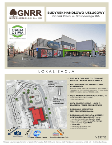 BUDYNEK HANDLOWO-USŁUGOWY Gdańsk Oliwa, ul. Droszyńskiego 28A LOKALIZACJA Tereny mieszkaniowe dzielnicy Gdańsk Przymorze DZIELNICA OLIWA (18 TYS. OSÓB) NIE POSIADA CENTRUM HANDLOWEGO! KLASA PREMIUM - NOWE MIESZKANIA I APARTAMENTY W sąsiedztwie znajduje się ponad 1800 nowych mieszkań w standardzie premium. W promieniu 1000 m mieszka ponad 35 000 osób. WĘZEŁ PRZESIADKOWY SKM/ PKP/ BUS/ TR Tereny mieszkaniowe dzielnicy Gdańsk Oliwa ~10 m od pętli autobusowej ~50 m od peronu ULICA DROSZYŃSKIEGO - ULICA O ZNACZENIU PONAD DZIELNICOWYM DOSKONAŁE SĄSIEDZTWO PRZY DELIKATESACH ALMA DOSKONAŁA LOKALIZACJA W STREFIE CENTRUM ZDROWIA I URODY, m.in.: 1. studio Pilates/Fitness Karoliny Libelt 2. gabinety rehabilitacji Leszka Meringa 3. salon stylista- fryzjer KLIPS 4. ORIFLAME 5. gabinety kosmetyczne 6. gabinet dietetyka Olivia Business Centre Arkońska Business Park VERTE Niniejsze warunki mają charakter wyłącznie informacyjny. Treść folderu nie stanowi oferty handlowej w rozumieniu art. 66, ust. 1 Kodeksu Cywilnego. BUDYNEK HANDLOWO-USŁUGOWY Gdańsk Oliwa, ul. Droszyńskiego 28A P A R T E R I P I Ę T R O – L O K A L E – L O K A L E H A N D L O W E H A N D L O W E Więcej informacji: http://www.gielda-nieruchomosci.com.pl/inwestycja/Gdansk_Oliwa_PKP Więcej informacji: http://www.gnrr.pl/inwestycja/Gdansk_Oliwa_PKP AGENT WYŁĄCZNY GNRR Robert Reich 80-280 GDAŃSK ul. Szymanowskiego 2 tel.: 58 699 07 77 www.GNRR.pl OSOBA DO KONTAKTU Katerina Kakaris Tel. 506 120 120 [email protected] Niniejsze warunki mają charakter wyłącznie informacyjny. Treść folderu nie stanowi oferty handlowej w rozumieniu art. 66, ust. 1 Kodeksu Cywilnego.