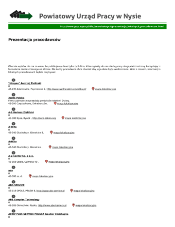 http://www.pup.nysa.pl/dla_bezrobotnych/prezentacja_lokalnych_pracodawcow.html Prezentacja pracodawców Poniżej publikujemy bazę danych pracodawców aktywnie współpracujących z naszym Urzędem w zakresie publikowania ofert pracy. U nich możecie szukać zatrudnienia. Obecnie wpisów nie ma za wiele, bo publikujemy dane tylko tych firm, które zgłosiły do nas ofertę pracy drogą elektroniczną, korzystając z formularza zamieszczonego na stronie. Nie każdy pracodawca chce również aby jego dane były uwidocznione. Wraz z czasem, informacji o lokalnych pracodawcach będzie przybywać. "Morgan" Andrzej Zieliński 0 47-435 Adamowice, Poprzeczna 2, http://www.wellnessbiz.republika.pl/ mapa lokalizacyjna 2WBC Polska Firma zajmuje się sprzedażą produktów telefonii Dialog. 42-200 Częstochowa, Dekabrystów, mapa lokalizacyjna A-S Bartosz Zieliński 0 48-300 Nysa, Rynek , http://auto-szkola.org A-Wita 0 48-340 Głuchołazy, Gierałcice 8, A-Wita 0 48-340 Głuchołazy, Gierałcice , A-Z Center Sp. z o.o. 0 45-058 Opole, Ozimska 40 , aaa 0 48-300 ss, d, mapa lokalizacyjna mapa lokalizacyjna mapa lokalizacyjna mapa lokalizacyjna mapa lokalizacyjna ABC-SERVICE 0 45-118 OPOLE, PTASIA 6, http://www.abc-service.pl ABE Complex Technology 0 48-385 Otmuchów, Nyska, http://www.abe-kamery.pl ACTIV PLUS SERVICE POLSKA Gautier Christophe 0 mapa lokalizacyjna mapa lokalizacyjna 52-340 WROCŁAW, REDARÓW 28, mapa lokalizacyjna Adam Sroka Dom kanadyjka systemy szkieletowe Nysa W naszej ofercie dom wykonujemy na podstawie naszych projektów lub projektu dostarczonego przez klienta. Właśnie dla Państwa poszukujących własnego niedrogiego domu proponujemy budowę domu murowanego na konstrukcji szkieletowej. Powierzenie nam budowy domu zaczyna się od pierwszych kroków: przygotowania projektu domu, uzyskania niezbędnych pozwoleń, zalania ławicy, aż do oddania Państwu kluczy do domu. 48-300 Jędrzychów, Polna, http://www.kanadyjkanysa.pl mapa lokalizacyjna Adecco Poland Sp. z o.o. 0 45-064 Opole, Kołłataja 12/2, http://www.adecco.pl mapa lokalizacyjna Agencja 12stopni.pl Mikołaj Antoniak 0 45-304 Opole, Sieradzka 9/606, http://www.12stopni.pl Agencja Allianz Nysa 0 48-300 NYSA, Celna 2, http://www.ubezpieczenianysa.pl mapa lokalizacyjna mapa lokalizacyjna Agencja Doradztwa Personalnego Work&Werken; 0 50-078 Wrocław, Leszczyńskiego 4 lok 29, http://www.workwerken.eu mapa lokalizacyjna Agencja Interaktywna IntraCOM.pl sc IntraCOM.pl zajmuje się kreowaniem wizerunku firm i dostarczaniem najnowszej technologii dla biznesu w oparciu o internet oraz technologie multimedialne. Realizujemy to poprzez: - Tworzenie stron i portali internetowych - Tworzenie systemów B2B, B2C - Budowanie wizerunku firm i marek w internecie - Tworzenie prezentacji multimedialnych - Opracowywanie programów lojalnościowych - Przygotowywanie i nadzór nad kampaniami reklamowymi 40-159 Katowice, Jesionowa 9a, http://www.intracom.pl mapa lokalizacyjna Agencja Ubezpieczeniowa 0 46-380 Dobrodzień, Edyty Stein 2, mapa lokalizacyjna Agnik 0 48-303 NYSA, PIŁSUDSKIEGO 62B, mapa lokalizacyjna ALFA BIURO RACHUNKOWE MONIKA KUCHARSKA 0 48-300 JĘDRZYCHÓW, SŁOWICZA, mapa lokalizacyjna Angel Care 24 0 85-009 Bydgoszcz, Dworcowa, http://www.angelcare24.eu/ ● ● ● ● ● ● ● ● 1 2 3 4 5 6 Następna > Ostatnia » mapa lokalizacyjna