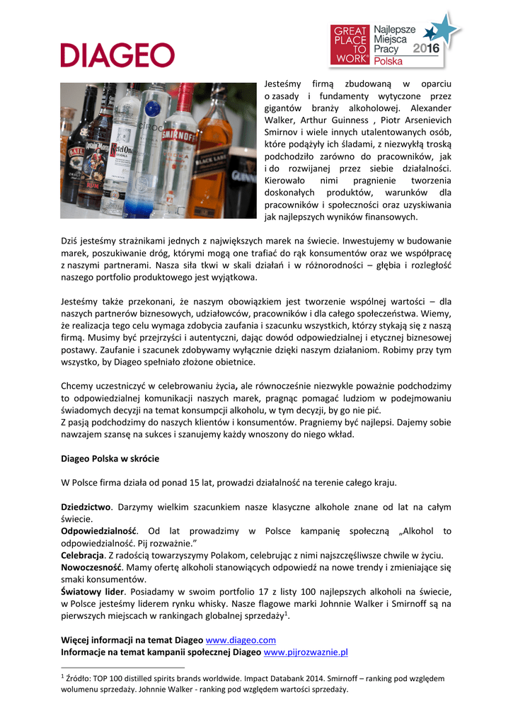 Jesteśmy firmą zbudowaną w oparciu o zasady i fundamenty wytyczone przez gigantów branży alkoholowej. Alexander Walker, Arthur Guinness , Piotr Arsenievich Smirnov i wiele innych utalentowanych osób, które podążyły ich śladami, z niezwykłą troską podchodziło zarówno do pracowników, jak i do rozwijanej przez siebie działalności. Kierowało nimi pragnienie tworzenia doskonałych produktów, warunków dla pracowników i społeczności oraz uzyskiwania jak najlepszych wyników finansowych. Dziś jesteśmy strażnikami jednych z największych marek na świecie. Inwestujemy w budowanie marek, poszukiwanie dróg, którymi mogą one trafiać do rąk konsumentów oraz we współpracę z naszymi partnerami. Nasza siła tkwi w skali działań i w różnorodności – głębia i rozległość naszego portfolio produktowego jest wyjątkowa. Jesteśmy także przekonani, że naszym obowiązkiem jest tworzenie wspólnej wartości – dla naszych partnerów biznesowych, udziałowców, pracowników i dla całego społeczeństwa. Wiemy, że realizacja tego celu wymaga zdobycia zaufania i szacunku wszystkich, którzy stykają się z naszą firmą. Musimy być przejrzyści i autentyczni, dając dowód odpowiedzialnej i etycznej biznesowej postawy. Zaufanie i szacunek zdobywamy wyłącznie dzięki naszym działaniom. Robimy przy tym wszystko, by Diageo spełniało złożone obietnice. Chcemy uczestniczyć w celebrowaniu życia, ale równocześnie niezwykle poważnie podchodzimy to odpowiedzialnej komunikacji naszych marek, pragnąc pomagać ludziom w podejmowaniu świadomych decyzji na temat konsumpcji alkoholu, w tym decyzji, by go nie pić. Z pasją podchodzimy do naszych klientów i konsumentów. Pragniemy być najlepsi. Dajemy sobie nawzajem szansę na sukces i szanujemy każdy wnoszony do niego wkład. Diageo Polska w skrócie W Polsce firma działa od ponad 15 lat, prowadzi działalność na terenie całego kraju. Dziedzictwo. Darzymy wielkim szacunkiem nasze klasyczne alkohole znane od lat na całym świecie. Odpowiedzialność. Od lat prowadzimy w Polsce kampanię społeczną „Alkohol to odpowiedzialność. Pij rozważnie.” Celebracja. Z radością towarzyszymy Polakom, celebrując z nimi najszczęśliwsze chwile w życiu. Nowoczesność. Mamy ofertę alkoholi stanowiących odpowiedź na nowe trendy i zmieniające się smaki konsumentów. Światowy lider. Posiadamy w swoim portfolio 17 z listy 100 najlepszych alkoholi na świecie, w Polsce jesteśmy liderem rynku whisky. Nasze flagowe marki Johnnie Walker i Smirnoff są na pierwszych miejscach w rankingach globalnej sprzedaży1. Więcej informacji na temat Diageo www.diageo.com Informacje na temat kampanii społecznej Diageo www.pijrozwaznie.pl 1 Źródło: TOP 100 distilled spirits brands worldwide. Impact Databank 2014. Smirnoff – ranking pod względem wolumenu sprzedaży. Johnnie Walker - ranking pod względem wartości sprzedaży. Firma Diageo w Polsce od 2010 roku prowadzi kampanię społeczną „Alkohol to odpowiedzialność. Pij rozważnie.” Podstawowym celem kampanii jest promocja odpowiedzialnych postaw społecznych w zakresie spożywania alkoholu. Organizatorzy kampanii angażują ekspertów merytorycznych, budują narzędzia edukacyjne w oparciu o doświadczenie i wiedzę ekspertów, jak również stale oceniają efektywność prowadzonych działań pod kątem skuteczności docierania przekazu edukacyjnego do grup docelowych kampanii. Dotychczasowe, różnorodne działania były realizowane w partnerstwie z: siecią hipermarketów Real, Warszawskim Uniwersytetem Medycznym, Policją, Fundacją Krzyś, Samar Instytutem Rynku Motoryzacyjnego, Zrzeszeniem Studentów Polskich, Instytutem Transportu Samochodowego, Międzynarodowym Stowarzyszeniem Policji Sekcja Polska oraz wieloma ekspertami. Kampania „Alkohol to odpowiedzialność. Pij rozważnie.” kierowana jest do dorosłych konsumentów i promuje 4 proste zasady odpowiedzialnego picia alkoholu: 1. 2. 3. 4. Nie pij, jeśli prowadzisz. Po każdym drinku wypij szklankę wody. Kiedy pijesz, pamiętaj też o jedzeniu. Nie pij, jeśli nie jesteś pełnoletni. W badaniach oceniających skuteczność kampanii aż 97,9% respondentów oceniło pomysł prowadzenia kampanii edukującej w zakresie odpowiedzialnego picia alkoholu przez firmę alkoholową za dobry i bardzo dobry pomysł2 Co dziesiąty dorosły Polak deklarował, że kampania miała wpływ na jego zachowanie. Kampania została oceniona jako wiarygodna i potrzebna przez ponad 90% badanych a 80% zwróciło uwagę na jej edukacyjny przekaz3. Kampania „Alkohol to odpowiedzialność. Pij rozważnie.” była kilkukrotnie wyróżniana wśród Dobrych Praktyk Forum Odpowiedzialnego Biznesu. Firma Diageo Polska otrzymała za nią również nagrodę Stevie Awards 2014 – w kategorii Komunikacja lub Kampania PR roku przeprowadzona w Social Media. W uznaniu prowadzenia działań społecznych firma uzyskała także tytuły Lidera Odpowiedzialnego Biznesu w roku 2012 oraz Etycznej firmy w roku 2015. Diageo Polska jest także jedyną firmą alkoholową, która wchodzi w skład Rady Programowej United Nations Global Compact Polska a działania firmy w roku 2014 i 2015 zostały opisane w United Nations Global Compact Yearbook. Organizatorzy kampanii „Alkohol to odpowiedzialność. Pij rozważnie.” planują jej dalszy rozwój i poszerzanie skali działań. Dodatkowe informacje na temat kampanii dostępne są na stronie www.pijrozwaznie.pl. 2 Dane na podstawie: Badanie jakościowe przeprowadzone przez Millward Brown w lutym 2012 podczas kampanii prowadzonej w hipermarketach Real. 3 Dane na podstawie: Brand Tracking Study realizowane przez Millward Brown dla marek Diageo. Respondenci 18-45 lat, w dużych miastach (próba reprezentatywna dla grupy ok. 12 mln Polaków).