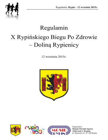 Regulamin, Rypin – 12 września 2015r. Regulamin X Rypińskiego Biegu Po Zdrowie – Doliną Rypienicy 12 września 2015r. Organizator: Miejski Ośrodek Sportu i Rekreacji w Rypinie ul. Sportowa 41, 87-500 Rypin Regulamin, Rypin – 12 września 2015r. 1. TERMIN I MIEJSCE termin: zawody odbędą się 12 września 2015 r. godz. 12:00 miejsce / trasa: Rypin (MOSiR) – ul. Sportowa – ul. Lipnowska - Osiedle Sportowe – Kowalki – Sikory – MOSiR (łącznie 10 km) 2. CEL ZAWODÓW popularyzacja biegania jako najprostszej formy ruchu i rekreacji fizycznej popularyzacja biegów masowych, zachęta do aktywnego spędzania wolnego czasu, promocja miasta Rypina 3. ORGANIZATOR Miejski Ośrodek Sportu i Rekreacji w Rypinie, ul. Sportowa 41, 87 – 500 Rypin, Urząd Miasta Rypin, ul. Warszawska 40, 87 – 500 Rypin 4. PROGRAM SZCZEGÓŁOWY 9.00 – otwarcie biura zawodów 11.30 – zamknięcie listy startowej biegu głównego 12.00 – start do biegu głównego 14.30 – wręczanie nagród 16.00 – zamknięcie biura zawodów Organizator: Miejski Ośrodek Sportu i Rekreacji w Rypinie ul. Sportowa 41, 87-500 Rypin Regulamin, Rypin – 12 września 2015r. 5. UCZESTNICTWO W biegu mogą uczestniczyć zawodnicy, którzy: dokonają zgłoszenia swojego uczestnictwa w biegu (formularz zgłoszeniowy do pobrania m.in.: na stronie www.sts-timing.pl, www.grand-prix-biegi.pl. Zapisu do biegu będzie można dokonać również osobiście w dniu zawodów w godzinach 9.00 – 11.30 ukończyli 18 rok życia ukończyli 16 rok życia i przedstawią pisemną zgodę rodzica lub opiekuna prawnego na start w biegu przedstawią zaświadczenie lekarskie o zdolności do czynnego uczestnictwa w biegach długodystansowych lub podpiszą oświadczenie o takiej zdolności i starcie na własną odpowiedzialność. Biuro zawodów, ul. Sportowa 41, czynne od godziny 9:00. W biurze zawodów zawodnicy otrzymają pakiety startowe. Pakiety startowe zawierają: numer startowy, agrafki, chip do pomiaru czasu oraz pamiątkową koszulkę. (Uwaga – osobom, które dokonają opłaty startowej po 1 września 2015, nie gwarantujemy pamiątkowej koszulki w żądanym rozmiarze). Organizator: Miejski Ośrodek Sportu i Rekreacji w Rypinie ul. Sportowa 41, 87-500 Rypin Regulamin, Rypin – 12 września 2015r. 6. KATEGORIE WIEKOWE - klasyfikacje wiekowe w podziale na kobiety i mężczyzn (decyduje rok urodzenia), Kobiety: Mężczyźni: K–1 16 – 29 lat M–1 16 – 29 lat K–2 30 – 39 lat M–2 30 – 39 lat K–3 40 – 49 lat M–3 40 – 49 lat K–4 50 – 59 lat M–4 50 – 59 lat K–5 60 – 69 lat M–5 60 – 69 lat M–6 70 + K – 6…..70 + Kategoria drużynowa minimum 4 osoby (do klasyfikacji liczy się czas czterech najlepszych). Uwaga! Obowiązuje jednakowa pisownia nazwy klubu oraz dokument przynależności do niego. 7. NAGRODY gwarantowane medale pamiątkowe dla 300 pierwszych zawodników gwarantowane koszulki okolicznościowe dla 300 pierwszych zawodników zwycięzcy w kategorii „open” kobiet i mężczyzn otrzymają nagrody rzeczowe nagrody rzeczowe dla najlepszych trzech zawodniczek lub zawodników w kategoriach przewidziano nagrodę dla najlepszej drużyny (warunkiem sklasyfikowania drużyny jest start co najmniej 4 jej zawodników) Organizator: Miejski Ośrodek Sportu i Rekreacji w Rypinie ul. Sportowa 41, 87-500 Rypin Regulamin, Rypin – 12 września 2015r. 8. SPRAWY FINANSOWE Koszt udziału w biegu to 20 złotych (do końca sierpnia), od 1 września 30 złotych, w dniu zawodów 40 złotych. Zawodnikom zarejestrowanym w klasyfikacji „GRAND PRIX Województwa Kujawsko- Pomorskiego 2015” przysługuje zniżka w wysokości 5 zł. Dowodem wpłynięcia opłaty startowej jest pojawienie się informacji o wpłacie przy nazwisku zawodnika na liście startowej na stronie www, co następuje po około 3-5 dniach po dokonaniu opłaty. W sytuacji spornej należy podczas weryfikacji w Biurze Zawodów przedstawić dowód wpłaty. Opłata wpisowa jest całkowicie przeznaczona na koszty organizacji biegu. Wpisowe wpłacamy na następujące konto: Miejski Ośrodek Sportu i Rekreacji w Rypinie ul. Sportowa 41, 87-500 Rypin Bank Gospodarki Żywnościowej S.A., Oddział w Rypinie Nr 81 20 30 00 45 11 1000 0002 46 52 60 z dopiskiem „X RYPIŃSKI BIEG PO ZDROWIE” Organizator: Miejski Ośrodek Sportu i Rekreacji w Rypinie ul. Sportowa 41, 87-500 Rypin Regulamin, Rypin – 12 września 2015r. 9. BEZPIECZEŃSTWO / ZASADY ZACHOWANIA UCZESTNIKÓW Wszyscy zawodnicy muszą zostać zweryfikowani w biurze zawodów. Każdy z uczestników musi posiadać dokument tożsamości. Warunkiem udziału w biegach jest własnoręczne złożenie podpisu pod oświadczeniem o zdolności do uczestnictwa w biegach na własną odpowiedzialność. Organizator nie zapewnia uczestnikom ubezpieczenia na życie, zdrowotnego, odpowiedzialności cywilnej z tytułu choroby, wypadku, odniesienia obrażeń, śmierci, szkód, jakie mogą wystąpić w związku z uczestnictwem w biegu. Organizator nie ponosi się z tego tytułu odpowiedzialności. Uczestnicy zawodów zobowiązani są do stosowania się do poleceń wydawanych przez służby porządkowe oraz służby kierujące ruchem drogowym Zawodnicy biegną zgodnie z oznaczeniami na trasie oraz wskazaniami służby porządkowej, nie zbaczając z wyznaczonej trasy Do udziału w zawodach nie zostaną dopuszczone osoby, których zachowanie wskazuje na to, iż znajdują się one pod wpływem alkoholu lub innego środka odurzającego Nieprzestrzeganie zasad bezpieczeństwa będzie skutkowało odebraniem numeru startowego oraz natychmiastową dyskwalifikacją zawodnika 10. POSTANOWIENIA KOŃCOWE Zawody odbędą się bez względu na warunki atmosferyczne; Organizator: Miejski Ośrodek Sportu i Rekreacji w Rypinie ul. Sportowa 41, 87-500 Rypin