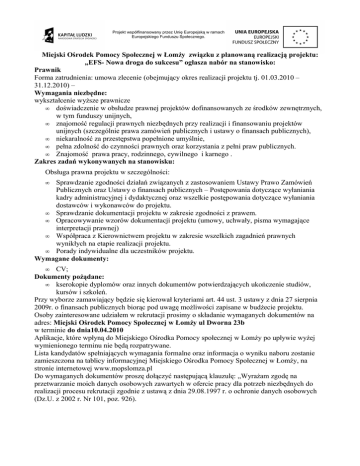 Projekt współfinansowany przez Unię Europejską w ramach Europejskiego Funduszu Społecznego. Miejski Ośrodek Pomocy Społecznej w Łomży związku z planowaną realizacją projektu: „EFS- Nowa droga do sukcesu” ogłasza nabór na stanowisko: Prawnik Forma zatrudnienia: umowa zlecenie (obejmujący okres realizacji projektu tj. 01.03.2010 – 31.12.2010) – Wymagania niezbędne: wykształcenie wyższe prawnicze • doświadczenie w obsłudze prawnej projektów dofinansowanych ze środków zewnętrznych, w tym funduszy unijnych, • znajomość regulacji prawnych niezbędnych przy realizacji i finansowaniu projektów unijnych (szczególnie prawa zamówień publicznych i ustawy o finansach publicznych), • niekaralność za przestępstwa popełnione umyślnie, • pełna zdolność do czynności prawnych oraz korzystania z pełni praw publicznych. • Znajomość prawa pracy, rodzinnego, cywilnego i karnego . Zakres zadań wykonywanych na stanowisku: Obsługa prawna projektu w szczególności: Sprawdzanie zgodności działań związanych z zastosowaniem Ustawy Prawo Zamówień Publicznych oraz Ustawy o finansach publicznych – Postępowania dotyczące wyłaniania kadry administracyjnej i dydaktycznej oraz wszelkie postępowania dotyczące wyłaniania dostawców i wykonawców do projektu. • Sprawdzanie dokumentacji projektu w zakresie zgodności z prawem. • Opracowywanie wzorów dokumentacji projektu (umowy, uchwały, pisma wymagające interpretacji prawnej) • Współpraca z Kierownictwem projektu w zakresie wszelkich zagadnień prawnych wynikłych na etapie realizacji projektu. • Porady indywidualne dla uczestników projektu. Wymagane dokumenty: • CV; Dokumenty pożądane: • kserokopie dyplomów oraz innych dokumentów potwierdzających ukończenie studiów, kursów i szkoleń. Przy wyborze zamawiający będzie się kierował kryteriami art. 44 ust. 3 ustawy z dnia 27 sierpnia 2009r. o finansach publicznych biorąc pod uwagę możliwości zapisane w budżecie projektu. Osoby zainteresowane udziałem w rekrutacji prosimy o składanie wymaganych dokumentów na adres: Miejski Ośrodek Pomocy Społecznej w Łomży ul Dworna 23b w terminie do dnia10.04.2010 Aplikacje, które wpłyną do Miejskiego Ośrodka Pomocy społecznej w Łomży po upływie wyżej wymienionego terminu nie będą rozpatrywane. Lista kandydatów spełniających wymagania formalne oraz informacja o wyniku naboru zostanie zamieszczona na tablicy informacyjnej Miejskiego Ośrodka Pomocy Społecznej w Łomży, na stronie internetowej www.mopslomza.pl Do wymaganych dokumentów proszę dołączyć następującą klauzulę: „Wyrażam zgodę na przetwarzanie moich danych osobowych zawartych w ofercie pracy dla potrzeb niezbędnych do realizacji procesu rekrutacji zgodnie z ustawą z dnia 29.08.1997 r. o ochronie danych osobowych (Dz.U. z 2002 r. Nr 101, poz. 926). •