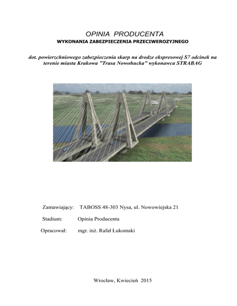OPINIA PRODUCENTA WYKONANIA ZABEZPIECZENIA PRZECIWEROZYJNEGO dot. powierzchniowego zabezpieczenia skarp na drodze ekspresowej S7 odcinek na terenie miasta Krakowa ”Trasa Nowohucka” wykonawca STRABAG Zamawiający: TABOSS 48-303 Nysa, ul. Nowowiejska 21 Stadium: Opinia Producenta Opracował: mgr. inż. Rafał Łukomski Wrocław, Kwiecień 2015 Analiza zabezpieczenia przeciwerozyjnego Analizując zaprojektowane zabezpieczenie antyerozyjne skarp w odniesieniu do technologii wykonania nasypów z takich materiałów jak: Żużel Paleniskowy UTEX Żużel Paleniskowy MADROBET proponuję zmianę systemu na zastosowanie przestrzennego systemu komórkowego. Wykonanie nasypów z Żużli paleniskowych spowoduje powstanie warstwy poślizgowej jak na nasypach stabilizowanych chemicznie. Z problemem zabezpieczeń antyerozyjnych na warstwie poślizgowej mieliśmy do czynienia na kontraktach autostradowych A1; A4; S1 i S8 i z całą stanowczościom stwierdzamy że wykonanie zabezpieczeń skarp w tych warunkach jest bardzo trudnym zadaniem. Nieprzepuszczalna powierzchnia jaką w efekcie uzyskamy z warstw materacy, tworzą nienaturalną warstwę poślizgową, a przenikającą przez warstwę humusu woda opadowa natrafiając na taką barierę zwiększa poślizg powodując ścięcie całych warstw antyerozyjnych. Wykonanie zabezpieczenie skarp za pomocą cienkiej warstwy humusu zabezpieczoną matą antyerozyjną może okazać się niewystarczające. Minimalna ilość humusu dla prawidłowego ukorzenienia się traw i zapewnienia odpowiedniej ilości wody to około 10cm. Zjawisko to ma szczególne znaczenie na nasypach wykonanych z materiałów powodujących nieprzepuszczalność warstw takich jak Żużle paleniskowe (np.: UTEX; MADROBET) lub ulepszane spoiwami hydraulicznymi. Zabezpieczenie skarp nasypów wykonanych z materiałów tworzących nieprzepuszczalną powierzchnie w okresie wiosennych deszczów jedynie siatką lub matą jak można zaobserwować na wykonanych już odcinkach autostradowych jest niewystarczające, podstawowe problemy to: Powstanie warstwy poślizgowej na styku stabilizowanych materacy a okrywy antyerozyjnej Brak możliwości stałego połączenia z korpusem nasypu Utrudniony montaż mat (rozkładanie z drabin) na skarpach powyżej 1:1,5 Konieczność wykonania rowków kotwiących Proponujmy zastosowanie technologii która potrafi skutecznie zabezpieczyć skarpy nasypów zwłaszcza wykonanych w technologii nieprzepuszczalnej. Technologia komórkowa posiada najlepsze wyniki w okresie w którym roślinność jeszcze nie powstała. Jedyna technologia sprawdzona podczas powodzi Maj 2010. Taboss system® oparty został na skutecznej i sprawdzonej współpracy dwóch polskich firm, producenta geokraty firmy TABOSS i dystrybutora geowłókniny firmy Elikopol BK. Stosowanie geowłókniny jest szczególnie wymagane dla zabezpieczanych skarp które są wykonane z piasków. Ściany komórek geokraty wypełnionych glebą tworzą serię mini-zapór. Sekcje geokraty połączone w opatentowany i unikalny sposób stanowią ochronę skarp i zboczy. Normalny rozwój strug spływowych, wytwarzanych przez skoncentrowany spływ powierzchniowy, przecinający grunt jest powstrzymywany, a dzięki geowłókninie igłowanej firmy Elikopol o chropowatej i szorstkiej / kosmatej / teksturze, która zapewnia doskonałą przyczepność ( adhezję ) dodatkowo kierowany na powierzchnię. Taki mechanizm zmniejsza prędkość przepływu, co w konsekwencji obniża również wartość siły erozyjnej spływu powierzchniowego. Współpraca firm zaowocowała kompleksowym wykonawstwem na czterech kluczowych odcinkach autostradowych około 1,5 mil/m2 prac, związanych z zabezpieczeniem antyerozyjnym i wzmocnieniem podbudowy. Zastosowanie Taboss system® do ochrony skarp nasypów wykonywanych w technologii nieprzepuszczalnej daje stu procentową pewność nawet bez roślinności, jej zalety to: a) b) c) d) geokrata jest tańszym rozwiązaniem, stanowi koszt około 60% maty zabezpiecza wyższą warstwę ziemi co ma znaczenie w okresie roztopów wiosennych jest jedynym rozwiązaniem które sprawdza się w 100% przed wzrostem traw technologia instalowania nie wymaga wykonywania rowków kotwiących co ma przełożenie na cenę montażu e) o 200% szybsza instalacja, jedna brygada cztero osobowa instaluje około 1500m2 f) zastosowanie dodatkowo geowłókniny zabezpiecza przed penetracją wody w głąb korpusu System ten jest z powodzeniem stosowany na wielu odcinkach autostradowych w okresie jesienno zimowym, a działanie jego zostało potwierdzone. Dzięki utrzymaniu zwiększonej zabezpieczonej grubości ziemi zwiększamy wilgotności w gruncie w okresach suszy. 1. Zakres opinii Niniejsza opinia w niczym nie narusza i nie zmienia rozwiązań przyjętych w projekcie drogowym. Obejmuje ono jedynie propozycje rozwiązania powierzchniowego zabezpieczenia skarpy rowu przed erozją. 2. Warunki gruntowe Z przedłożonych materiałów wynika, że korpus skarp nasypów jest zbudowany z Żużela Paleniskowego UTEX Żużela Paleniskowego MADROBET w stanie zagęszczonym. lub 3. Geometria skarpy i ułożenie geokraty na skarpie rowu Z przeprowadzonej rozmowy w biurze budowy przyjęto dwa rozwiązania dla powierzchniowego zabezpieczenia przeciwerozyjnego skarp w nasypie dla pochylenia skarp ≥ 1:1,5 i dla pochylenia ≤ 1:1. - dla skarp autostradowych w nasypie gdzie pochylenie skarpy wynosi 1:1,5 i więcej ale nie przekracza 1:1; Do obliczeń kontrolnych przyjęto pochylenie 1 : 1,5; tg α = 0,674; kąt α = 34,00°; sin α = 0,559 Geokratę należy zakotwić ( o ile warunki terenowe na to pozwalają) w koronie (szczycie) skarpy na szerokości ok. 1,00 m. Przyjęto poziomy układ sekcji geokraty na skarpie pasmami o długości 6 ÷ 12 m (tj. równej długości sekcji geokraty) i szerokości 2,60 m wynikającej z geometrii skarpy. Biorąc pod uwagę wysokość skarpy i jej nachylenie, przyjęto zabezpieczenie z teksturowanej i perforowanej geo