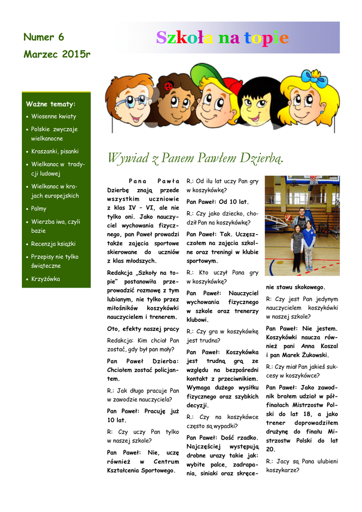 Szkoła na topie Numer 6 Marzec 2015r Ważne tematy: Wiosenne kwiaty Polskie zwyczaje wielkanocne Kraszanki, pisanki Wielkanoc w trady- SZKOŁA Wywiad z Panem Pawłem Dzierbą. cji ludowej Wielkanoc w kra- jach europejskich Palmy Wierzba iwa, czyli bazie Recenzja książki Przepisy nie tylko świąteczne Krzyżówka Pana Dzierbę Pawła znają wsz ystk im przede ucz niowie z klas IV – VI, ale nie tylko oni. Jako nauczyciel wychowania fizycznego, pan Paweł prowadzi NA TOPIE R.: Od ilu lat uczy Pan gry w koszykówkę? Pan Paweł: Od 10 lat. R.: Czy jako dziecko, chodził Pan na koszykówkę? Pan Paweł: Tak. Uczęsz- czałem na zajęcia [email protected] także zajęcia skierowane sportowe do uczniów z klas młodszych. ne oraz treningi w klubie sportowym. Redakcja „Szkoły na to- R.: Kto uczył Pana gry pie” w koszykówkę? postanowiła prze- prowadzić rozmowę z tym lubianym, nie tylko przez miłośników koszykówki Pan Paweł: wychowania Nauczyciel fizycznego nauczycielem i trenerem. w szkole oraz trenerzy klubowi. Oto, efekty naszej pracy R.: Czy gra w koszykówkę Redakcja: Kim chciał Pan jest trudna? zostać, gdy był pan mały? Pan Pan jest Paweł Dzierba: Chciałem zostać policjantem. R.: Jak długo pracuje Pan w zawodzie nauczyciela? Pan Paweł: Pracuję już 10 lat. R: Czy uczy Pan tylko w naszej szkole? Pan Paweł: Nie, uczę również w Centrum Kształcenia Sportowego. Paweł: trudną Koszykówka grą ze względu na bezpośredni kontakt z przeciwnikiem. Wymaga dużego wysiłku fizycznego oraz szybkich decyzji. R.: Czy na koszykówce często są wypadki? Pan Paweł: Dość rzadko. Najczęściej występują drobne urazy takie jak: wybite palce, zadrapania, siniaki oraz skręce- nie stawu skokowego. R: Czy jest Pan jedynym nauczycielem koszykówki w naszej szkole? Pan Paweł: Nie jestem. Koszykówki naucza również pani Anna Koszal i pan Marek Żukowski. R.: Czy miał Pan jakieś sukcesy w koszykówce? Pan Paweł: Jako zawodnik brałem udział w półfinałach Mistrzostw Polski do lat 18, a jako trener doprowadziłem drużynę do finału strzostw Polski do Milat 20. R.: Jacy są Pana ulubieni koszykarze? Str. 2 M a r ze c 2 0 1 5 r cd. Wywiadu z panem Pawłem Dzierbą Pan Paweł: Moi ulubieni Pan Paweł: Czekoladki i koszykarze to Michael Jordan i Scottie Pippen. bukiet kwiatków. R.: Jaką porę roku lubi Pan Pan jakieś zainteresowa- najbardziej i dlaczego? nia? Pan Paweł: Lato ze R.: Czy poza sportem, ma Pan Paweł: Lubię podró- przygotować szykówkę na najwyższym poziomie oraz pojechać do Meksyku. R.: Serdecznie dziękujemy R.: Czy istnieje pani Pawłowa? krew w żyłach filmy, a także słuchać polskiej za rozmowę muzyki rockowej. Pan Paweł: Ja również dziękuję. Dzień Kobiet? R: Ma Pan jakieś marzenia? Apele Pod sumow anie pierwszego semestru nauki w kl. I – III Dnia 16.02.2015 r. „W czasie apelu (poniedziałek) odbył się w naszej szkole apel podsu- wręczano uczniom mowujący I semestr nauki. UCZNIA” jest zawodników do gry w ko- żować, oglądać mrożące R.: Co kupił Jej Pan na WZOROWEGO niem względu na wakacje! Pan Paweł: Istnieje . odznaki Pan Paweł: Moim marze- Apel, który poprowadziła p. Kalina Cetera odbył się w dwóch turach. Były na nim obecne wszystkie klasy I – III. W czasie apelu wręczano uczniom odznaki WZOROWEGO UCZNIA, a także nagrody za udział w konkursach. Uczniowie z klas I otrzymali odznaki w kolorze c z e rw o n y m , uczniowie z klas II w kolorze zielonym, a uczniowie z klas III w kolorze nieb i e sk i m . W sz y st k i m uczniom, którzy zapracowali na odznakę WZOROWEGO UCZNIA oraz laureatom konkursów szkol- nych – redakcja „Szkoły na topie” SERDECZNIE GRATULUJE! Życzymy sukcesów także w drugim semestrze! Magda Dybicz i Zuzia Skierska M a r ze c 2 0 1 5 r Str. 3 Wiosenne kwiaty Wiosna rozpoczęła ochroną. Widok przebi- kolor czy odmianę. Są się 21 marca. Zwykle jednak zwiastuny wiosny moż- śniegów, działa naprawdę kojąco. Ich główki zaczy- szczególnie atrakcyjne, gdy ich kolorowe kwiaty na znaleźć kilka tygodni nają wyglądać z wciąż zim- wychylają się spod pokry- wcześniej. Od końca lute- nej ziemi między końcem wy śniegu leżącego jesz- go i początku marca rośli- lutego i początkiem marca. cze na ziemi. Botaniczny ny Przebiśniegi preferują termin „krokus” pochodzi przypominają nam, że już pora wyglądać wiosny. Po miejsca wilgotne i zacienione. Często można je od greckiej nazwy „kroki”, która oznacza „nić”. Odno- długich i ciemnych zimo- znaleźć na leśnych pola- si się ona do nitkowatego wych wiosna nach, łąkach i w lasach znamienia kwiatu krokusa. wnosi nowe życie do świa- liściastych. Kwitnące prze- Brunatny dywan liści po- ta przyrody. Dni stają się biśniegi są dostępne do kryw ają dłuższe, kwiaty zaczynają kwitnąć, na drzewach i marca jako rośliny doniczkowe, które po okresie fioletowe kwiaty przylaszczki. Zawilce kwitną krzewach znów pojawiają kwitnienia można przesa- całymi łaniami. Lepiężnik się wcześnie kwitnące miesiącach pędy, a niebiesko- królestwo dzić do ogrodu. Pierwio- biały i różowy też kwitnie zwierząt budzi się z zimo- snek lekarski i wyniosły ma wczesną wiosną. Lubiące wego snu. już w samej swej nazwie podmokłe tereny śledenni- ma ca Wiosną zakwitają przeróżne kwiaty. W lesie kwitnie wawrzynek wilczełyko. UWAGA! To roślina pod ochroną. Oczywiste oznaki wiosny to przebiśniegi, które także są pod wiosnę. Oczywiście skrętolistna szybko także wychodzą kolorowe niepozorne kwiaty. Żółte krokusy – kolejny symbol wiosny. Krokusy wyglądają kwiaty podbiału rosną na obrzeżach dróg, praktycz- po prostu cudownie bez nie wszędzie. względu na swój kształt, pokazuje także jest chroniony. Z ziemi swoje Opracowała: Martyna Kosik Kilka słów o bocianach Wszyscy nie- się w pary tylko na jeden okoła i krzyczał ile sił w cierpliwością czekają aż 