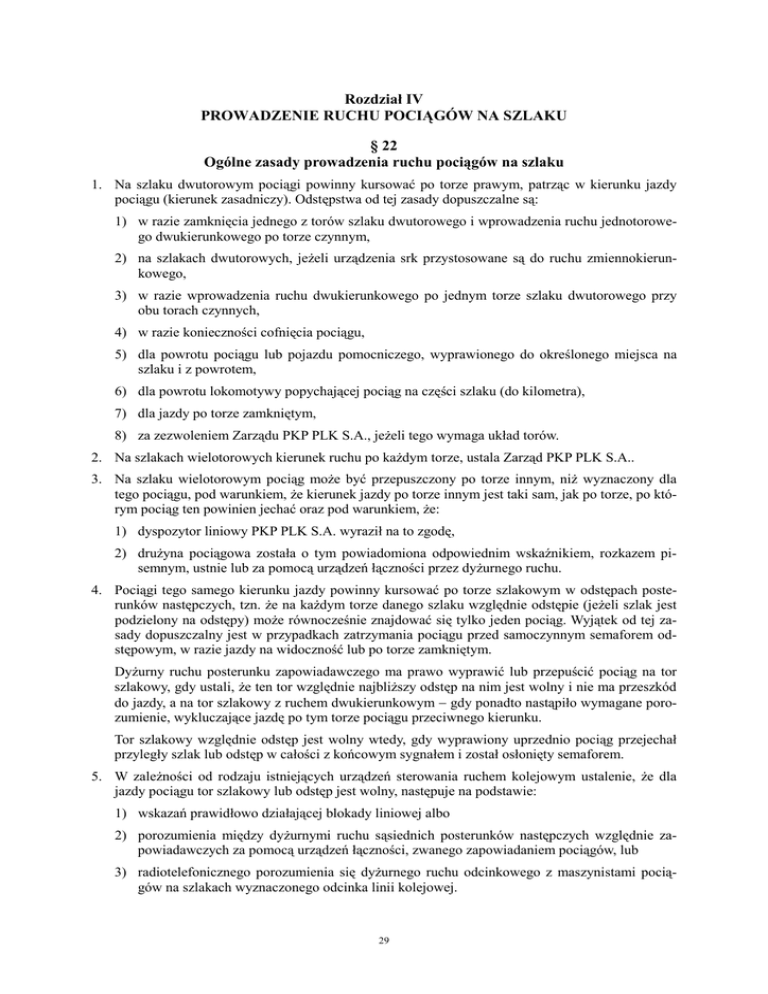 Rozdział IV PROWADZENIE RUCHU POCIĄGÓW NA SZLAKU § 22 Ogólne zasady prowadzenia ruchu pociągów na szlaku 1. Na szlaku dwutorowym pociągi powinny kursować po torze prawym, patrząc w kierunku jazdy pociągu (kierunek zasadniczy). Odstępstwa od tej zasady dopuszczalne są: 1) w razie zamknięcia jednego z torów szlaku dwutorowego i wprowadzenia ruchu jednotorowego dwukierunkowego po torze czynnym, 2) na szlakach dwutorowych, jeŜeli urządzenia srk przystosowane są do ruchu zmiennokierunkowego, 3) w razie wprowadzenia ruchu dwukierunkowego po jednym torze szlaku dwutorowego przy obu torach czynnych, 4) w razie konieczności cofnięcia pociągu, 5) dla powrotu pociągu lub pojazdu pomocniczego, wyprawionego do określonego miejsca na szlaku i z powrotem, 6) dla powrotu lokomotywy popychającej pociąg na części szlaku (do kilometra), 7) dla jazdy po torze zamkniętym, 8) za zezwoleniem Zarządu PKP PLK S.A., jeŜeli tego wymaga układ torów. 2. Na szlakach wielotorowych kierunek ruchu po kaŜdym torze, ustala Zarząd PKP PLK S.A.. 3. Na szlaku wielotorowym pociąg moŜe być przepuszczony po torze innym, niŜ wyznaczony dla tego pociągu, pod warunkiem, Ŝe kierunek jazdy po torze innym jest taki sam, jak po torze, po którym pociąg ten powinien jechać oraz pod warunkiem, Ŝe: 1) dyspozytor liniowy PKP PLK S.A. wyraził na to zgodę, 2) druŜyna pociągowa została o tym powiadomiona odpowiednim wskaźnikiem, rozkazem pisemnym, ustnie lub za pomocą urządzeń łączności przez dyŜurnego ruchu. 4. Pociągi tego samego kierunku jazdy powinny kursować po torze szlakowym w odstępach posterunków następczych, tzn. Ŝe na kaŜdym torze danego szlaku względnie odstępie (jeŜeli szlak jest podzielony na odstępy) moŜe równocześnie znajdować się tylko jeden pociąg. Wyjątek od tej zasady dopuszczalny jest w przypadkach zatrzymania pociągu przed samoczynnym semaforem odstępowym, w razie jazdy na widoczność lub po torze zamkniętym. DyŜurny ruchu posterunku zapowiadawczego ma prawo wyprawić lub przepuścić pociąg na tor szlakowy, gdy ustali, Ŝe ten tor względnie najbliŜszy odstęp na nim jest wolny i nie ma przeszkód do jazdy, a na tor szlakowy z ruchem dwukierunkowym − gdy ponadto nastąpiło wymagane porozumienie, wykluczające jazdę po tym torze pociągu przeciwnego kierunku. Tor szlakowy względnie odstęp jest wolny wtedy, gdy wyprawiony uprzednio pociąg przejechał przyległy szlak lub odstęp w całości z końcowym sygnałem i został osłonięty semaforem. 5. W zaleŜności od rodzaju istniejących urządzeń sterowania ruchem kolejowym ustalenie, Ŝe dla jazdy pociągu tor szlakowy lub odstęp jest wolny, następuje na podstawie: 1) wskazań prawidłowo działającej blokady liniowej albo 2) porozumienia między dyŜurnymi ruchu sąsiednich posterunków następczych względnie zapowiadawczych za pomocą urządzeń łączności, zwanego zapowiadaniem pociągów, lub 3) radiotelefonicznego porozumienia się dyŜurnego ruchu odcinkowego z maszynistami pociągów na szlakach wyznaczonego odcinka linii kolejowej. 29 6. DyŜurny ruchu moŜe zezwolić na wyjazd lub przejazd pociągu po upewnieniu się, Ŝe: 1) otrzymał potwierdzenie przyjazdu poprzednio wyprawionego pociągu od przedniego posterunku następczego, tj.: a) przy prawidłowo działającej blokadzie samoczynnej − właściwe urządzenie powtarzające nie wskazuje zajętości pierwszego odcinka oddalania; za pierwszy odcinek oddalania nie uwaŜa się odcinka toru znajdującego się między semaforem wyjazdowym a następnym semaforem, jeŜeli odcinek ten jest krótszy od obowiązującej drogi hamowania, b) przy prawidłowo działającej półsamoczynnej automatycznej blokadzie liniowej − gdy blokada ta przejdzie do stanu neutralnego, c) przy prawidłowo działającej półsamoczynnej blokadzie liniowej z blokiem pozwolenia i torem szlakowym wyposaŜonym w urządzenia kontroli niezajętości − blok pozwolenia jest odblokowany i powtarzacz odnoszący się do tego toru wskazuje, Ŝe tor jest wolny, d) przy prawidłowo działającej półsamoczynnej blokadzie liniowej z izolowanym torem szlakowym − blok początkowy jest odblokowany i powtarzacz izolowanego toru szlakowego wskazuje, Ŝe tor jest wolny, e) przy prawidłowo działającej półsamoczynnej blokadzie liniowej − odblokował się blok początkowy, f) przy zapowiadaniu za pomocą urządzeń łączności − w dzienniku ruchu jest odpowiedni zapis, 2) od przedniego posterunku zapowiadawczego otrzymał pozwolenie na wyprawienie pociągu na tor szlakowy z ruchem dwukierunkowym po tym torze, 3) ostatni pociąg przeciwnego kierunku przyjechał w całości z końcowym sygnałem po torze, po którym prowadzi się ruch jednotorowy dwukierunkowy, 4) lokomotywa popychająca pociąg na części szlaku powróciła z toru szlakowego i pociąg przybył w całości do przedniego posterunku ruchu, 5) powrócił pociąg wyprawiony do określonego kilometra na szlaku, 6) otrzymano potwierdzenie przyjazdu całego pociągu na bocznicę szlakową, 7) otrzymano potwierdzenie o zakończeniu manewrów kolidujących z jazdą danego pociągu, 8) zwrotnice odgałęziające na bocznice są nastawione i zamknięte dla jazdy pociągu po torze szlakowym, a klucze do nich znajdują się na miejscu przewidzianym regulaminem technicznym, 9) nie ma zgłoszenia o przeszkodzie do jazdy na szlaku, 10) nie opóźni się pociąg mający pierwszeństwo. 7. W razie potrzeby wyprawienia pociągu na sygnał zastępczy lub rozkaz pisemny dyŜurny ruchu powinien upewnić się, czy spełnione są warunki, o których mowa w ust. 6 pkt 1 lit. f oraz w pkt. 2−10. Upewnienie się przed zezwoleniem na wyjazd lub przejazd pociągu na tor szlakowy, w sposób określony regulaminem technicznym, obowiązuje równieŜ dyŜurnego ruchu odcinkowego w przypadkach zdalnego prowadzenia ruchu (§ 30). 8. Ogólne zasady prowadzenia ruchu pociągów na szlaku obowiązują równieŜ pojazdy 