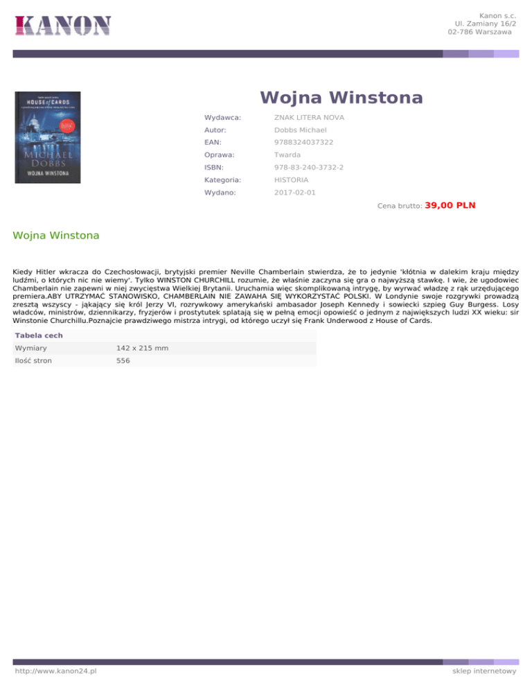 Kanon s.c. Ul. Zamiany 16/2 02-786 Warszawa Wojna Winstona Wydawca: ZNAK LITERA NOVA Autor: Dobbs Michael EAN: 9788324037322 Oprawa: Twarda ISBN: 978-83-240-3732-2 Kategoria: HISTORIA Wydano: 2017-02-01 Cena brutto: 39,00 PLN Wojna Winstona Kiedy Hitler wkracza do Czechosłowacji, brytyjski premier Neville Chamberlain stwierdza, że to jedynie 'kłótnia w dalekim kraju między ludźmi, o których nic nie wiemy'. Tylko WINSTON CHURCHILL rozumie, że właśnie zaczyna się gra o najwyższą stawkę. I wie, że ugodowiec Chamberlain nie zapewni w niej zwycięstwa Wielkiej Brytanii. Uruchamia więc skomplikowaną intrygę, by wyrwać władzę z rąk urzędującego premiera.ABY UTRZYMAĆ STANOWISKO, CHAMBERLAIN NIE ZAWAHA SIĘ WYKORZYSTAĆ POLSKI. W Londynie swoje rozgrywki prowadzą zresztą wszyscy - jąkający się król Jerzy VI, rozrywkowy amerykański ambasador Joseph Kennedy i sowiecki szpieg Guy Burgess. Losy władców, ministrów, dziennikarzy, fryzjerów i prostytutek splatają się w pełną emocji opowieść o jednym z największych ludzi XX wieku: sir Winstonie Churchillu.Poznajcie prawdziwego mistrza intrygi, od którego uczył się Frank Underwood z House of Cards. Tabela cech Wymiary 142 x 215 mm Ilość stron 556 http://www.kanon24.pl sklep internetowy