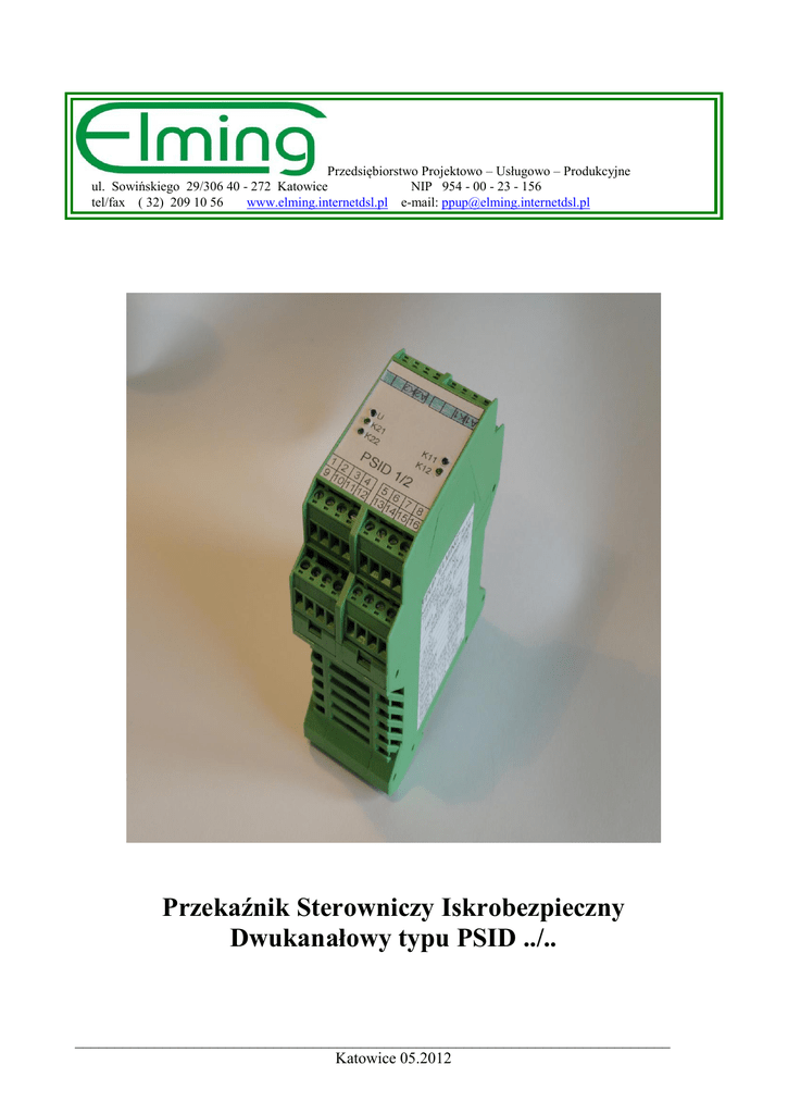 Przedsiębiorstwo Projektowo – Usługowo – Produkcyjne ul. Sowińskiego 29/306 40 - 272 Katowice NIP 954 - 00 - 23 - 156 tel/fax ( 32) 209 10 56 www.elming.internetdsl.pl e-mail: [email protected] Przekaźnik Sterowniczy Iskrobezpieczny Dwukanałowy typu PSID ../.. ___________________________________________________________________________ Katowice 05.2012 Przeznaczenie Przekaźnik PSID-../.. służy do sterowania w obwodach iskrobezpiecznych, elementami stykowymi z szeregowo połączoną diodą w oznaczonym kierunku. Posiada dwa niezależne, galwanicznie oddzielone obwody sterowania. Obwód sterowniczy iskrobezpieczny zapewnia kontrolę przy zwarciu, przerwie, zmniejszeniu oporności równoległej do 2kom i wzroście rezystancji szeregowej do: -PSID 1/1 100/100 -PSID 2/2 600/600 -PSID 1/2 100/600 . Zastosowanie Przekaźnik PSID-../.. może być wykorzystany do zdalnego sterowania elektrycznych urządzeń górniczych w układzie 2 lub 3 - żyłowym z łącznikiem zaopatrzonym w diodę prostowniczą. Przekaźnik przewidziany jest do instalowania w aparaturze elektrycznej budowy normalnej lub przeciwwybuchowej-ognioszczelnej, przeznaczonej do stosowania w wyrobiskach podziemnych zakładów górniczych metanowych i niemetanowych . Warunki środowiskowe - wysokość nad poziomem morza temperatura otoczenia wilgotność względna powietrza narażenia mechaniczne do 1000m -10oC≤ Ta ≤70oC do 95%przy temperaturze 35oC wibracje w miejscu mocowania o częstotliwości 10 - 55Hz i amplitudzie 0,35mm Warunki eksploatacyjne - wahania napięcia zasilającego - sposób zasilania i pracy - położenie eksploatacyjne Un +/-20% ciągły dowolne. Dane techniczne Napięcie zasilania Un=24V +/-20%, 50Hz (zaciski 9/10-15/16 ) Um=28,8V Pobór mocy Sn<3 VA Zakres temperatury otoczenia -10oC ≤ Ta ≤ 70oC Stopień ochrony IP20 Parametry zestyków przekaźników wykonawczych Un=42V AC ; In≤1A Każdy kanał posiada dwa niezależne przekaźniki wykonawcze zaciski 8-6-7, 14-5-13 2 styki przełączne kanał 1 zaciski 1-2-3, 4-11-12 2 styki przełączne kanał 2 Czas wzbudzenia <200ms Czas odwzbudzenia <60ms Wymiary zewnętrzne 111x98x45 mm Masa 0,350 kg Oznaczenie budowy przeciwwybuchowej Ex I (M2) [Ex ia] I Mb Numer certyfikatu badania typu WE OBAC 12ATEX….U ___________________________________________________________________________ Katowice 05.2012 Rezystancje odzbudzenia i rezystancje wzbudzenia Typ PSID 1/1 Rezystancja odwzbudzenia Rezystancja wzbudzenia /maksymalna/ PSID 2/2 Rezystancja odzbudzenia Rezystancja wzbudzenia /maksymalna/ PSID 1/2 Rezystancja odwzbudzenia Rezystancja wzbudzenia /maksymalna/ Kanał 1 Kanał 2 80om +/-20om 80om +/-20om 25-50 om 25-50 om 500om +/-100om 500om +/-100om 100-200 om 100-200 om 80om +/-20om 500om +/-100om 25-50 om 100-200 om Parametry obwodu pomiarowego iskrobezpiecznego „ia” dla kanału 100 om (oznaczenie 1) Uo=15,75V ; Io=63 mA ; Po=230mW ; Lo=120mH ; Co=12µF Parametry obwodu pomiarowego iskrobezpiecznego „ia” dla kanału 600om (oznaczenie 2) Uo=15,75V ; Io=17 mA ; Po=65mW ; Lo=1H ; Co=12µF Budowa i zasada działania Podzespoły i elementy przekaźnika są zmontowane w obudowie typu ME 45 /TBS produkcji PHOENIX CONTACT. Składa się z podstawy, pokrywy, czterech złącz zaciskowych, (zaciski 1 – 16) na które wyprowadzone jest zasilanie i styki przekaźników przewidziane do połączenia z obwodami zewnętrznymi nieiskrobezpiecznymi oraz dwóch złącz zaciskowych, (zaciski A1-K1, A2-K2) na które wyprowadzone są iskrobezpieczne obwody sterowania. Na pokrywie przekaźnika widoczne są diody LED sygnalizujące obecność napięcia zasilania i stan załączenia poszczególnych przekaźników. Przekaźnik przystosowane jest do mocowania na szynie 35mm. Przy montowaniu przekaźnika w maszynach ruchomych zaleca się stosowanie dodatkowych obejm uniemożliwiających wypadnięcie przekaźnika z szyny mocującej. Wzbudzenie przekaźników wykonawczych K11, K12 oraz K21, K22 (świeci się diody K11, K12, K21, K22 na pokrywie przekaźnika) jest możliwe, gdy rezystancja obwodu sterownia jest mniejszą od rezystancji wzbudzenia i pętla jest zamknięta diodą prostowniczą włączoną w oznaczonym kierunku. Odwzbudzenie przekaźników K11, K12, K21, K22(gasną diody K11, K12, K21, K22 na pokrywie przekaźnika) następuje w wyniku: ___________________________________________________________________________ Katowice 05.2012 - przerwania obwodu sterownia zwarcia żył obwodu sterownia obniżeniu się rezystancji równoległej pomiędzy żyłami obwodu sterowani wzrostu rezystancji szeregowej w zależności od typu /80om+/-20om, 500om+/-100om / zaniku napięcia zasilania Obydwa kanały przekaźnika działają niezależnie są galwanicznie izolowane pomiędzy sobą i każdy kanał posiada dwa niezależne przekaźniki wykonawcze z jednym stykiem przełącznym każdy. Przykład zastosowania Sposób zamawiania Zamówienia należy kierować na adres: Przedsiębiorstwo Projektowo Usługowo Produkcyjne „ELMING” Spółka z o.o. ul. Sowińskiego 29/306 40-272 Katowice tel/fax (32) 209 10 56 ___________________________________________________________________________ Katowice 05.2012