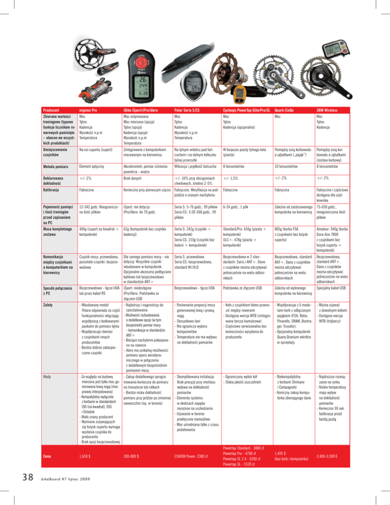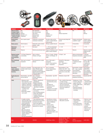 38 Producent ergomo Pro iBike iSport/iPro/iAero Polar Seria S/CS Cycleops PowerTap Elite/Pro/SL Quark CinQo SRM Wireless Zbierane wartości treningowe (typowe funkcje liczników rowerowych pominięto – obecne we wszystkich produktach) Moc Tętno Kadencja Wysokość n.p.m Temperatura Moc estymowana Moc mierzona (opcja) Tętno (opcja) Kadencja (opcja) Wysokość n.p.m Temperatura Moc Tętno Kadencja Wysokość n.p.m Temperatura Moc Tętno Kadencja (opcjonalna) Moc Moc Tętno Kadencja Umiejscowienie czujników Na osi suportu (suport) Zintegrowane z komputerkiem mocowanym na kierownicy Na tylnym widelcu pod łańcuchem i na dolnym kółeczku tylnej przerzutki W korpusie piasty tylnego koła (piasta) Pomiędzy osią korbowodu a zębatkami („pająk”) Pomiędzy osią korbowodu a zębatkami (zestaw korbowy) Metoda pomiaru Element optyczny Akcelerometr, pomiar ciśnienia powietrza - wiatru Wibracja i prędkość łańcucha 8 tensometrów 10 tensometrów 8 tensometrów Deklarowana dokładność +/- 2% Brak danych +/- 10% przy obciążeniach chwilowych, średnio 2-5% +/- 1,5% +/- 2% +/- 2% Kalibracja Fabryczna Konieczna przy pierwszym użyciu Fabryczna. Weryfikacja na pod- Fabryczna jeździe o znanym nachyleniu Fabryczna Fabryczna i częściowo dostępna dla użytkownika Pojemność pamięci i ilość treningów przed zapisaniem na PC 12-342 godz. Nieograniczona ilość plików iSport: nie dotyczy iPro/iAero: do 70 godz. Seria S: 5-76 godz., 99 plików Seria CS: 3:20-368 godz., 99 plików 6-24 godz., 1 plik Zależna od zastosowanego komputerka na kierownicę 75-650 godz., nieograniczona ilość plików Masa kompletnego zestawu 404g (suport na kwadrat + komputerek) 62g (komputerek bez czujnika kadencji) Seria S: 242g (czujniki + komputerek) Seria CS: 210g (czujniki bez baterii + komputerek) Standard/Pro: 656g (piasta + komputerek) SLC+: 478g (piasta + komputerek) 805g (korba FSA z czujnikami bez łożysk suportu) Amateur: 940g (korba Dura-Ace 7800 z czujnikami bez łożysk suportu + komputerek) Komunikacja między czujnikami a komputerkiem na kierownicy Czujnik mocy: przewodowa, pozostałe czujniki: bezprzewodowa Dla samego pomiaru mocy - nie Seria S: przewodowa dotyczy. Wszystkie czujniki Seria CS: bezprzewodowa, wbudowane w komputerek. standard W.I.N.D Opcjonalne akcesoria podłączane kablowo lub bezprzewodowo w standardzie ANT+ Bezprzewodowa w 2 standardach: Saris i ANT+. Dane z czujników można odczytywać jednocześnie na wielu odbiornikach Bezprzewodowa, standard ANT+. Dane z czujników można odczytywać jednocześnie na wielu odbiornikach Bezprzewodowa, standard ANT+. Dane z czujników można odczytywać jednocześnie na wielu odbiornikach Sposób połączenia z PC Bezprzewodowo - łącze IrDA iSport: niedostępna lub przez kabel RS iPro/iAero: Podstawka ze złączem USB Bezprzewodowo - łącze IrDA Podstawka ze złączem USB Zależny od wybranego komputerka na kierownicę Specjalny kabel USB Zalety - Wbudowany moduł Polara odpowiada za część funkcjonalności włączając współpracę z kodowanymi paskami do pomiaru tętna - Współpracuje również z czujnikami innych producentów - Bardzo dobrze zabezpieczone czujniki - Najtańszy i najprostszy do zainstalowania - Możliwość rozbudowania o dodatkowe opcje (w tym bezpośredni pomiar mocy - komunikacja w standardzie ANT+ - Bieżące nachylenie pokazywane na rowerze - iAero ma unikalną możliwości pomiaru oporu aerodynamicznego w połączeniu z dodatkowym bezpośrednim pomiarem mocy - Porównanie proporcji mocy generowanej lewą i prawą nogą - Stosunkowo tani - Nie ogranicza wyboru komponentów - Temperatura nie ma wpływu na dokładność pomiarów - Koło z czujnikiem łatwo przeno- - Współpracuje z 6 mode- - Można używać sić między rowerami lami korb z odłączanym z dowolnymi kołami - Dostępna wersja MTB (zintegro- pająkiem (FSA, Rotor, - Dostępna wersja wana tarcza hamulcowa) Pinarello, SRAM, BontraMTB (trójtarcz) - Częściowo serwisowalna bez ger, Truvativ). konieczności wysyłania do - Opcjonalny komputerek producenta Quarq Qranium wkrótce w sprzedaży Wady - Ze względu na budowę mierzona jest tylko moc generowana lewą nogą (moc prawej interpolowana) - Kompatybilny wyłącznie z korbami w standardach ISO (na kwadrat), ISIS i Octalink - Mało znany producent - Wymiana zużywających się łożysk suportu wymaga wysłania czujnika do producenta - Brak opcji bezprzewodowej - Skomplikowana instalacja. - Zakup dodatkowego oprogramowania konieczny do pomiaru Brak precyzji przy montażu na trenażerze lub rolkach wpływa na dokładność - Bardzo niska dokładność pomiarów pomiaru przy jeździe po zmiennej - Elementy systemu nawierzchni (np. w terenie) w okolicach napędu narażone na uszkodzenia - Używanie w terenie praktycznie niemożliwe - Moc uśredniana tylko z czasu pedałowania Cena 1,650 $ 200-800 $ bi ke Bo ar d # 7 l i pi e c 2009 CS600X Power: 2380 zł - Ograniczony wybór kół - Słaba jakość uszczelnień Powertap Standard - 3880 zł Powertap Pro - 4700 zł Powertap SL 2.4 - 6260 zł Powertap SL - 5520 zł - Niekompatybilny z korbami Shimano i Campagnolo - Koniczny zakup komputerka zbierającego dane 1,495 $ (bez korb i komputerka) - Najdroższe rozwiązanie na rynku - Niskie temperatury maja wpływ na dokładność pomiarów - Konieczna 30 sek. kalibracja przed każdą jazdą 2,400-3,500 €