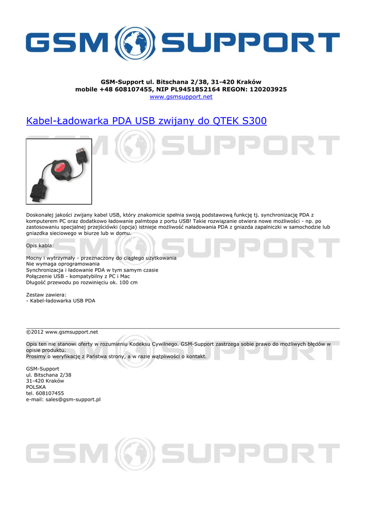 GSM-Support ul. Bitschana 2/38, 31-420 Kraków mobile +48 608107455, NIP PL9451852164 REGON: 120203925 www.gsmsupport.net Kabel-Ładowarka PDA USB zwijany do QTEK S300 Doskonałej jakości zwijany kabel USB, który znakomicie spełnia swoją podstawową funkcję tj. synchronizację PDA z komputerem PC oraz dodatkowo ładowanie palmtopa z portu USB! Takie rozwiązanie otwiera nowe możliwości - np. po zastosowaniu specjalnej przejściówki (opcja) istnieje możliwość naładowania PDA z gniazda zapalniczki w samochodzie lub gniazdka sieciowego w biurze lub w domu. Opis kabla: Mocny i wytrzymały - przeznaczony do ciągłego użytkowania Nie wymaga oprogramowania Synchronizacja i ładowanie PDA w tym samym czasie Połączenie USB - kompatybilny z PC i Mac Długość przewodu po rozwinięciu ok. 100 cm Zestaw zawiera: - Kabel-ładowarka USB PDA ©2012 www.gsmsupport.net Opis ten nie stanowi oferty w rozumieniu Kodeksu Cywilnego. GSM-Support zastrzega sobie prawo do możliwych błędów w opisie produktu. Prosimy o weryfikację z Państwa strony, a w razie wątpliwości o kontakt. GSM-Support ul. Bitschana 2/38 31-420 Kraków POLSKA tel. 608107455 e-mail: [email protected] Powered by TCPDF (www.tcpdf.org)