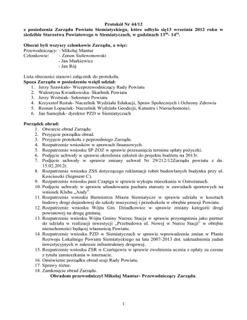 Protokół Nr 44/12 z posiedzenia Zarządu Powiatu Siemiatyckiego, które odbyło się13 września 2012 roku w siedzibie Starostwa Powiatowego w Siemiatyczach, w godzinach 1300- 1420. Obecni byli wszyscy członkowie Zarządu, a więc: Przewodniczący: - Mikołaj Mantur Członkowie: - Zenon Sielewonowski - Jan Markiewicz - Jan Rój Lista obecności stanowi załącznik do protokołu. Spoza Zarządu w posiedzeniu wzięli udział: 1. Jerzy Szawkało- Wiceprzewodniczący Rady Powiatu 2. Walentyna Kwiatkowska- Skarbnik Powiatu 3. Jerzy Woźniak- Sekretarz Powiatu 4. Krzysztof Rożuk- Naczelnik Wydziału Edukacji, Spraw Społecznych i Ochrony Zdrowia 5. Roman Łopaciuk- Naczelnik Wydziału Geodezji, Katastru i Nieruchomości. 6. Jan Samojluk- dyrektor PZD w Siemiatyczach Porządek obrad: 1. Otwarcie obrad Zarządu. 2. Przyjęcie porządku obrad. 3. Przyjęcie protokołu z poprzedniego Zarządu. 4. Rozpatrzenie wniosków w sprawach finansowych. 5. Rozpatrzenie wniosku SP ZOZ w sprawie przesunięcia terminu spłaty pożyczki. 6. Podjęcie uchwały w sprawie określenia założeń do projektu budżetu na 2013r. 7. Podjęcie uchwały w sprawie zmiany uchwał Nr 29/212/12Zarządu powiatu z dn. 15.02.2012r. 8. Rozpatrzenie wniosku ZSS dotyczącego reklamacji robót budowlanych budynku przy ul. Kościuszki (Segment C). 9. Rozpatrzenie wniosku pani Czapiga w sprawie wykupu mieszkania w Ostrożanach. 10. Podjęcie uchwały w sprawie ufundowania pucharu starosty w zawodach sportowych na wniosek Klubu „Andy”. 11. Rozpatrzenie wniosku Burmistrza Miasta Siemiatycze w sprawie udziału w kosztach budowy drogi dojazdowej do szkoły muzycznej i przedszkola w obrębie posesji Powiatu. 12. Rozpatrzenie wniosku Wójta Gm. Dziadkowice w sprawie zmiany kategorii drogi powiatowej na drogę gminną. 13. Rozpatrzenie wniosku Wójta Gminy Nurzec Stacja w sprawie przystąpienia jako partner do udziału w realizacji inwestycji „Przebudowa ul. Nowej w Nurcu Stacji” w obrębie nieruchomości będącej własnością Powiatu. 14. Rozpatrzenie wniosku PZD w Siemiatyczach w sprawie wprowadzenia zmian w Planie Rozwoju Lokalnego Powiatu Siemiatyckiego na lata 2007-2013 dot. uaktualnienia zadań inwestycyjnych w zakresie infrastruktury drogowej. 15. Rozpatrzenie wniosku ZSR w Czartajewie w sprawie zwolnienia ucznia z opłaty za czesne z tytułu zamieszkania w internacie. 16. Omówienie porządku obrad sesji Rady Powiatu. 17. Sprawy różne. 18. Zamknięcie obrad Zarządu. Obradom przewodniczył Mikołaj Mantur- Przewodniczący Zarządu. 1 Ad. 1 Przewodniczący Zarządu dokonał otwarcia obrad. Przywitał wszystkich członków Zarządu oraz osoby pozostałe biorące udział w posiedzeniu. Ad. 2 Porządek obrad znajdujący się we wstępie został przyjęty jednogłośnie. Ad. 3 Protokół z poprzedniego posiedzenia Zarządu przyjęto w wersji w jakiej został sporządzony. Ad. 4 Rozpatrzenie wniosków w sprawach finansowych. Pani Skarbnik przedstawiła członkom Zarządu wnioski w sprawach finansowych z następujących jednostek: Zespół Szkół Specjalnych w Siemiatyczach zwraca się z prośbą o zwiększenie środków budżetowych o kwotę 55.470,00zł z tytułu niezbędnych wydatków związanych z doposażeniem nowej siedziby Zespołu, zlokalizowanej przy ul. T. Kościuszki 43. dokonanie tych wydatków wynika z konieczności zakupu tablic szkolnych, zakupem drabinek gimnastycznych, zakupem koszty i ławeczek z przeznaczeniem na plac przyszkolny. Jak dodała pani Skarbnik został już jakiś czas temu złożony wniosek do subwencji rezerwy oświatowej na kwotę ok. 200.000,00zł m.in. na dostosowanie pomieszczeń w nowej siedzibie do potrzeb ZSS. W związku z tym, że są to wydatki niezbędne do prawidłowego funkcjonowania placówki pani Skarbnik zaproponowała, aby na tę chwilę wygospodarować kwotę 50.000,00zł, a w momencie uzyskania środków z rezerwy subwencji oświatowej poniesione koszty staną sie kosztami kwalifikowanymi. Zarząd Powiatu jednogłośnie wyraził zgodę dokonanie zmian w planie finansowym ZSS w Siemiatyczach zgodnie z propozycja pani Skarbnik. ZSR w Czartajewie zwraca się z prośba o dokonanie zmian w planie finansowym jednostki. Zmiana wynika z większych wpływów o kwotę 409.000,00zł w gospodarstwie. Jednostka zwraca się z wnioskiem o skierowanie środków w kwocie ok. 206.000,00zl na zakupy bieżące m.in. paszy dla zwierząt, dalej kwotę 75.000,00zł skierować na szkołę i zakupy związane m.in z zakupem ciepła oraz kwota 28.000,00zl, która będzie skierowana na zakup tapczanów i wyposażenia do pokoi sypialnianych w internacie w związku z większą liczba wychowanków. Zarząd Powiatu jednogłośnie wyraził zgodę na dokonanie zmian w planie finansowym jednostki. Warsztaty Terapii Zajęciowej w Siemiatyczach, jak wyjaśnił pani Skarbnik, wystąpiły z wnioskiem o zmianę przeznaczenia kwoty 400zł, które zgodnie z pismem PCPR miały zostać przeznaczone na wyposażenie kuchni, ponieważ szafki do kuchni zostały nieodpłatnie im przekazane. Za tę kwotę chcą kupić 2 fotele biurowe. Zarząd Powiatu bez zastrzeżeń przychylił się do wniosku. Wpłynął również wniosek ZSS w Siemiatyczach z prośba o zwiększenie środków budżetowych na kwotę 55.470,00zł z tytułu niezbędnych wydatków związanych z doposażeniem nowej siedziby szkoły. W związku z pilnymi potrzebami jednostki pani Skarbnik zaproponowała, aby zwiększyć plan wydatków o kwotę 50.000,00zł. Zarząd Powiatu podjął decyzję o zwiększeniu planu wydatków ZSS w Siemiatyczach o kwotę 50.000,00zł. kolejnym wnioskiem, który przedstawiła pani Skarbnik, jest wniosek Powiatowego Urzędu Pracy w Siemiatyczach w sprawie dokonania zmian w planie wydatków w zakresie realizowanych projektów w ramach POKL 20072013, tj. „Przyjazny Urząd Pracy i kompetentny pracownik- Bliżej bezrobotnego”- zmniejszenie wydatków o kwotę 0,03zł oraz „Otwarci na Zmiany-działania na rzecz aktywizacji zawodowej