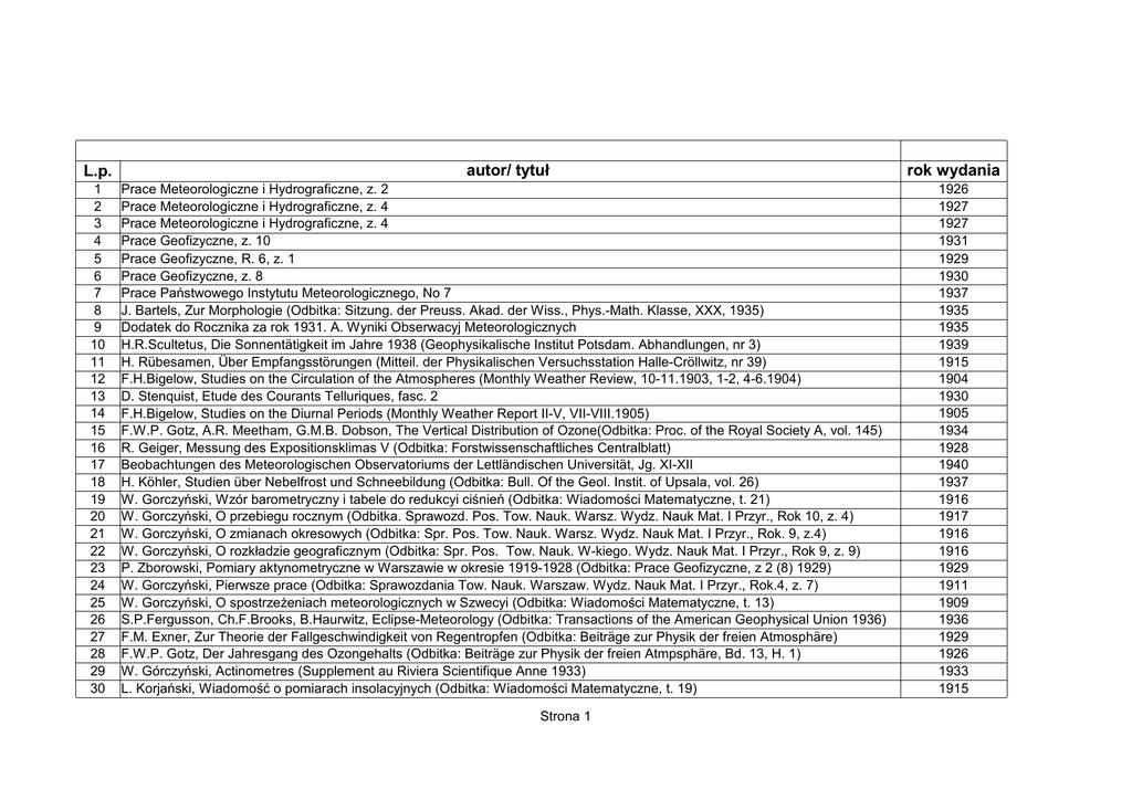 L.p. 1 2 3 4 5 6 7 8 9 10 11 12 13 14 15 16 17 18 19 20 21 22 23 24 25 26 27 28 29 30 autor/ tytuł Prace Meteorologiczne i Hydrograficzne, z. 2 Prace Meteorologiczne i Hydrograficzne, z. 4 Prace Meteorologiczne i Hydrograficzne, z. 4 Prace Geofizyczne, z. 10 Prace Geofizyczne, R. 6, z. 1 Prace Geofizyczne, z. 8 Prace Państwowego Instytutu Meteorologicznego, No 7 J. Bartels, Zur Morphologie (Odbitka: Sitzung. der Preuss. Akad. der Wiss., Phys.-Math. Klasse, XXX, 1935) Dodatek do Rocznika za rok 1931. A. Wyniki Obserwacyj Meteorologicznych H.R.Scultetus, Die Sonnentätigkeit im Jahre 1938 (Geophysikalische Institut Potsdam. Abhandlungen, nr 3) H. Rübesamen, Über Empfangsstörungen (Mitteil. der Physikalischen Versuchsstation Halle-Cröllwitz, nr 39) F.H.Bigelow, Studies on the Circulation of the Atmospheres (Monthly Weather Review, 10-11.1903, 1-2, 4-6.1904) D. Stenquist, Etude des Courants Telluriques, fasc. 2 F.H.Bigelow, Studies on the Diurnal Periods (Monthly Weather Report II-V, VII-VIII.1905) F.W.P. Gotz, A.R. Meetham, G.M.B. Dobson, The Vertical Distribution of Ozone(Odbitka: Proc. of the Royal Society A, vol. 145) R. Geiger, Messung des Expositionsklimas V (Odbitka: Forstwissenschaftliches Centralblatt) Beobachtungen des Meteorologischen Observatoriums der Lettländischen Universität, Jg. XI-XII H. Köhler, Studien über Nebelfrost und Schneebildung (Odbitka: Bull. Of the Geol. Instit. of Upsala, vol. 26) W. Gorczyński, Wzór barometryczny i tabele do redukcyi ciśnień (Odbitka: Wiadomości Matematyczne, t. 21) W. Gorczyński, O przebiegu rocznym (Odbitka. Sprawozd. Pos. Tow. Nauk. Warsz. Wydz. Nauk Mat. I Przyr., Rok 10, z. 4) W. Gorczyński, O zmianach okresowych (Odbitka: Spr. Pos. Tow. Nauk. Warsz. Wydz. Nauk Mat. I Przyr., Rok. 9, z.4) W. Gorczyński, O rozkładzie geograficznym (Odbitka: Spr. Pos. Tow. Nauk. W-kiego. Wydz. Nauk Mat. I Przyr., Rok 9, z. 9) P. Zborowski, Pomiary aktynometryczne w Warszawie w okresie 1919-1928 (Odbitka: Prace Geofizyczne, z 2 (8) 1929) W. Gorczyński, Pierwsze prace (Odbitka: Sprawozdania Tow. Nauk. Warszaw. Wydz. Nauk Mat. I Przyr., Rok.4, z. 7) W. Gorczyński, O spostrzeżeniach meteorologicznych w Szwecyi (Odbitka: Wiadomości Matematyczne, t. 13) S.P.Fergusson, Ch.F.Brooks, B.Haurwitz, Eclipse-Meteorology (Odbitka: Transactions of the American Geophysical Union 1936) F.M. Exner, Zur Theorie der Fallgeschwindigkeit von Regentropfen (Odbitka: Beiträge zur Physik der freien Atmosphäre) F.W.P. Gotz, Der Jahresgang des Ozongehalts (Odbitka: Beiträge zur Physik der freien Atmpsphäre, Bd. 13, H. 1) W. Górczyński, Actinometres (Supplement au Riviera Scientifique Anne 1933) L. Korjański, Wiadomość o pomiarach insolacyjnych (Odbitka: Wiadomości Matematyczne, t. 19) Strona 1 rok wydania 1926 1927 1927 1931 1929 1930 1937 1935 1935 1939 1915 1904 1930 1905 1934 1928 1940 1937 1916 1917 1916 1916 1929 1911 1909 1936 1929 1926 1933 1915 31 32 33 34 35 36 37 38 39 40 41 42 43 44 45 46 47 48 49 50 51 52 53 54 55 56 57 58 59 60 61 62 63 64 65 66 W. Gorczyński, O uprzywilejowanym charakterze usłonecznienia (Odbitka: Sprawozd. Pos. Tow. Nauk. Warsz. 31, Wydział III) H. Köhler, Űber den Austausch zwischen Unterlage und Luft. Erste Mitteilung (Odbitka: Gerlands Beiträge zur Geophysik), Bd 24 E. Stenz, Widmo słoneczne a człowiek F. Schanz, Das Ultraviolet im Tageslicht und im Licht künstlicher Lichtquellen (Nadbitka: Photographischen Korrespondenz, Nr 725) D. Szymkiewicz, Etudes clomatologiques XXI-XXII (Odbitka: Acta Societatis Botanicorum Poloniae, vol. 8, nr 3-4) D. Szymkiewicz, Etudes climatologiques VII-X (Odbitka: Acta Societatis Botanicorum Poloniae, vol. 4, nr 1) W. Gorczyński, Kilka wyników z wypraw aktynometrycznych (Odbitka: Rocznik Astronomiczny Obserwatorjum Krakowskiego) E. Stenz, Porównania aktynometryczno-pyrheliometryczne (Odbitka: Kosmos) E. Stenz, Polska wyprawa astronomiczna do Laponji na zaćmienie słońca 29.VI.1927 r. (Odbitka: Mathesis Polska, t. 2, z. 9-10) E. Stenz, O zakłóceniach przezroczystości atmosfery ziemskiej (Kosmos, t. 51, z. 1-4) E. Stenz, O przebiegu promieniowania słonecznego (Odbitka: Rocznik Astr. Obserwatorjum Krakowskiego na rok 1923, t. 2) E. Stenz, O zakłóceniach przezroczystości atmosfery ziemskiej (Kosmos, t. 51, z. 1-4) A. Schneider, Trübungsfaktor und Trübungsdiagramm (Odbitka: Gerlands Beiträge zur geophysik, Bd. 51, H. 1) E. Stenz, Przyczynek do teorji aktynometru (Odbitka: Sprawozdania i Prace Polskiego Towarzystwa Fizycznego, z. 5) H. Arctowski, A Study of the Changes in the Distribution of Temperature (Odbitka: Ann. of the NY Academy of Sc., vol. 24, 39-113) J. Bartels, Die Strahlung und ihre Bedeutung für das Klima (Nadbitka: Zeitschrift für Forst- und Jagdwesen 1930, Heft 7/8) W. Gorczyński, Sur le valeurs elevees et les pertes d'energie (Odbitka: Bulletin de l'Acad. Polon. des Sc. Serie A: Sc. Math.) Institut für Hochgebirgs-Physiologie und Tuberkuloseforschung in Davos, Heft 1 (C. Dorno, Allgemeines...) Fritz-Holm Bielich, Einfluss der Grosstandttrübung auf Sicht und Sonnenstrahlung C. Dorno, Die physikalischen Grundlagen der Sonnen- und Himmelsstrahling (Nadbitka: Strahlentherapie, Band 18) MM. Dedebant, Schereschewsky, Wehrle, Sur l'application au soleil du principe(Nadbitka: La Meteorologie, no 122) W. Gorczyński, Actinometros termo-electricos (Servicio Meteorologica Mexicano. Observatorio central, folleto num. 1) Ch. Jensen, Beiträge zur Photometrie des Himmels F.W.Paul Götz, Die kürzeste Wellenlänge des Sonnenlichts (Odbitka: Strahlentherapie, Bd. 40) P. Ludewig, Die Messung vertikaler Luftströmungen J. Letzmann, Richtlinien zur Erforschung von Tromben, Tornados, Wasserhose und Kleintromben J.C.Schoute, Professor Moll's method (Odbitka: Recueil des Travaux Botaniques Neerlandais, vol. 32) M. Sperer, Der Campbell-Stokessche Sonnenscheinautograph, Teil 2 M. Sperer, Der Campbell-Stokessche Sonnenscheinautograph, Teil 1 C. G. Abott, The Silver Disk Pyrhel