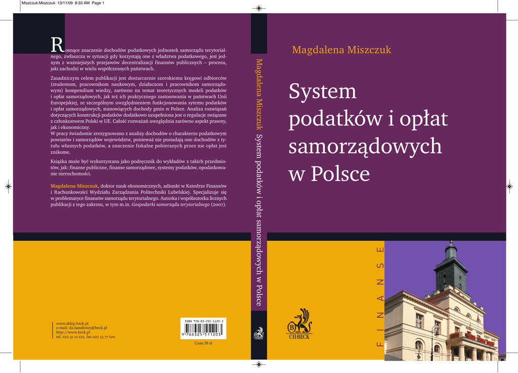 Miszczuk:Miszczuk 13/11/09 8:33 AM Page 1 R E S N Magdalena Miszczuk, doktor nauk ekonomicznych, adiunkt w Katedrze Finansów i RachunkowoÊci Wydzia∏u Zarzàdzania Politechniki Lubelskiej. Specjalizuje si´ w problematyce finansów samorzàdu terytorialnego. Autorka i wspó∏autorka licznych publikacji z tego zakresu, w tym m.in. Gospodarki samorzàdu terytorialnego (2007). N Ksià˝ka mo˝e byç wykorzystana jako podr´cznik do wyk∏adów z takich przedmiotów, jak: finanse publiczne, finanse samorzàdowe, systemy podatków, opodatkowanie nieruchomoÊci. System podatków i op∏at samorzàdowych w Polsce A Zasadniczym celem publikacji jest dostarczenie szerokiemu kr´gowi odbiorców (studentom, pracownikom naukowym, dzia∏aczom i pracownikom samorzàdowym) kompendium wiedzy, zarówno na temat teoretycznych modeli podatków i op∏at samorzàdowych, jak te˝ ich praktycznego zastosowania w paƒstwach Unii Europejskiej, ze szczególnym uwzgl´dnieniem funkcjonowania sytemu podatków i op∏at samorzàdowych, stanowiàcych dochody gmin w Polsce. Analiza rozwiàzaƒ dotyczàcych konstrukcji podatków dodatkowo uzupe∏niona jest o regulacje zwiàzane z cz∏onkostwem Polski w UE. Ca∏oÊç rozwa˝aƒ uwzgl´dnia zarówno aspekt prawny, jak i ekonomiczny. W pracy Êwiadomie zrezygnowano z analizy dochodów o charakterze podatkowym powiatów i samorzàdów województw, poniewa˝ nie posiadajà one dochodów z tytu∏u w∏asnych podatków, a znaczenie fiskalne pobieranych przez nie op∏at jest znikome. Magdalena Miszczuk Magdalena Miszczuk System podatków i op∏at samorzàdowych w Polsce osnàce znaczenie dochodów podatkowych jednostek samorzàdu terytorialnego, zw∏aszcza w sytuacji gdy korzystajà one z w∏adztwa podatkowego, jest jednym z wa˝niejszych przejawów decentralizacji finansów publicznych – procesu, jaki zachodzi w wielu wspó∏czesnych paƒstwach. Cena 39 z∏ F I www.sklep.beck.pl e-mail: [email protected] http://www.beck.pl tel. 022 31 12 222, fax 022 33 77 601 strMiszczuk:strMiszczuk 4/11/09 1:43 PM Page 1 System podatków i op∏at samorzàdowych w Polsce F I N A N S E strMiszczuk:strMiszczuk 4/11/09 1:43 PM Page 2 strMiszczuk:strMiszczuk 4/11/09 1:43 PM Page 3 Magdalena Miszczuk System podatków i op∏at samorzàdowych w Polsce Wydawnictwo C.H. Beck Warszawa 2009 Wydawca: Dorota Ostrowska-Furmanek Redakcja merytoryczna: Alicja Chrabąszcz-Kusiak Recenzent: prof. dr hab. Maria Kosek-Wojnar Projekt okładki i stron tytułowych: GRAFOS Ilustracja na okładce: © Marcin Kamiński/iStockphoto.com Seria: Finanse Podseria: Finanse publiczne, lokalne, podatki © Wydawnictwo C.H. Beck 2009 Wydawnictwo C.H. Beck Sp. z o.o., ul. Bonifraterska 17, 00-203 Warszawa Skład i łamanie: IDENTIA Michał Majchrzak Druk i oprawa: Studio Spartan, Gdynia ISBN 978-83-255-1120-3 Spis treści Wstęp.......................................................................................................................... 1. Podatki i opłaty samorządowe w systemie dochodów publicznych ................. 1.1. Dochody samorządowe – modele i klasyfikacje ............................................. 1.2. Pojęcie oraz klasyfikacja podatków i opłat samorządowych .......................... 1.3. Polski system podatków i opłat lokalnych na tle systemów podatkowych innych państw UE ......................................................................................... 1.4. Funkcje podatków i opłat samorządowych .................................................... 2. Podatki samorządowe o stawkach uchwalanych przez gminę . ........................ 2.1. Podatek od nieruchomości . ........................................................................... 2.2. Podatek rolny ................................................................................................ 2.3. Podatek leśny ................................................................................................ 2.4. Podatek od środków transportowych . ........................................................... 3. Podatki samorządowe o stawkach nie uchwalanych przez gminę ................... 3.1. Karta podatkowa ........................................................................................... 3.2. Podatek od spadków i darowizn .................................................................... 3.3. Podatek od czynności cywilnoprawnych . ...................................................... 4. Opłaty samorządowe o stawkach uchwalanych przez gminę ........................... 4.1. Opłata targowa . ............................................................................................ 4.2. Opłata miejscowa i uzdrowiskowa . ............................................................... 4.3. Opłata od posiadania psów ........................................................................... 4.4. Opłaty planistyczna ....................................................................................... 4.5. Opłata adiacencka ......................................................................................... 5. Opłaty samorządowe o stawkach nie uchwalanych przez gminę ..................... 5.1. Opłata skarbowa . ........................................................................................ 5.2. Opłata eksploatacyjna ................................................................................... Zakończenie .............................................................................................................. Załączniki . ................................................................................................................ Załącznik 1. Wykaz gmin i miast zaliczonych do jednego z czterech okręgów podatkowych ................................................................................... Załącznik 2. Stawki karty podatkowej obowiązujące w 2009 r. ............................ Załącznik 3. Przedmiot, stawki i zwolnienia w o