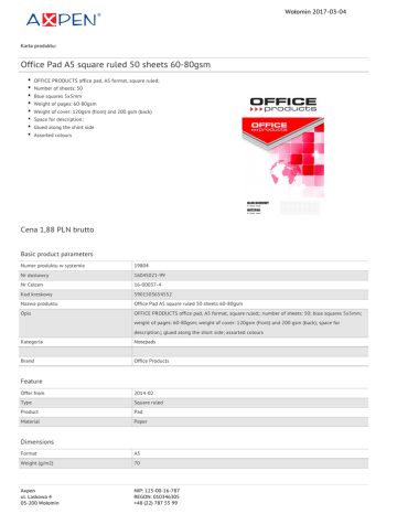 Wołomin 2017-03-04 Karta produktu: Office Pad A5 square ruled 50 sheets 60-80gsm OFFICE PRODUCTS office pad, A5 format, square ruled; Number of sheets: 50 Blue squares 5x5mm Weight of pages: 60-80gsm Weight of cover: 120gsm (front) and 200 gsm (back) Space for description; Glued along the short side Assorted colours Cena 1,88 PLN brutto Basic product parameters Numer produktu w systemie 19804 Nr dostawcy 16045021-99 Nr Celcen 16-00037-4 Kod kreskowy 5901503654552 Nazwa produktu Office Pad A5 square ruled 50 sheets 60-80gsm Opis OFFICE PRODUCTS office pad, A5 format, square ruled;; number of sheets: 50; blue squares 5x5mm; weight of pages: 60-80gsm; weight of cover: 120gsm (front) and 200 gsm (back); space for description;; glued along the short side; assorted colours Kategoria Notepads Brand Office Products Feature Offer from 2014-02 Type Square ruled Product Pad Material Paper Dimensions Format A5 Weight (g/m2) 70 Axpen ul. Laskowa 4 05-200 Wołomin NIP: 125-00-16-787 REGON: 010346305 +48 (22) 787 55 99 Wołomin 2017-03-04 Karta katalogowa produktu cd. Office Pad A5 square ruled 50 sheets 60-80gsm Replacement Replacement 7537001PL-99 Procurement vocabulary CPV 22815000-6 Notatniki Certifications Hit Hit New product Standard Amount Number of sheets 50 Colour Colour Assorted colours Serdecznie zapraszamy do współpracy Axpen zespół. Axpen ul. Laskowa 4 05-200 Wołomin NIP: 125-00-16-787 REGON: 010346305 +48 (22) 787 55 99