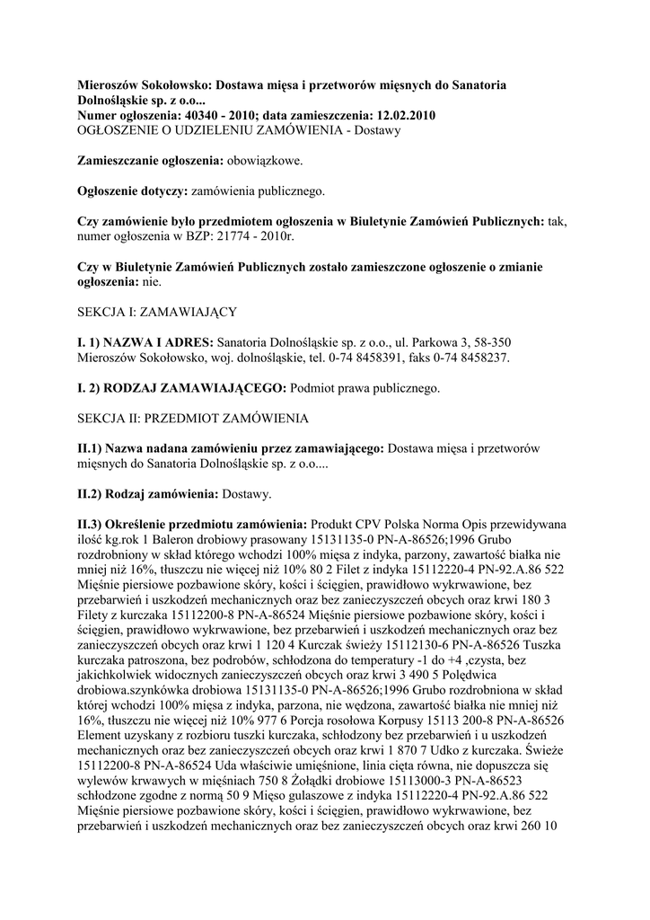 Mieroszów Sokołowsko: Dostawa mięsa i przetworów mięsnych do Sanatoria Dolnośląskie sp. z o.o... Numer ogłoszenia: 40340 - 2010; data zamieszczenia: 12.02.2010 OGŁOSZENIE O UDZIELENIU ZAMÓWIENIA - Dostawy Zamieszczanie ogłoszenia: obowiązkowe. Ogłoszenie dotyczy: zamówienia publicznego. Czy zamówienie było przedmiotem ogłoszenia w Biuletynie Zamówień Publicznych: tak, numer ogłoszenia w BZP: 21774 - 2010r. Czy w Biuletynie Zamówień Publicznych zostało zamieszczone ogłoszenie o zmianie ogłoszenia: nie. SEKCJA I: ZAMAWIAJĄCY I. 1) NAZWA I ADRES: Sanatoria Dolnośląskie sp. z o.o., ul. Parkowa 3, 58-350 Mieroszów Sokołowsko, woj. dolnośląskie, tel. 0-74 8458391, faks 0-74 8458237. I. 2) RODZAJ ZAMAWIAJĄCEGO: Podmiot prawa publicznego. SEKCJA II: PRZEDMIOT ZAMÓWIENIA II.1) Nazwa nadana zamówieniu przez zamawiającego: Dostawa mięsa i przetworów mięsnych do Sanatoria Dolnośląskie sp. z o.o.... II.2) Rodzaj zamówienia: Dostawy. II.3) Określenie przedmiotu zamówienia: Produkt CPV Polska Norma Opis przewidywana ilość kg.rok 1 Baleron drobiowy prasowany 15131135-0 PN-A-86526;1996 Grubo rozdrobniony w skład którego wchodzi 100% mięsa z indyka, parzony, zawartość białka nie mniej niŜ 16%, tłuszczu nie więcej niŜ 10% 80 2 Filet z indyka 15112220-4 PN-92.A.86 522 Mięśnie piersiowe pozbawione skóry, kości i ścięgien, prawidłowo wykrwawione, bez przebarwień i uszkodzeń mechanicznych oraz bez zanieczyszczeń obcych oraz krwi 180 3 Filety z kurczaka 15112200-8 PN-A-86524 Mięśnie piersiowe pozbawione skóry, kości i ścięgien, prawidłowo wykrwawione, bez przebarwień i uszkodzeń mechanicznych oraz bez zanieczyszczeń obcych oraz krwi 1 120 4 Kurczak świeŜy 15112130-6 PN-A-86526 Tuszka kurczaka patroszona, bez podrobów, schłodzona do temperatury -1 do +4 ,czysta, bez jakichkolwiek widocznych zanieczyszczeń obcych oraz krwi 3 490 5 Polędwica drobiowa.szynkówka drobiowa 15131135-0 PN-A-86526;1996 Grubo rozdrobniona w skład której wchodzi 100% mięsa z indyka, parzona, nie wędzona, zawartość białka nie mniej niŜ 16%, tłuszczu nie więcej niŜ 10% 977 6 Porcja rosołowa Korpusy 15113 200-8 PN-A-86526 Element uzyskany z rozbioru tuszki kurczaka, schłodzony bez przebarwień i u uszkodzeń mechanicznych oraz bez zanieczyszczeń obcych oraz krwi 1 870 7 Udko z kurczaka. ŚwieŜe 15112200-8 PN-A-86524 Uda właściwie umięśnione, linia cięta równa, nie dopuszcza się wylewów krwawych w mięśniach 750 8 śołądki drobiowe 15113000-3 PN-A-86523 schłodzone zgodne z normą 50 9 Mięso gulaszowe z indyka 15112220-4 PN-92.A.86 522 Mięśnie piersiowe pozbawione skóry, kości i ścięgien, prawidłowo wykrwawione, bez przebarwień i uszkodzeń mechanicznych oraz bez zanieczyszczeń obcych oraz krwi 260 10 Serca drobiowe 15114000-0 PN-A-86523 Serca pozbawione osierdzia i pni naczyń krwionośnych, bez skrzepów krwi, schłodzone do temperatury +4 80. Produkt CPV Polska Norma Opis przewidywana ilość kg.rok 11 Boczek surowy 15131220-3 PN-A-82007;1996 Mięso schłodzone, nie mroŜone, spełniające wymagania normy 180 12 Boczek wędz.parzony 15131220-3 PN-A-82007;1996 Boczek wieprzowy wędzony parzony bez widocznych załogów solanki 140 13 Flaki woł. krojone luz 15114000-0 PN 86.A82004 Zgodne z normą, opakowanie pierwotne- worki PAPE (pakowane w modyfikow. atmosferze ) 240 14 Karkówka b.k 15113000-3 PN 86.A82002 Element uzyskany zgodnie z normą ze sztuk młodych schłodzony, nie mroŜony 865 15 Łopatka b.k bez skóry 15113000-3 PN 86.A82002 Mięso z łopatki odtłuszczone oraz pozbawione ścięgien i tłuszczu śródmięśniowego 1 170 16 Mieso mielone wieprzowe 15110000-2 PN-65.A-82000 Zawartość tłuszczu nie więcej niŜ 30%, zawartośc kolagenu w stosunku do zawartości białka nie więcej niŜ 18% 180 17 Mięso gulaszowe wieprzowe 15113300-6 PN-A 82011 Mięso schłodzone, nie mroŜone, spełniające wymagania normy 2 900 18 Polęd. sopocka wieprz 15131133-6 PN-A-82007;1996 Wędzonka wieprzowa całomięśniowa, otrzymywana ze schabu obrobionego, zawartość białka nie mniej niŜ 18%, tłuszczu nie więcej niŜ 8% 84 19 Schab b.k 15113000-3 PN 86.A82002 Mięso schłodzone, nie mroŜone, spełniające wymagania normy 810 20 Schab z kością 15113100-4 PN 86.A82002 Mięso schłodzone, nie mroŜone, spełniające wymagania normy 360 21 Słonina PN-86.A-82002 Mięso schłodzone, nie mroŜone, spełniające wymagania normy 750 22 Smalec 15412100-0 PN-90.A-85802 Mięso schłodzone, nie mroŜone, spełniające wymagania normy 465 23 Wątroba wieprzowa 15112300-0 PN-86.A-82004 Mięso schłodzone, nie mroŜone, spełniające wymagania normy 640 24 śeberka, mostki wieprzowe 15113000-3 PN-A-82002 Mięso schłodzone, nie mroŜone, spełniające wymagania normy 65 L.p. Produkt CPV Polska Norma Opis przewidywana ilość kg.rok 25 Blok Tyrolski 15131133-6 PN-A-82007;1996 Średnio rozdrobniony wieprzowo (80%)- wołowa (20%), parzona , w osłonce poliamidowej, zawartość białka nie mniej niŜ 10%, tłuszczu nie więcej niŜ 30% 335 26 Kaszanka 15131134-3 PN-A-82007;1996 Kaszanka z podrobów wieprzowych, w osłonce naturalnej - kiełbaśnicy, zawartość tłuszczu nie więcej niŜ 40% 500 27 Kiełbasa biała parzona 15131133-6 PN-A-82007;1996 Średnio rozdrobniona surowa; wieprzowo (90%)- wołowa (10%) , w osłonce naturalnej zawartość białka nie mniej niŜ 12%, tłuszcz nie więcej niŜ 30% ,wody nie więcej niŜ 66% 95 28 Kiełbasa podwawelska 151311336 PN-A-82007;1996 Średnio rozdrobniona wieprzowa, wędzona, parzona , w osłonce naturalnej - kiełbaśnicy, zawartość białka nie mniej niŜ 13%, tłuszczu nie więcej niŜ 35% 150 29 Kiełbasa sucha krakowska 15131133-6 PN-A-82028;2002 Grubo rozdrobniona; czysto wieprzowa podsuszana do uzyskania 65% wydajności w stosunku do surowca , zawartość białka nie mniej niŜ 18% , tłuszczu nie więcej niŜ 30% 25 30 Kiełbasa szynkowa 15131133-6 PN-A-82007;1996 Grubo rozdrobniona; czy