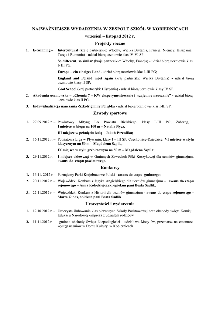 NAJWAŻNIEJSZE WYDARZENIA W ZESPOLE SZKÓŁ W KOBIERNICACH wrzesień – listopad 2012 r. Projekty roczne 1. E-twinning – Intercultural (kraje partnerskie: Włochy, Wielka Brytania, Francja, Niemcy, Hiszpania, Turcja i Rumunia) - udział biorą uczniowie klas IV-VI SP; So different, so sinilar (kraje partnerskie: Włochy, Francja) - udział biorą uczniowie klas I- III PG; Europa – ein einziges Land- udział biorą uczniowie klas I-III PG; England and Poland meet again (kraj partnerski: Wielka Brytania) - udział biorą uczniowie klasy II SP; Cool School (kraj partnerski: Hiszpania) - udział biorą uczniowie klasy IV SP. 2. Akademia uczniowska – „Chemia 7 – KW eksperymentowanie i wzajemne nauczanie” - udział biorą uczniowie klas II PG. 3. Indywidualizacja nauczania -Szkoły gminy Porąbka - udział biorą uczniowie klas I-III SP. Zawody sportowe 1. 27.09.2012 r. – Powiatowy Mityng LA Powiatu Bielskiego, I miejsce w biegu na 100 m – Natalia Nycz, klasy I–III PG, Zabrzeg, III miejsce w pchnięciu kulą – Jakub Pszczółka; 2. 16.11.2012 r. – Powiatowa Liga w Pływaniu, klasy I – III SP, Czechowice-Dziedzice, VI miejsce w stylu klasycznym na 50 m – Magdalena Szpila, IX miejsce w stylu grzbietowym na 50 m – Magdalena Szpila; 3. 29.11.2012 r. - I miejsce dziewcząt w Gminnych Zawodach Piłki Koszykowej dla uczniów gimnazjum, awans do etapu powiatowego. Konkursy 1. 16.11. 2012 r. - Poznajemy Parki Krajobrazowe Polski - awans do etapu gminnego; 2. 20.11.2012 r. – Wojewódzki Konkurs z Języka Angielskiego dla uczniów gimnazjum – awans do etapu rejonowego – Anna Kołodziejczyk, opiekun pani Beata Sadlik; 3. 22.11.2012 r. – Wojewódzki Konkurs z Historii dla uczniów gimnazjum - awans do etapu rejonowego – Marta Gibas, opiekun pani Beata Sadlik Uroczystości i wydarzenia 1. 12.10.2012 r. - Uroczyste ślubowanie klas pierwszych Szkoły Podstawowej oraz obchody święta Komisji Edukacji Narodowej -impreza z udziałem rodziców 2. 11.11.2012 r. – gminne obchody Święta Niepodległości - udział we Mszy św, przemarsz na cmentarz, występ uczniów w Domu Kultury w Kobiernicach