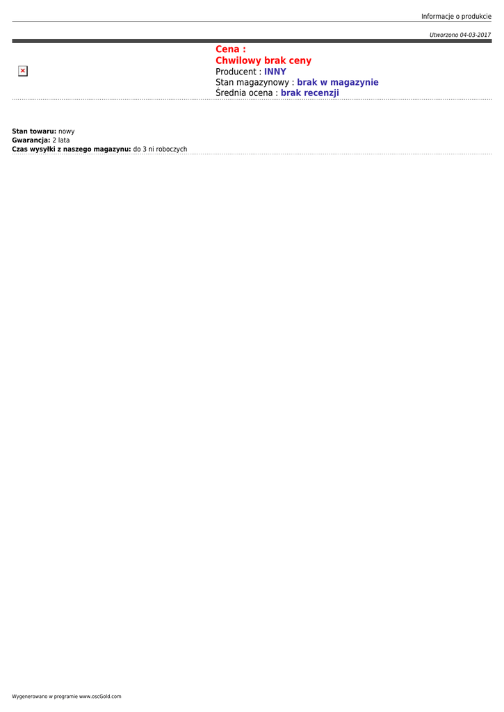 Informacje o produkcie Utworzono 04-03-2017 Cena : Chwilowy brak ceny Producent : INNY Stan magazynowy : brak w magazynie Średnia ocena : brak recenzji Stan towaru: nowy Gwarancja: 2 lata Czas wysyłki z naszego magazynu: do 3 ni roboczych Wygenerowano w programie www.oscGold.com