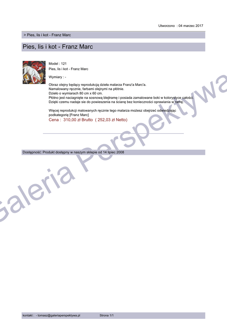 Utworzono : 04 marzec 2017 > Pies, lis i kot - Franz Marc Pies, lis i kot - Franz Marc Model : 121 Pies, lis i kot - Franz Marc a w ty Wymiary : - Obraz olejny będący reprodukcją dzieła malarza Franz'a Marc'a. Namalowany ręcznie, farbami olejnymi na płótnie. Dzieło o wymiarach 80 cm x 60 cm. Płótno jest naciagnięte na sosnową blejtramę i posiada zamalowane boki w kolorystyce całości. Dzięki czemu nadaje sie do powieszenia na ścianę bez konieczności oprawiania w ramę. k e Więcej reprodukcji malowanych ręcznie tego malarza możesz obejrzeć odwiedzając podkategorię [Franz Marc] p rs Cena : 310,00 zł Brutto ( 252,03 zł Netto) e P Dostępność: Produkt dostępny w naszym sklepie od 14 lipiec 2008 a i r e l a G kontakt : - [email protected] Strona 1/1