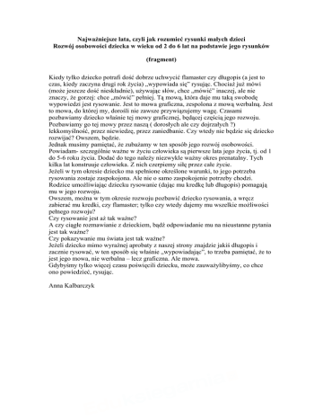 Najważniejsze lata, czyli jak rozumieć rysunki małych dzieci Rozwój osobowości dziecka w wieku od 2 do 6 lat na podstawie jego rysunków (fragment) Kiedy tylko dziecko potrafi dość dobrze uchwycić flamaster czy długopis (a jest to czas, kiedy zaczyna drugi rok życia) „wypowiada się” rysując. Chociaż już mówi (może jeszcze dość nieskładnie), używając słów, chce „mówić” inaczej, ale nie znaczy, że gorzej: chce „mówić” pełniej. Tą mową, która daje mu taką swobodę wypowiedzi jest rysowanie. Jest to mowa graficzna, zespolona z mową werbalną. Jest to mowa, do której my, dorośli nie zawsze przywiązujemy wagę. Czasami pozbawiamy dziecko właśnie tej mowy graficznej, będącej częścią jego rozwoju. Pozbawiamy go tej mowy przez naszą ( dorosłych ale czy dojrzałych ?) lekkomyślność, przez niewiedzę, przez zaniedbanie. Czy wtedy nie będzie się dziecko rozwijać? Owszem, będzie. Jednak musimy pamiętać, że zubażamy w ten sposób jego rozwój osobowości. Powiadam- szczególnie ważne w życiu człowieka są pierwsze lata jego życia, tj. od 1 do 5-6 roku życia. Dodać do tego należy niezwykle ważny okres prenatalny. Tych kilka lat konstruuje człowieka. Z nich czerpiemy siłę przez całe życie. Jeżeli w tym okresie dziecko ma spełnione określone warunki, to jego potrzeba rysowania zostaje zaspokojona. Ale nie o samo zaspokojenie potrzeby chodzi. Rodzice umożliwiając dziecku rysowanie (dając mu kredkę lub długopis) pomagają mu w jego rozwoju. Owszem, można w tym okresie rozwoju pozbawić dziecko rysowania, a wręcz zabierać mu kredki, czy flamaster; tylko czy wtedy dajemy mu wszelkie możliwości pełnego rozwoju? Czy rysowanie jest aż tak ważne? A czy ciągłe rozmawianie z dzieckiem, bądź odpowiadanie mu na nieustanne pytania jest tak ważne? Czy pokazywanie mu świata jest tak ważne? Jeżeli dziecko mimo wyraźnej aprobaty z naszej strony znajdzie jakiś długopis i zacznie rysować, w ten sposób się właśnie „wypowiadając”, to trzeba pamiętać, że to jest jego mowa, nie werbalna – lecz graficzna. Ale mowa. Gdybyśmy tylko więcej czasu poświęcili dziecku, może zauważylibyśmy, co chce ono powiedzieć, rysując. Anna Kalbarczyk