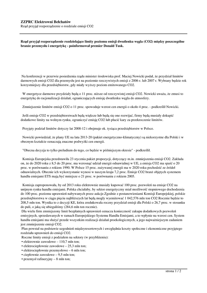 ZZPRC Elektrowni Bełchatów Rząd przyjął rozporządzenie o rozdziale emisji CO2 Rząd przyjął rozporządzenie rozdzielające limity poziomu emisji dwutlenku węgla (CO2) między poszczególne branże przemysłu i energetykę - poinformował premier Donald Tusk. Na konferencji w przerwie posiedzenia rządu minister środowiska prof. Maciej Nowicki podał, że przydział limitów darmowych emisji CO2 dla przemysłu jest na poziomie rzeczywistych emisji z 2006 r. lub 2007 r. Wybrany będzie rok korzystniejszy dla przedsiębiorstw, gdy miały wyższy poziom emitowanego CO2. W energetyce darmowe przydziały będą o 11 proc. niższe od rzeczywistej emisji CO2. Nowicki uważa, że zmusi to energetykę do racjonalizacji działań, ograniczających emisję dwutlenku węgla do atmosfery. Zmniejszenie limitów emisji CO2 o 11 proc. spowoduje wzrost cen energii o około 4 proc. - podkreślił Nowicki. Jeśli emisje CO2 w przedsiębiorstwach będą większe lub będą się one rozwijać, firmy będą musiały dokupić dodatkowe limity na wolnym rynku, ograniczyć emisję CO2 lub płacić kary za przekroczenie limitów. Przyjęty podział limitów dotyczy lat 2008-12 i obejmuje ok. tysiąca przedsiębiorstw w Polsce. Nowicki powiedział, że plany UE na lata 2013-20 (pakiet energetyczno-klimatyczny) są niekorzystne dla Polski i w obecnym kształcie oznaczają znaczne podwyżki cen energii. "Obecna decyzja to tylko preludium do tego, co będzie w późniejszym okresie" - podkreślił. Komisja Europejska przedstawiła 23 stycznia pakiet propozycji, dotyczący m.in. zmniejszenia emisji CO2. Zakłada on, że do 2020 roku z 8,5 do 20 proc. ma wzrosnąć udział energii odnawialnej w UE, a emisja CO2 ma spaść o 20 proc. w porównaniu z rokiem 1990. W Polsce 15 proc. zużywanej energii ma w 2020 roku pochodzić ze źródeł odnawialnych. Obecnie ich wykorzystanie wynosi w naszym kraju 7,2 proc. Emisje CO2 branż objętych systemem handlu emisjami ETS mają być mniejsze o 21 proc. w porównaniu z rokiem 2005. Komisja zaproponowała, by od 2013 roku elektrownie musiały kupować 100 proc. pozwoleń na emisje CO2 na unijnym rynku handlu emisjami. Polska chciałaby, by sektor energetyczny miał możliwość stopniowego dochodzenia do 100 proc. poziomu uprawnień nabywanych przez aukcje.Zgodnie z postanowieniami Komisji Europejskiej, polskie przedsiębiorstwa w ciągu pięciu najbliższych lat będą mogły wyemitować 1 042,576 mln ton CO2 Rocznie będzie to 208,5 mln ton. Wynika to z decyzji KE, która zredukowała roczny przydział emisji dla Polski o 26,7 proc. w stosunku do puli, o jaką się ubiegaliśmy (284,6 mln ton rocznie). Dla wielu firm zmniejszony limit bezpłatnych uprawnień oznacza konieczność zakupu dodatkowych pozwoleń emisyjnych, sprzedawanych w ramach Europejskiego Systemu Handlu Emisjami, a to wpłynie na wzrost cen. System handlu emisjami ma służyć przede wszystkim realizacji działań proekologicznych, a jego najważniejszym zadaniem jest zmniejszenie emisji CO2. Plan powstał na podstawie uzgodnień międzyresortowych i uwzględnia koszty społeczne i ekonomiczne przyjętego rozdziału uprawnień do emisji CO2. Roczne limity emisji z podziałem na sektory (w przybliżeniu): • elektrownie zawodowe – 110,7 mln ton; • elektrociepłownie zawodowe – 25,3 mln ton; • elektrociepłownie przemysłowe – 6 mln ton; • ciepłownie zawodowe – 9,5 mln ton; • przemysł rafineryjny – 8 mln ton; strona 1 / 2 ZZPRC Elektrowni Bełchatów Rząd przyjął rozporządzenie o rozdziale emisji CO2 • przemysł koksowniczy – 2,9 mln ton; • hutnictwo żelaza i stali – 11 mln ton; • przemysł wapienniczy – 1,8 mln ton; • przemysł cementowy – 10,8 mln ton; • przemysł szklarski – 1,8 mln ton; • przemysł ceramiczny – 0,71 mln ton; • przemysł papierniczy – 1,4 mln ton; • przemysł cukrowniczy – 1,3 mln ton; • przemysł chemiczny – 4,9 mln ton; • przemysł produkcji materiałów drewnopochodnych – 1 mln ton; • przemysł pozostały – 3,1 mln ton; • rezerwa na nowe instalacje – 7,4 mln ton; • pula uprawnień na realizację projektów proekologicznych, które przyczynią się redukcji emisji gazów cieplarnianych (w ramach tzw. projektów wspólnych wdrożeń) – 0,15 mln ton. strona 2 / 2