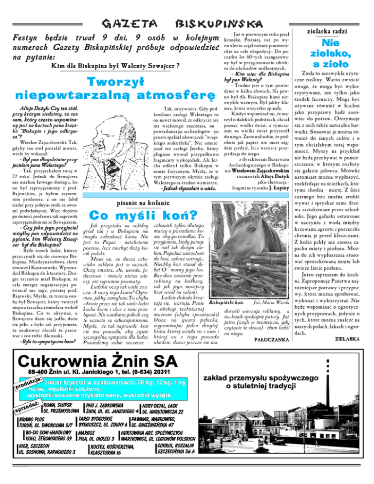 Festyn będzie trwał 9 dni, 9 osób w kolejnym numerach Gazety Biskupińskiej próbuje odpowiedzieć na pytanie: Kim dla Biskupina był Walenty Szwajcer ? Tworzył niepowtarzalną atmosferę Alicja Dużyk: Czy ten stół, przy którym siedzimy, to ten sam, który często wspomina− ny jest na kartach pana książ− ki: “Biskupin i jego odkryw− ca”? Wiesław Zajączkowski: Tak, gdyby ten stół potrafił mówić, wiele by wskazał. − Był pan długoletnim przy− jacielem pana Walentego? − Tak, przyjechałem tutaj w 72 roku. Jednak do Szwajcera nie miałem łatwego dostępu, bo on był zaprzyjaźniony z prof. Rajewskim, ja byłem asysten− tem profesora, a on nie lubił siadać przy jednym stole ze swoi− mi podwładnymi. Więc dopiero po śmierci profesora tak naprawdę zaprzyjaźniłem się ze Szwajcerem. − Czy jako jego przyjaciel mógłby pan odpowiedzieć na pytanie, kim Walenty Szwaj− cer był dla Biskupina? − Było trzech ludzi, którzy przyczynili się do rozwoju Bis− kupina. Międzynarodową sławę stworzył Kostrzewski. Wprowa− dził Biskupin do literatury. Dru− gie szczęście miał Biskupin, że całą energię organizacyjną po− święcił mu mgr, później prof. Rajewski. Myślę, że trzecią oso− bą był Szwajcer, który tworzył niepowtarzalną atmosferę wokół Biskupina. Co tu ukrywać, u Szwajcera dużo się jadło, dużo się piło, a było tak przyjemnie, że naukowcy chcieli tu praco− wać i coś robić dla nauki. − Była to sympatyczna baza? − Tak, oczywiście. Gdy pod− kreślano zasługi Walentego to on nawet mówił, że odkrycie nie ma większego znaczenia, on − powiadamiając archeologów − po prostu spełnił obowiązek “wiejs− kiego srakotłuka”. Nie umnie− jszał też zasługi Jerchy, który pługiem wyorał przypadkowo fragmenty wykopalisk. Ale Jer− cha odkrył tylko Biskupin w sensie fizycznym, Myślę, że w tym pierwszym okresie zasługi Walentego są trudno wymierne. − Jednak słyszałam o wielu. − Już w pierwszym roku pisał kronikę. Później, tuż po wy− zwoleniu zajął mienie poniemie− ckie na cele ekspedycji. Do po− czątku lat 60−tych zaangażowa− ny był w przygotowaniu obiek− tu do obchodów millenijnych. − Kim więc dla Biskupina był pan Walenty? − Trudno jest o tym powie− dzieć w kilku słowach. Na pew− no był dla Biskupina kimś nie− zwykle ważnym, Był jakby kla− mrą, która wszystko spinała. Kiedyś wspominał mi, że ma− rzył o dalekich podróżach, chciał poznać wielki świat, a tymcza− sem to wielki świat przyszedł do niego. Żartował sobie, że pod− obnie jak papież nie musi nig− dzie jeździć, lecz wszyscy przy− jeżdżają do niego. z dyrektorem Rezerwatu Archeologicznego w Biskupi− nie Wiesławem Zajączkowskim rozmawiała Alicja Dużyk jako ilustracja − fragment rysunku J. Łupiny pisanie na kolanie Co myśli koń? Jak przystało na solidny gród tak i w Biskupinie nie mogło zabraknąć konia. Nie jest to Pegaz − natchnienie poetów, lecz niezbyt duży ko− nik polski. Mówi się, że dusza czło− wieka zaklęta jest w oczach. Oczy smutne, złe, wesołe, ju− daszowe − mówią nieraz wię− cej, niż ogromne poematy. Ludzkie oczy tak wiele zna− czą. A oczy tego konia? Ogro− mne, jakby zamglone.To chyba właśnie przez nie tak wielu ludzi kocha konie i chce z nimi prze− bywać. Nie wiadomo jednak czy te uczucia są odwzajemnione. Myślę, że tak naprawdę koń nie ma powodu, aby żywić szczególną sympatię dla ludzi. Powiedzmy sobie szczerze − człowiek tylko dlatego marzy o posiadaniu ko− nia, aby go osiodłać. To przyjemnie, kiedy panuje się nad tak dużym cia− łem. Pojechać wierzchem do lasu, zabrać ostrogi... Niechby koń stanął dę− ba! O − marny jego los. Raz−dwa zostanie prze− robiony na kiełbasy, tak jak jego mniejszy brat osioł na salami. Ludzie dokoła krzą− fot. Maria Warda tają się, wariują, Panie Biskupiński koń. z obsługi technicznej dorośli wieszają reklamy, a muzeum (chyba sprzątaczki) ów konik spokojnie patrzy. Już kłócą się gwarą pałucką, jutro (czyli w momencie, gdy wypominając jedna drugiej, czytacie te słowa) − tłum ludzi która której wzięła to i owo i na niego. której co z tego powodu PAŁUCZANKA ubędzie, dzieci jeszcze nie ma, zielarka radzi Nie zielsko, a zioło Zioła to niezwykle użyte− czne rośliny. Warto zwrócić uwagę, że mogą być wyko− rzystywane, nie tylko jako środek leczniczy. Mogą być używane również w kuchni jako przyprawy bądż suro− wiec do potraw. Otrzymuje się z nich także naturalne bar− wniki. Stosować je można ró− wnież do innych celów i o tym chciałabym tutaj wspo− mnieć. Myszy na przykład nie będą przebywać w pomie− szczeniu, w którym rozłoży się gałęzie jałowca. Mrówki natomiast można wypłoszyć, rozkładając na ścieżkach, któ− rymi chodzą − miętę. Z liści czarnego bzu można zrobić wywar i spryskać nimi drze− wa zaatakowane przez szkod− niki. Jego gałązki ustawione w naczyniu z wodą między krzewami agrestu i porzeczki chronią je przed kleszczami. Z kolei pchły nie znoszą za− pachu mięty i piołunu. Moż− na do ich wypłoszenia stoso− wać sproszkowaną miętę lub świeże liście piołunu. Jutro zapraszam do kuch− ni. Zaproponuję Państwu naj− różniejsze potrawy i przypra− wy, które można spróbować, wykonać i wykorzystać. Nie będę wspominać o egzotycz− nych przyprawach, jedynie o tych, które można znależć na naszych polach, łąkach i ogro− dach. ZIELARKA