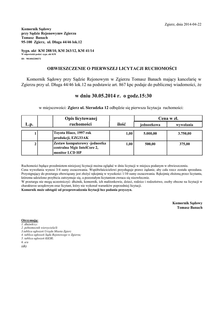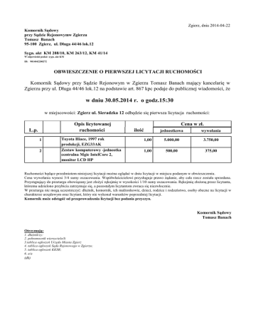 Zgierz, dnia 2014-04-22 Komornik Sądowy przy Sądzie Rejonowymw Zgierzu Tomasz Banach 95-100 Zgierz, ul. Długa 44/46 lok.12 Sygn. akt KM 288/10, KM 263/12, KM 41/14 W odpowiedzi podać: sygn. akt KM ID: 9014042200272 OBWIESZCZENIE O PIERWSZEJ LICYTACJI RUCHOMOŚCI Komornik Sądowy przy Sądzie Rejonowym w Zgierzu Tomasz Banach mający kancelarię w Zgierzu przy ul. Długa 44/46 lok.12 na podstawie art. 867 kpc podaje do publicznej wiadomości, Ŝe w dniu 30.05.2014 r. o godz.15:30 w miejscowości: Zgierz ul. Sieradzka 12 odbędzie się pierwsza licytacja ruchomości: Opis licytowanej ruchomości L.p. 1 2 Toyota Hiace, 1997 rok produkcji, EZG33AK Zestaw komputerowy -jednostka centralna Mgic IntelCore 2, monitor LCD HP Cena w zł. ilość jednostkowa wywołania 1,00 5.000,00 3.750,00 1,00 500,00 375,00 Ruchomości będące przedmiotem niniejszej licytacji moŜna oglądać w dniu licytacji w miejscu podanym w obwieszczeniu. Cena wywołania wynosi 3/4 sumy oszacowania. Współwłaścicielowi przysługuje prawo Ŝądanie, aby cała rzecz została sprzedana. Przystępujący do przetargu obowiązany jest złoŜyć rękojmię w wysokości 1/10 sumy oszacowania. Rękojmię złoŜoną przez licytanta, któremu udzielono przybicia zatrzymuje się, a pozostałym licytantom zwraca się niezwłocznie. W przetargu nie mogą uczestniczyć: dłuŜnik, komornik, ich małŜonkowie, dzieci, rodzice i rodzeństwo, osoby obecne na licytacji w charakterze urzędowym oraz licytant, który nie wykonał warunków poprzedniej licytacji. Komornik moŜe odstąpić od przeprowadzenia licytacji bez podania przyczyn. Komornik Sądowy Tomasz Banach Otrzymują: 1. dłuŜnik/cy: 2. pełnomocnik wierzyciela/li 3.tablica ogłoszeń Urzędu Miasta Zgierz 4. tablica ogłoszeń Sądu Rejonowego w Zgierzu; 5. tablica ogloszeń KKSR; 6. a/a (dk)
