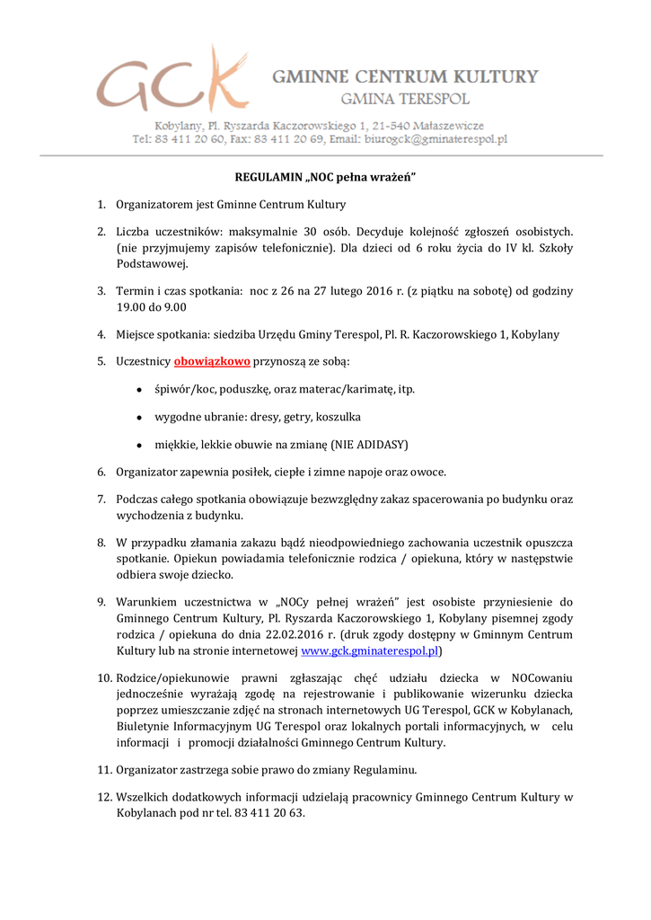REGULAMIN „NOC pełna wrażeń” 1. Organizatorem jest Gminne Centrum Kultury 2. Liczba uczestników: maksymalnie 30 osób. Decyduje kolejność zgłoszeń osobistych. (nie przyjmujemy zapisów telefonicznie). Dla dzieci od 6 roku życia do IV kl. Szkoły Podstawowej. 3. Termin i czas spotkania: noc z 26 na 27 lutego 2016 r. (z piątku na sobotę) od godziny 19.00 do 9.00 4. Miejsce spotkania: siedziba Urzędu Gminy Terespol, Pl. R. Kaczorowskiego 1, Kobylany 5. Uczestnicy obowiązkowo przynoszą ze sobą: śpiwór/koc, poduszkę, oraz materac/karimatę, itp. wygodne ubranie: dresy, getry, koszulka miękkie, lekkie obuwie na zmianę (NIE ADIDASY) 6. Organizator zapewnia posiłek, ciepłe i zimne napoje oraz owoce. 7. Podczas całego spotkania obowiązuje bezwzględny zakaz spacerowania po budynku oraz wychodzenia z budynku. 8. W przypadku złamania zakazu bądź nieodpowiedniego zachowania uczestnik opuszcza spotkanie. Opiekun powiadamia telefonicznie rodzica / opiekuna, który w następstwie odbiera swoje dziecko. 9. Warunkiem uczestnictwa w „NOCy pełnej wrażeń” jest osobiste przyniesienie do Gminnego Centrum Kultury, Pl. Ryszarda Kaczorowskiego 1, Kobylany pisemnej zgody rodzica / opiekuna do dnia 22.02.2016 r. (druk zgody dostępny w Gminnym Centrum Kultury lub na stronie internetowej www.gck.gminaterespol.pl) 10. Rodzice/opiekunowie prawni zgłaszając chęć udziału dziecka w NOCowaniu jednocześnie wyrażają zgodę na rejestrowanie i publikowanie wizerunku dziecka poprzez umieszczanie zdjęć na stronach internetowych UG Terespol, GCK w Kobylanach, Biuletynie Informacyjnym UG Terespol oraz lokalnych portali informacyjnych, w celu informacji i promocji działalności Gminnego Centrum Kultury. 11. Organizator zastrzega sobie prawo do zmiany Regulaminu. 12. Wszelkich dodatkowych informacji udzielają pracownicy Gminnego Centrum Kultury w Kobylanach pod nr tel. 83 411 20 63. Główne punkty spotkania Wizyta w Bibliotece – krótka lekcja dot. korzyści płynącej z czytania, odwiedzania Biblioteki, o pracy bibliotekarza i funkcjonowaniu Biblioteki Publicznej, itp.; Akcja promocyjna BIBLIOTEKI - wymyślamy hasła promujące czytelnictwo, robimy plakaty i zdjęcia na stronę internetową Gminnego Centrum Kultury oraz do Biuletynu Informacyjnego Urzędu Gminy Terespol. Zabawy dla wszystkich (Smok, kareta, Taniec dookoła krzeseł, taniec z kapeluszem, zabawy z chustą KLANZA, Taniec z balonem, Taniec na gazecie, trafianie do celu zakrętką od butelki, traf w butelkę kredką na sznurku, zabawa dookoła krzeseł - znajdź swoje ubranie, głuchy telefon, wyrazy na ostatnią literę, ….) Zabawy grupowe (Slalom między pachołkami z woreczkami z grochem na głowie drużynowe, taczka-drużynowe, przejście przez szarfę – drużynowe, wyścig w workach – drużynowe, wyścig na barana, lokomotywy, bieg po buty, bieg z rakietką i piłeczką pingpong, przeciąganie liny, opowiadamy historię - ostatni z drużyny czyta historię metodą głuchego telefonu do kapitana – punkty za słowa KLUCZ, familiada….) Zabawy indywidualne na czas (kręcenie hula-hop, rzut woreczkiem do celu, kalambury – rysowanie na tablicy…..) Karaoke Zabawy z chustą KLANZA: karuzela, bilard, kolory, rzeźba…