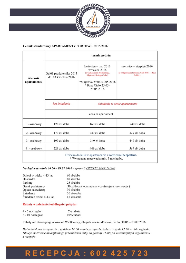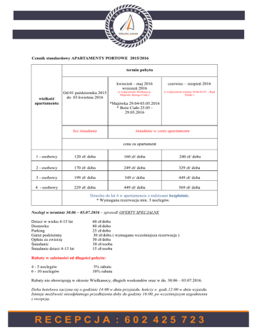 Cennik standardowy APARTAMENTY PORTOWE 2015/2016 termin pobytu wielkość apartamentu Od 01 października 2015 do 03 kwietnia 2016 kwiecień – maj 2016 wrzesień 2016 czerwiec – sierpień 2016 (z wyłączeniem Wielkanocy, Majówki, Bożego Ciała ) (z wyłączeniem terminu 30.06-03 07 - Rajd Polski ) *Majówka 29.04-03.05.2016 * Boże Ciało 25.05 29.05.2016 bez śniadania śniadanie w cenie apartamentu cena za apartament 1 - osobowy 120 zł/ doba 160 zł/ doba 240 zł/ doba 2 - osobowy 170 zł/ doba 249 zł/ doba 329 zł/ doba 3 - osobowy 199 zł/ doba 349 z/ doba 449 zł/ doba 4 - osobowy 229 zł/ doba 449 zł/ doba 569 zł/ doba Dziecko do lat 4 w apartamencie z rodzicami bezpłatnie. * Wymagana rezerwacja min. 3 noclegów. Noclegi w terminie 30.06 – 03.07.2016 – sprawdź OFERTY SPECJALNE Dzieci w wieku 4-13 lat Dostawka Parking Garaż podziemny Opłata za zwierzę Śniadanie Śniadanie dzieci 4-13 lat 60 zł/doba 80 zł/doba 25 zł/doba 30 zł/doba ( wymagana wcześniejsza rezerwacja ) 30 zł/doba 30 zł/osoba 15 zł/osoba Rabaty w zależności od długości pobytu: 4 - 5 noclegów 6 - 10 noclegów 5% rabatu 10% rabatu Rabaty nie obowiązują w okresie Wielkanocy, długich weekendów oraz w dn. 30.06 – 03.07.2016. Doba hotelowa zaczyna się o godzinie 14:00 w dniu przyjazdu, kończy o godz.12:00 w dniu wyjazdu. Istnieje możliwość nieodpłatnego przedłużenia doby do godziny 16:00, po wcześniejszym uzgodnieniu z recepcją. RECEPCJA : 602 425 723