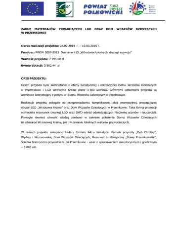 ZAKUP MATERIAŁÓW W PRZEMKOWIE PROMUJĄCYCH LGD ORAZ DOM WCZASÓW DZIECIĘCYCH Okres realizacji projektu: 28.07.2014 r. – 10.03.2015 r. Fundusz: PROW 2007-2013 Działanie 413 „Wdrażanie lokalnych strategii rozwoju” Wartość projektu: 7 995,00 zł Kwota dotacji: 3 902,44 zł OPIS PROJEKTU: Celem projektu było skorzystanie z oferty turystycznej i rekreacyjnej Domu Wczasów Dziecięcych w Przemkowie i LGD Wrzosowa Kraina przez 3 500 uczniów. Głównymi odbiorcami projektu są uczniowie korzystający z pobytu w Domu Wczasów Dziecięcych w Przemkowie. Realizacja projektu polegała na przeprowadzeniu kompleksowej akcji promocyjnej, propagującej obszar LGD „Wrzosowa Kraina” oraz Dom Wczasów Dziecięcych w Przemkowie. Taka forma promocji wzmocniła wizerunek (markę) LGD oraz DWD wśród odwiedzających Placówkę uczniów i nauczycieli. Pomogła również utrwalić wiedzę zarówno w zakresie położenia Domu Wczasów Dziecięcych na obszarze Wrzosowej Krainy, jak i w zakresie lokalnych walorów przyrodniczych. W ramach projektu zakupiono foldery formatu A4 o tematyce: Pomnik przyrody „Dąb Chrobry”, Wydmy i Wrzosowiska, Dom Wczasów Dziecięcych, Rezerwat ornitologiczny „Stawy Przemkowskie”, Ścieżka historyczno-przyrodnicza po Przemkowie - wraz z opracowaniem merytorycznym i graficznym – 5 000 szt.