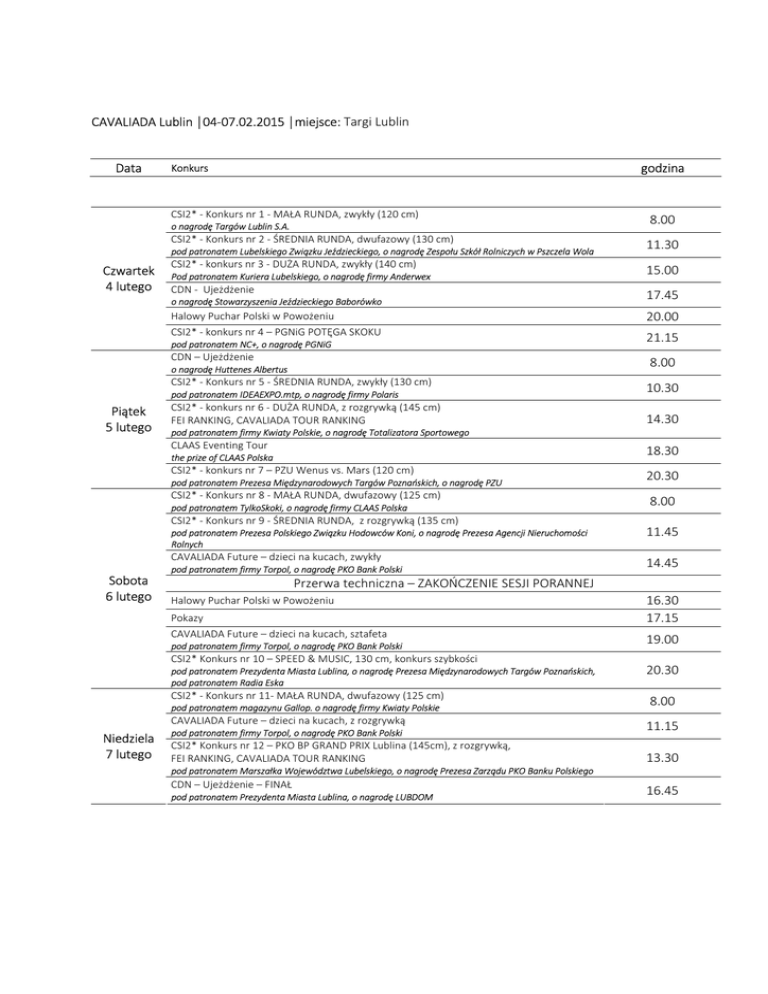 CAVALIADA Lublin │04-07.02.2015 │miejsce: Targi Lublin Data godzina Konkurs CSI2* - Konkurs nr 1 - MAŁA RUNDA, zwykły (120 cm) o nagrodę Targów Lublin S.A. CSI2* - Konkurs nr 2 - ŚREDNIA RUNDA, dwufazowy (130 cm) pod patronatem Lubelskiego Związku Jeździeckiego, o nagrodę Zespołu Szkół Rolniczych w Pszczela Wola Czwartek 4 lutego CSI2* - konkurs nr 3 - DUŻA RUNDA, zwykły (140 cm) Pod patronatem Kuriera Lubelskiego, o nagrodę firmy Anderwex CDN - Ujeżdżenie o nagrodę Stowarzyszenia Jeździeckiego Baborówko Halowy Puchar Polski w Powożeniu CSI2* - konkurs nr 4 – PGNiG POTĘGA SKOKU pod patronatem NC+, o nagrodę PGNiG CDN – Ujeżdżenie CSI2* - Konkurs nr 5 - ŚREDNIA RUNDA, zwykły (130 cm) 17.45 20.00 21.15 10.30 CSI2* - konkurs nr 6 - DUŻA RUNDA, z rozgrywką (145 cm) FEI RANKING, CAVALIADA TOUR RANKING 14.30 pod patronatem firmy Kwiaty Polskie, o nagrodę Totalizatora Sportowego 18.30 the prize of CLAAS Polska CSI2* - konkurs nr 7 – PZU Wenus vs. Mars (120 cm) pod patronatem Prezesa Międzynarodowych Targów Poznańskich, o nagrodę PZU CSI2* - Konkurs nr 8 - MAŁA RUNDA, dwufazowy (125 cm) pod patronatem TylkoSkoki, o nagrodę firmy CLAAS Polska CSI2* - Konkurs nr 9 - ŚREDNIA RUNDA, z rozgrywką (135 cm) 20.30 8.00 pod patronatem Prezesa Polskiego Związku Hodowców Koni, o nagrodę Prezesa Agencji Nieruchomości Rolnych 11.45 CAVALIADA Future – dzieci na kucach, zwykły 14.45 pod patronatem firmy Torpol, o nagrodę PKO Bank Polski Przerwa techniczna – ZAKOŃCZENIE SESJI PORANNEJ Halowy Puchar Polski w Powożeniu Pokazy CAVALIADA Future – dzieci na kucach, sztafeta pod patronatem firmy Torpol, o nagrodę PKO Bank Polski CSI2* Konkurs nr 10 – SPEED & MUSIC, 130 cm, konkurs szybkości pod patronatem Prezydenta Miasta Lublina, o nagrodę Prezesa Międzynarodowych Targów Poznańskich, pod patronatem Radia Eska CSI2* - Konkurs nr 11- MAŁA RUNDA, dwufazowy (125 cm) pod patronatem magazynu Gallop. o nagrodę firmy Kwiaty Polskie CAVALIADA Future – dzieci na kucach, z rozgrywką Niedziela 7 lutego 15.00 pod patronatem IDEAEXPO.mtp, o nagrodę firmy Polaris CLAAS Eventing Tour Sobota 6 lutego 11.30 8.00 o nagrodę Huttenes Albertus Piątek 5 lutego 8.00 16.30 17.15 19.00 20.30 8.00 pod patronatem firmy Torpol, o nagrodę PKO Bank Polski 11.15 CSI2* Konkurs nr 12 – PKO BP GRAND PRIX Lublina (145cm), z rozgrywką, FEI RANKING, CAVALIADA TOUR RANKING 13.30 pod patronatem Marszałka Województwa Lubelskiego, o nagrodę Prezesa Zarządu PKO Banku Polskiego CDN – Ujeżdżenie – FINAŁ pod patronatem Prezydenta Miasta Lublina, o nagrodę LUBDOM 16.45