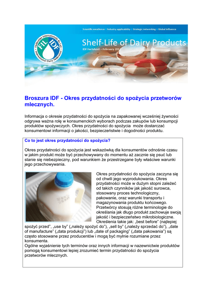 Broszura IDF - Okres przydatności do spożycia przetworów mlecznych. Informacja o okresie przydatności do spożycia na zapakowanej wcześniej żywności odgrywa ważna rolę w konsumenckich wyborach podczas zakupów lub konsumpcji produktów spożywczych. Okres przydatności do spożycia może dostarczać konsumentowi informacji o jakości, bezpieczeństwie i dogodności produktu. Co to jest okres przydatności do spożycia? Okres przydatności do spożycia jest wskazówką dla konsumentów odnośnie czasu w jakim produkt może być przechowywany do momentu aż zacznie się psuć lub stanie się niebezpieczny, pod warunkiem że przestrzegane były właściwe warunki jego przechowywania. Okres przydatności do spożycia zaczyna się od chwili jego wyprodukowania. Okres przydatności może w dużym stopni zależeć od takich czynników jak jakość surowca, stosowany proces technologiczny, pakowanie, oraz warunki transportu i magazynowania produktu końcowego. Przetwórcy stosują różne terminologie do określania jak długo produkt zachowuje swoją jakość i bezpieczeństwo mikrobiologiczne. Określenia takie jak: „best before” (najlepiej spożyć przed”, „use by” („należy spożyć do”), „sell by” („należy sprzedać do”), „date of manufacture” („data produkcji”) lub „date of packaging” („data pakowania”) są często stosowane przez producentów i mogą być mylnie rozumiane przez konsumenta. Ogólne wyjaśnienie tych terminów oraz innych informacji w nazewnictwie produktów pomogą konsumentowi lepiej zrozumieć termin przydatności do spożycia przetworów mlecznych. Termin “Best Before” lub “Durable Life”. Data po określeniu “best before”(“najlepiej spożyć przed”) lub “durable life”(„okres trwałości”) wyraża przedział czasu w którym produkt w nieotwartym opakowaniu, przechowywany w odpowiednich warunkach zachowuje swoją świeżość, smak, wartości odżywcze oraz każdą inną cechę deklarowaną przez producenta. Żywność po przekroczeniu daty przypisanej do określenia “best before” niekoniecznie jest niebezpieczna dla konsumenta ale może nie być już produktem najwyższej jakości. Tym samym określenie „best before” nie odnosi się do bezpieczeństwa żywności. Określenie „best before” nie tylko dostarcza informacji o świeżości produktu (np. jak świeży/stary jest produkt lub kiedy został wyprodukowany, ale także dostarcza informacji jak długo nierozpakowany produkt może być przechowywany. Termin “use by” W wielu krajach termin “use by”(“należy spożyć do”) pokazuje datę do kiedy produkt może być bezpiecznie konsumowany. Dlatego, w odróżnieniu od terminu „best before”, precyzyjne określenie terminu „use by” jest kluczowe dla bezpieczeństwa spożywania produktu. To określenie jest stosowane dla łatwo psujących się produktów, których spożycie po podanym terminie będzie stanowiło pewne ryzyko zdrowotne. Jednakże w niektórych krajach (np. w USA) określenie „use by” zazwyczaj odnosi się do optimum jakości i nie dotyczy bezpieczeństwa. W krajach gdzie określenie to odnosi się do bezpieczeństwa zaleca się aby produkt ani nie był sprzedawany ani konsumowany po opływie podanego terminu. Dobrym przykładem produktu mlecznego, uznawanego za psujący się w stopniu, który kwalifikuje do stosowania określenia „use by”, jest mleko surowe. Inne określenia zawierające datę Producenci mogą stosować inne terminologie takie jak: „sell by” („należy sprzedać do”), „date of manufacture” („data produkcji”), „date of packaging” („data pakowania”), „packed on” („zapakowano …”) dla celów śledzenia drogi produktu oraz magazynowania. Ogólna Norma Kodeksowa nazewnictwa towarów opakowanych definiuje niektóre z powyżej wymienionych terminów następująco: „date of manufacture” („data produkcji”) oznacza datę od której produkt staje się produktem zgodnie z opisem, „date of packaging” („data pakowania”), znane także jako określenie ”packed on”(„zapakowano…..”), jest datą kiedy produkt został umieszczony w bezpośrednim pojemniku (opakowaniu), w którym będzie ostatecznie sprzedawany, „sell by” („należy sprzedać do”) jest ostatnim terminem oferowania do sprzedaży, po upływie którego obowiązuje informacja o uzasadnionym czasie przechowywania w domu.