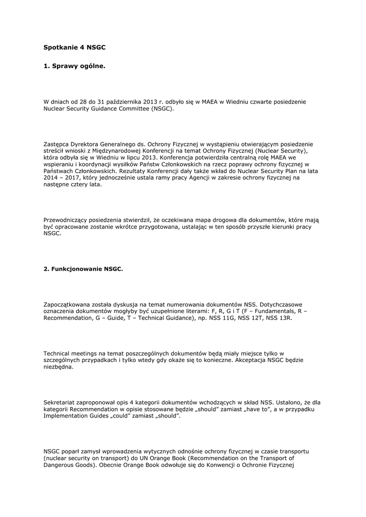Spotkanie 4 NSGC 1. Sprawy ogólne. W dniach od 28 do 31 października 2013 r. odbyło się w MAEA w Wiedniu czwarte posiedzenie Nuclear Security Guidance Committee (NSGC). Zastępca Dyrektora Generalnego ds. Ochrony Fizycznej w wystąpieniu otwierającym posiedzenie streścił wnioski z Międzynarodowej Konferencji na temat Ochrony Fizycznej (Nuclear Security), która odbyła się w Wiedniu w lipcu 2013. Konferencja potwierdziła centralną rolę MAEA we wspieraniu i koordynacji wysiłków Państw Członkowskich na rzecz poprawy ochrony fizycznej w Państwach Członkowskich. Rezultaty Konferencji dały także wkład do Nuclear Security Plan na lata 2014 – 2017, który jednocześnie ustala ramy pracy Agencji w zakresie ochrony fizycznej na następne cztery lata. Przewodniczący posiedzenia stwierdził, że oczekiwana mapa drogowa dla dokumentów, które mają być opracowane zostanie wkrótce przygotowana, ustalając w ten sposób przyszłe kierunki pracy NSGC. 2. Funkcjonowanie NSGC. Zapoczątkowana została dyskusja na temat numerowania dokumentów NSS. Dotychczasowe oznaczenia dokumentów mogłyby być uzupełnione literami: F, R, G i T (F – Fundamentals, R – Recommendation, G – Guide, T – Technical Guidance), np. NSS 11G, NSS 12T, NSS 13R. Technical meetings na temat poszczególnych dokumentów będą miały miejsce tylko w szczególnych przypadkach i tylko wtedy gdy okaże się to konieczne. Akceptacja NSGC będzie niezbędna. Sekretariat zaproponował opis 4 kategorii dokumentów wchodzących w skład NSS. Ustalono, że dla kategorii Recommendation w opisie stosowane będzie „should” zamiast „have to”, a w przypadku Implementation Guides „could” zamiast „should”. NSGC poparł zamysł wprowadzenia wytycznych odnośnie ochrony fizycznej w czasie transportu (nuclear security on transport) do UN Orange Book (Recommendation on the Transport of Dangerous Goods). Obecnie Orange Book odwołuje się do Konwencji o Ochronie Fizycznej Materiałów Jądrowych i do INFCIRC/225/Rev.4. W związku z tym NSGC rekomendował nawiązanie kontaktu z TRANSSC oraz zwołanie technical meeting na poziomie ekspertów. 3. Rozwój Nuclear Security Series. W celu zintensyfikowania prac dotyczących opracowania planów wydawniczych publikacji NSS i priorytetów w tym zakresie powołana została „road map subgroup” składajaca się z przedstawicieli USA, UK, Federacji Rosyjskiej, Słowenii, Holandii, Grecji, Niemiec i Finlandii. Grupa ma współpracować z Sekretariatem MAEA między posiedzeniami NSGC. Po dyskusji podjęto decyzję, że znowelizowane plany wydawnicze, uzgodnione w ramach podgrupy, przedstawione zostaną na kolejnym, piątym posiedzeniu NSGC. Wstępnie ustalono, że niektóre z priorytetów powinny obejmować wytyczne dotyczące cyber bezpieczeństwa, planów postępowania na wypadek sabotażu i nieupoważnionego postępowania z materiałami, Implementing Guide NST023 dotyczący ochrony fizycznej obiektów jądrowych i korespondujący z nim Implementing Guide dotyczący materiałów promieniotwórczych i związanych z nimi obiektów, Implementing Guide dotyczący wydarzeń zagrażających ochronie fizycznej (nuclear security events). 4. Przygotowywanie projektów publikacji Nuclear Security Series oraz DPPs. Po krótkich prezentacjach ustalono, że następujące projekty dokumentów zostaną przekazane do zatwierdzenia przez DDG-NS:     NST022 NST007 NST013 NST017 – – – – Implementing Implementing Implementing Implementing Guide Guide Guide Guide on on on on Information Security; Threat Assessment and Risk Informed approach for MORC; radiological Crime Scene Management; Security in Transport of Nuclear Material; Nadal trwają prace nad projektem dokumentu NST023 – Implementing Guide on Physical Protection of Nuclear Facilities. W czasie posiedzenia NSGC w czerwcu 2014 spodziewane jest zatwierdzenie przesłania dokumentu do Państw Członkowskich w celu zebrania uwag do dokumentu. Zatwierdzone zostały Document Preparation Profile (DPP) dla następujących publikacji:   NST048 – Implementing Guide on Security of Radioactive Material in Use and Storage, Revision NSS 11; NST044 – Implementing Guide on Security in Transport of Radioactive Material, Revision NSS 9. W krótkich prezentacjach przedstawione zostały Document Preparation Profile dla następujuących publikacji:   NST042 Planning for and organization of a nuclear security detectionarchitecture (Technical Guidance); po rewizji zakresu dokumentu zostanie ponownie przedłożony w czasie NSGC-5; NST045 Nuclear Security Recommendation for computer security, NST046 Computer security systems and measures for nuclear facilities (Implementing Guide), NST047 Computer security practices for nuclear facilities (Technical Guidance). Wszystkie trzy projekty nie zostały zatwierdzone. Federacja Rosyjska zwróciła się z wnioskiem do Sekretariatu Agencji o wstrzymaniu prac nad tymi i wszystkimi innymi dokumentami dotyczącymi cyberbezpieczeństwa z powodu możliwości przekroczenia przez MAEA swoich statutowych uprawnień.   Sekretariat przedstawił informację odnośnie aktualnego stanu prac nad Nuclear Security Series Glossary. NSGC traktuje słownik jako dokument priorytetowy, który powinien mieć w przyszłości status podobny do Safety Glossary. Przygotowana została ostateczna wersja projektu NST021 Implementing Guide on Use of Nuclear Material Accounting and Control in Nuclear Security. Projekt podlegać będzie uproszczonej procedurze zatwierdzenia. 5. Przegląd projektów Safety Standards oraz Document Preparation Profile (DPP) dla publikacji odnoszących się do bezpieczeństwa i ochrony fizycznej (safety and security) (Interface Documents).  DS430 Safety Guide on Design of electric power systems for nuclear power plants. Zatwierdzono przedłożenie dokumentu do Commission on Safety Standards (CSS).  DS436 Safety Guide on I&C and software important to safety for research reactors. Dokument wymaga kor