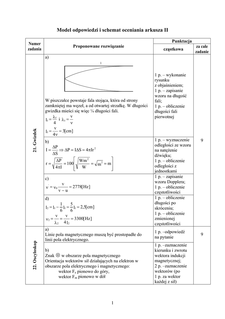 Model odpowiedzi i schemat oceniania arkusza II Punktacja Numer zadania Proponowane rozwiązanie cząstkowa za całe zadanie a) 21. Gwizdek l W piszczałce powstaje fala stojąca, która od strony zamkniętej ma węzeł, a od otwartej strzałkę. W długości gwizdka mieści się więc ¼ długości fali. v λ1 i λ1 = l1 = 4 ν v = 3[cm] l1 = 4ν b) ∆P ⇒ ∆P = I∆S = 4πIr 2 ∆S Wm 2 ∆P r= = 100 = m2 = m 4 πI W I= c) ` ν = ν0 v = 2778[ Hz ] v−u d) 22. Oscyloskop 1 5 l2 = l1 − l1 = l1 = 2,5[cm] 6 6 v v = 3300[ Hz ] ν2 = = λ 2 4 l2 1 p. – wykonanie rysunku z objaśnieniem; 1 p. – zapisanie wzoru na długość fali; 1 p. – obliczenie długości fali pierwotnej 1 p. – wyznaczenie odległości ze wzoru na natężenie dźwięku; 1 p. – obliczenie odległości z jednostkami 1 p. – zapisanie wzoru Dopplera; 1 p. – obliczenie częstotliwości 1 p. – obliczenie długości po skróceniu; 1 p. – obliczenie zmienionej częstotliwości a) Linie pola magnetycznego muszą być prostopadłe do linii pola elektrycznego. 1 p. –odpowiedź na pytanie b) Znak ! w obszarze pola magnetycznego Orientacja wektorów sił działających na elektron w obszarze pola elektrycznego i magnetycznego: wektor Fe pionowo do góry, wektor Fm pionowo w dół 1 p. –zaznaczenie kierunku i zwrotu wektora indukcji magnetycznej; 2 p. –zaznaczenie wektorów (po 1 p. za wektor każdej z sił) 1 9 9 c) eE = evB d) Zmierzę napięcie między okładkami kondensatora U i U odległość między jego okładkami d, bo E = . d e) mv 2 Zmierzę UKA, bo eUKA = . 2 f) E mv 2 v = i eUKA = ⇒ B 2 mE 2 mU 2 e U2 eUKA= = ⇒ = m 2 U KA d 2 B 2 2B 2 2B 2 d 2 m n N = N = 3 mole MN Q V = n N c V ∆T1 23. Przemiany gazowe T1 = 27 o C = 300 K p p1 p 2 = ⇒ T2 = T1 2 = 750 K p1 T1 T2 Q p = n He c p ∆T2 cp = cV + R = 5 R 2 Q v = Q p ⇒ n N c V ∆T1 = n He c p ∆T2 ⇒ n He = 24. Tarcie m He = M He n N c V T2 − T1 c p ∆T2 n N c v ∆T1 c p ∆T2 1 p. –odpowiedź na pytanie 1 p. –odpowiedź na pytanie 1 p. –odpowiedź na pytanie 1 p. – podanie wzoru; 1 p. – przekształcenie wzoru 1 p. – obliczenie liczby moli gazu 1 p. – podanie wzoru na ciepło przy stałej objętości 1 p. – zmiana skali temperatur 1 p. – obliczenie temperatury końcowej 1 p. – podanie wzoru na ciepło przy stałym ciśnieniu 1 p. – obliczenie ciepła molowego przy stałym ciśnieniu 8 1 p. – obliczenie liczby moli helu 1 p. – obliczenie masy helu a) Siła nacisku, N: 1; 2; 3; 4; 5; 6; 7; 8; 10 2 1 p. – uzupełnienie tabeli 7 b) T, N ts 5 4 td 3 2 1 1 2 3 4 5 6 7 8 9 F, N 10 d) fs = 0,55 fd = 0,3 L = ωI = 2π 0,4 mr 2 T 26. Grzałka 25. Gwiazda neutronowa L1 = L 2 m r 2π 2π 2 2 0,4m 1 r1 = 0,4m 2 r2 ⇒ T2 = T1 2 2 T1 T2 m 1 r1 T2 = T1 ρ1 = m2 m1 m1 2 = 10 − 4 [s] g ≈ 1[ 3 ] cm r2 r1 2 4 3 πr1 3 m2 g ρ2 = ≈ 1011 [ 3 ] 4 3 cm πr 2 3 a) Zjawiska: ciepło wydzielone na oporze przekazywane jest cząsteczkom wody, rośnie ich energia wewnętrzna (kinetyczna), a więc temperatura. Po osiągnięciu temperatury wrzenia ciepło powoduje wzrost odległości między cząsteczkami (rośnie energia potencjalna cząsteczek) zachodzi parowanie całą objętością. 3 1 p. – wyskalowanie osi; 1 p. – zaznaczenie niepewności pomiarowych (wystarczy pionowa kreska); 2 p. – narysowanie prostych najlepszego dopasowania (po 1 p. za każdą prostą) 1 p. – obliczenie współczynnika tarcia statycznego; 1 p. – obliczenie współczynnika tarcia dynamicznego 1 p. – napisanie równania wynikającego z zasady zachowania momentu pędu 1 p. – wyprowadzenie wzoru na okres wirowania gwiazdy 1 p. – obliczenie okresu wirowania gwiazdy 5 2 p. – obliczenie gęstości przed i po wybuchu (po 1 p. za każdą gęstość) 3 p. – opis zjawisk, jakie zachodzą w czasie tego procesie 12 b) R sz = R + R = 2 R U2 t1 2R 1 1 1 R = + ⇒ Rr = Rr R R 2 Q1 = 2U 2 t2 R U2 2U 2 t1 = t2 2R R t 1 = 4t 2 Q2 = c) U2Rg U P = I Rg i I = ⇒P= ≈ 1180[ W ] R + Rg (R + R g ) 2 2 1 p. – zapisanie wzoru na opór zastępczy szeregowy; 1 p. – zapisanie wzoru na wydzielone ciepło; 1 p. – zapisanie wzoru na opór zastępczy równoległy; 1 p. – zapisanie wzoru na wydzielone ciepło; 1 p. – przyrównanie wydzielonego ciepła; 1 p. – wyznaczenie zależności między czasem t1 i t2 1 p. – obliczenie mocy grzałki; 1 p. – rachunek na jednostkach d) η= = Wotrzymane Wcakowite = I2R gt I 2 (R + R g ) 2 ⋅ 100% 39 ⋅ 100% = 97,5% 40 4 1 p. – obliczenie sprawności grzałki