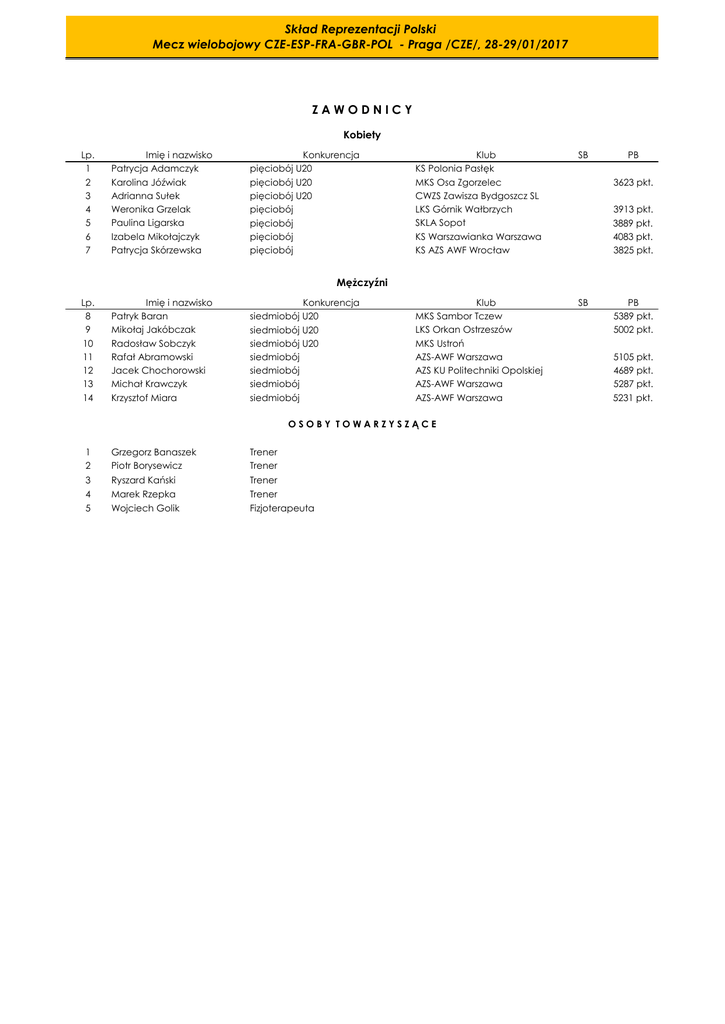 Skład Reprezentacji Polski Mecz wielobojowy CZE-ESP-FRA-GBR-POL - Praga /CZE/, 28-29/01/2017 ZAWODNICY Kobiety Lp. 1 2 3 4 5 6 7 Imię i nazwisko Patrycja Adamczyk Karolina Jóźwiak Adrianna Sułek Weronika Grzelak Paulina Ligarska Izabela Mikołajczyk Patrycja Skórzewska Konkurencja pięciobój U20 pięciobój U20 pięciobój U20 pięciobój pięciobój pięciobój pięciobój Klub KS Polonia Pasłęk MKS Osa Zgorzelec CWZS Zawisza Bydgoszcz SL LKS Górnik Wałbrzych SKLA Sopot KS Warszawianka Warszawa KS AZS AWF Wrocław SB Klub MKS Sambor Tczew LKS Orkan Ostrzeszów MKS Ustroń AZS-AWF Warszawa AZS KU Politechniki Opolskiej AZS-AWF Warszawa AZS-AWF Warszawa SB PB 3623 pkt. 3913 pkt. 3889 pkt. 4083 pkt. 3825 pkt. Mężczyźni Lp. 8 9 10 11 12 13 14 Imię i nazwisko Patryk Baran Mikołaj Jakóbczak Radosław Sobczyk Rafał Abramowski Jacek Chochorowski Michał Krawczyk Krzysztof Miara Konkurencja siedmiobój U20 siedmiobój U20 siedmiobój U20 siedmiobój siedmiobój siedmiobój siedmiobój OSOBY TOWARZYSZĄCE 1 2 Grzegorz Banaszek Piotr Borysewicz Trener Trener 3 Ryszard Kański Trener 4 Marek Rzepka Trener 5 Wojciech Golik Fizjoterapeuta PB 5389 pkt. 5002 pkt. 5105 pkt. 4689 pkt. 5287 pkt. 5231 pkt.