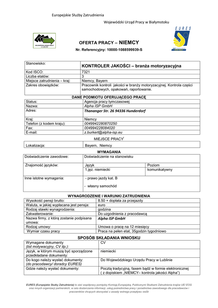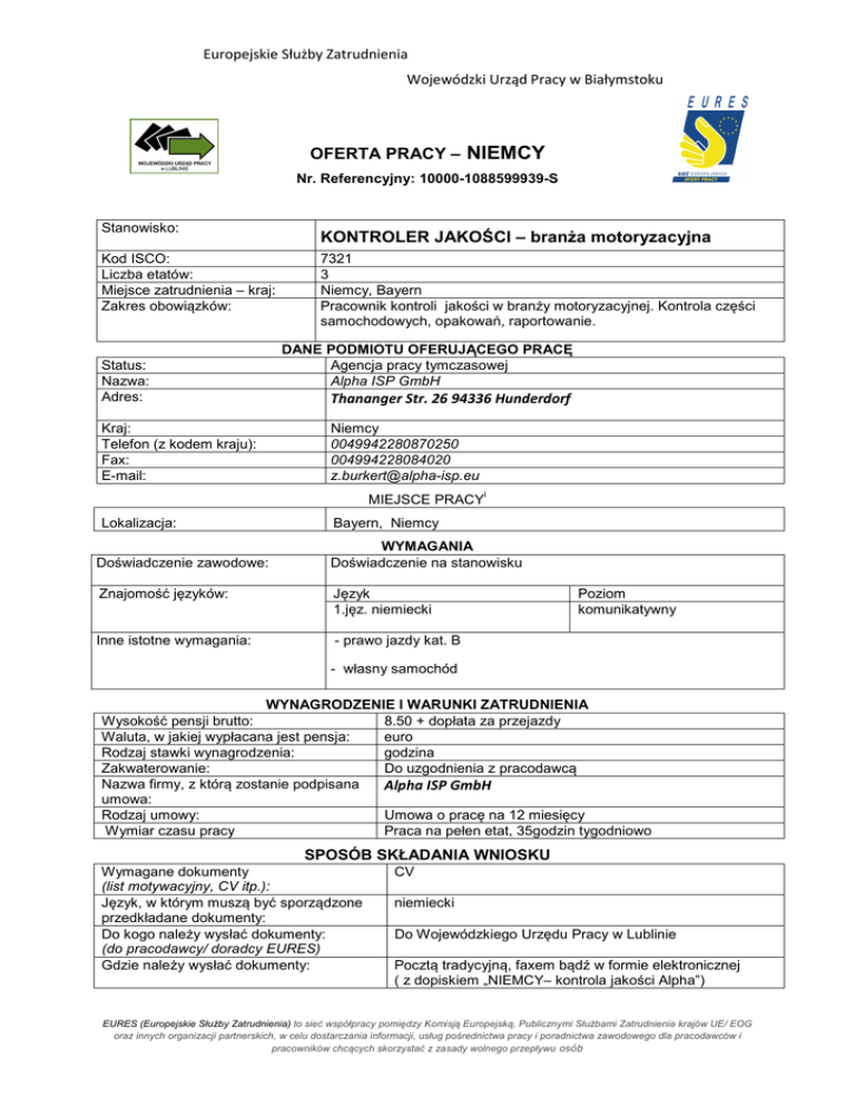 Europejskie Służby Zatrudnienia Wojewódzki Urząd Pracy w Białymstoku OFERTA PRACY – NIEMCY Nr. Referencyjny: 10000-1088599939-S Stanowisko: Kod ISCO: Liczba etatów: Miejsce zatrudnienia – kraj: Zakres obowiązków: Status: Nazwa: Adres: Kraj: Telefon (z kodem kraju): Fax: E-mail: KONTROLER JAKOŚCI – branża motoryzacyjna 7321 3 Niemcy, Bayern Pracownik kontroli jakości w branży motoryzacyjnej. Kontrola części samochodowych, opakowań, raportowanie. DANE PODMIOTU OFERUJĄCEGO PRACĘ Agencja pracy tymczasowej Alpha ISP GmbH Thananger Str. 26 94336 Hunderdorf Niemcy 0049942280870250 004994228084020 [email protected] i MIEJSCE PRACY Lokalizacja: Doświadczenie zawodowe: Bayern, Niemcy WYMAGANIA Doświadczenie na stanowisku Znajomość języków: Język 1.jęz. niemiecki Inne istotne wymagania: - prawo jazdy kat. B Poziom komunikatywny - własny samochód WYNAGRODZENIE I WARUNKI ZATRUDNIENIA Wysokość pensji brutto: 8.50 + dopłata za przejazdy Waluta, w jakiej wypłacana jest pensja: euro Rodzaj stawki wynagrodzenia: godzina Zakwaterowanie: Do uzgodnienia z pracodawcą Nazwa firmy, z którą zostanie podpisana Alpha ISP GmbH umowa: Rodzaj umowy: Umowa o pracę na 12 miesięcy Wymiar czasu pracy Praca na pełen etat, 35godzin tygodniowo SPOSÓB SKŁADANIA WNIOSKU Wymagane dokumenty (list motywacyjny, CV itp.): Język, w którym muszą być sporządzone przedkładane dokumenty: Do kogo należy wysłać dokumenty: (do pracodawcy/ doradcy EURES) Gdzie należy wysłać dokumenty: CV niemiecki Do Wojewódzkiego Urzędu Pracy w Lublinie Pocztą tradycyjną, faxem bądź w formie elektronicznej ( z dopiskiem „NIEMCY– kontrola jakości Alpha”) EURES (Europejskie Służby Zatrudnienia) to sieć współpracy pomiędzy Komisją Europejską, Publicznymi Służbami Zatrudnienia krajów UE/ EOG oraz innych organizacji partnerskich, w celu dostarczania informacji, usług pośrednictwa pracy i poradnictwa zawodowego dla pracodawców i pracowników chcących skorzystać z zasady wolnego przepływu osób Dane teleadresowe doradcy EURES lub przedstawiciela pracodawcy: (nazwisko, adres, telefon, fax, e-mail itp.) Marta Sadłowska Wojewódzki Urząd Pracy w Lublinie Ul. Okopowa 5 20-022 Lublin [email protected] tel:81 472 56 34 DODATKOWE INFORMACJE Dokumenty, spełniające warunki formalne, zostaną przekazane pracodawcy, który skontaktuje się z wybranymi kandydatami. WAŻNOŚĆ Termin przedkładania podań o pracę / Do odwołania zakończenia ważności oferty: 1) Agencja pracy tymczasowej Alpha ISP GmbH Thananger Str.26 94336 Hunderdorf Niemcy oświadczyła, że prowadzi działalność zgodnie z przepisami obowiązującymi w Niemczech. 2) Publiczne służby zatrudnienia w Niemczech nie posiadają uprawnień do potwierdzenia legalności działania Alpha ISP GmbH Thananger Str.26 94336 Hunderdorf Niemcy. Uprzejmie informujemy, że skontaktujemy się wyłącznie z wybranymi kandydatami. UWAGA: 1. Umowa z zagranicznym pracodawcą zostanie zawarta zgodnie z prawem kraju zatrudnienia. Oznacza to, że wszystkie roszczenia odnośnie do warunków, które obejmuje umowa, można kierować wyłącznie do odpowiedniego sądu w kraju zatrudnienia. Publiczne służby zatrudnienia (EURES) nie mogą pośredniczyć ani reprezentować pracownika w sądzie kraju zatrudnienia w przypadku sporu z pracodawcą. 2. Publiczne służby zatrudnienia (EURES) dokładają wszelkich starań, aby zapewnić rzetelność i wiarygodność ofert pracy zgłoszonych w lokalnym urzędzie pracy. Należy wyjaśnić, że oferta pracy została zgłoszona przez stronę trzecią i EURES nie odpowiada za ewentualne rozbieżności między warunkami pracy określonymi w ofercie pracy i warunkami oferowanymi przez potencjalnego pracodawcę. 3. Publiczne służby zatrudnienia (EURES) informują, że będą zbierać, przetwarzać i przekazywać potencjalnym pracodawcom zgodnie z przepisami dotyczącymi ochrony danych osobowych wszystkie dane osobowe dostarczone przez osoby poszukujące pracy. i EURES (Europejskie Służby Zatrudnienia) to sieć współpracy pomiędzy Komisją Europejską, Publicznymi Służbami Zatrudnienia krajów UE/ EOG oraz innych organizacji partnerskich, w celu dostarczania informacji, usług pośrednictwa pracy i poradnictwa zawodowego dla pracodawców i pracowników chcących skorzystać z zasady wolnego przepływu osób