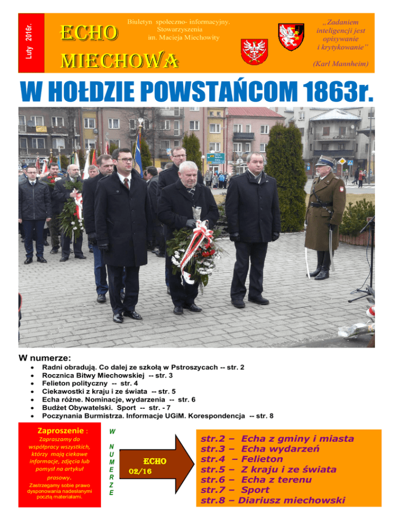 Luty 2016r. Biuletyn społeczno- informacyjny. Stowarzyszenia im. Macieja Miechowity Echo Miechowa „Zadaniem inteligencji jest opisywanie i krytykowanie” (Karl Mannheim) W HOŁDZIE POWSTAŃCOM 1863r. W numerze: Radni obradują. Co dalej ze szkołą w Pstroszycach -- str. 2 Rocznica Bitwy Miechowskiej -- str. 3 Felieton polityczny -- str. 4 Ciekawostki z kraju i ze świata -- str. 5 Echa różne. Nominacje, wydarzenia -- str. 6 Budżet Obywatelski. Sport -- str. - 7 Poczynania Burmistrza. Informacje UGiM. Korespondencja -- str. 8 Zaproszenie : Zapraszamy do współpracy wszystkich, którzy mają ciekawe informacje, zdjęcia lub pomysł na artykuł prasowy. Zastrzegamy sobie prawo dysponowania nadesłanymi pocztą materiałami. W N U M E R Z E ECHO 02/16 (112) str.2 str.3 str.4 str.5 str.6 str.7 str.8 – Echa z gminy i miasta – Echa wydarzeń – Felieton – Z kraju i ze świata – Echa z terenu – Sport – Diariusz miechowski ECHA Z GMINY I MIASTA. Sesja Rady Miejskiej. 5 lutego odbyła się Sesja Rady Miejskiej Miechowie. W trakcie posiedzenia uczestnicy wysłuchali sprawozdania z prac wydziałów i referatów w okresie międzysesyjnym, które przedstawił Burmistrz Gminy i Miasta Miechów Dariusz Marczewski. Informację z czynności podejmowanych przez Biuro Rady Miejskiej w w/w okresie złożył Przewodniczący Rady Zenon Czekaj. W kolejnym punkcie Dyrektor Samorządowego Zespołu Edukacji w Miechowie – Krzysztof Piwowarczyk odczytał sprawozdanie o stanie realizacji zadań oświatowych za rok szkolny 2014/2015. Na sesji Rada Gminy i Miasta Miechów przyjęła m.in uchwałę w sprawie częściowego zwolnienia z opłaty za gospodarowanie odpadami komunalnymi rodzin 3 + z gminy Miechów (mających kartę dużej rodziny). Będą one w części zwolnione z opłaty za odpady komunalne, zbierane i odbierane w sposób selektywny. Podjęcie uchwały stanowi kontynuację polityki prorodzinnej prowadzonej przez Gminę Miechów. Możliwość jej podjęcia dała zmiana art. 6 k ustawy o utrzymaniu czystości i porządku w gminach z dnia 11 września 2015 r. Na prośbę Burmistrza, który przed sesją spotkał się z nauczycielami i rodzicami uczniów, z obrad sesji wycofano projekt uchwały o przekształceniu Szkoły Podstawowej w Pstroszycach w filię SP nr 1 w Miechowie (o sprawie czytaj poniżej). Sesję poprzedziły komisje rady, podczas których Radni zapoznali się z projektami uchwał w sprawie: #/ zmiany uchwały budżetowej Gminy i Miasta Miechów na rok 2016 Nr XIV/199/2015 Rady Miejskiej w Miechowie z dnia 23 grudnia 2015 r., #/ zmiany wieloletniej prognozy finansowej Gminy i Miasta Miechów; #/ udzielenia dotacji celowej dla Powiatu Miechowskiego; #/ zmiany uchwały Nr XXXIV/471/2013 Rady Miejskiej w Miechowie z dnia 27 grudnia 2013 r. w sprawie zaciągnięcia pożyczki na wyprzedzające finansowanie zadania pn. „Instalacja systemów energii odnawialnej w gminach: Niepołomice, Wieliczka, Skawina oraz Miechów na budynkach użyteczności publicznej oraz domach prywatnych” w ramach Szwajcarsko-Polskiego Programu Współpracy; #/ zmiany uchwały Nr XXXIV/472/2013 Rady Miejskiej w Miechowie z dnia 27 grudnia 2013 r. w sprawie zaciągnięcia pożyczki długoterminowej w Wojewódzkim Funduszu Ochrony Środowiska i Gospodarki Wodnej w Krakowie; #/ zaciągnięcia pożyczki długoterminowej w Wojewódzkim Funduszu Ochrony Środowiska i Gospodarki Wodnej w Krakowie; #/ zaciągnięcia pożyczki na wyprzedzające finansowanie zadań pn. „Wymiana oświetlenia ulicznego energochłonnego (rtęciowego) na oświetlenie energooszczędne typu LED na terenie miasta Miechów”, „Termomodernizacja budynków użyteczności publicznej – Szkoła Podstawowa Nr 1 w Miechowie”, „Termomodernizacja budynków użyteczności publicznej – Urząd Gminy i Miasta Miechów” w ramach Szwajcarsko Polskiego Programu Współpracy; #/ zwolnienia w części z opłaty za gospodarowanie odpadami komunalnymi; #/ ustalenia wysokości wynagrodzenia za inkaso podatków i opłat lokalnych; #/ zmiany uchwały Nr XXIX/401/2013 Rady Miejskiej w Miechowie z dnia 3 czerwca 2013 r. w sprawie poboru opłaty za gospodarowanie odpadami komunalnymi w drodze inkasa; #/ udzielenia pomocy finansowej dla Powiatu Miechowskiego; #/ pozbawienia kategorii części drogi publicznej nr K140279 ul. Jana Sobieskiego w Miechowie; #/ wspólnej realizacji przez Gminę Miechów z Gminą Słomniki prac związanych z budową drogi gminnej łączącej Pojałowice-Nasiechowice (Górka Muniakowska); #/ wyrażenia zgody na sprzedaż w drodze bezprzetargowej nieruchomości położonej w Siedliskach stanowiącej własność Gminy Miechów, oznaczonej numerem ewidencyjnym 245/2, objętej księgą wieczystą KR1M/00062500/9; #/ wyrażenia zgody na sprzedaż w drodze bezprzetargowej nieruchomości położonej w Kalinie Małej stanowiącej własność Gminy Miechów, objętej księgą wieczystą KR1M/00046198/0; #/ zamiany nieruchomości; #/ upoważnienia Burmistrza do nieodpłatnego nabycia nieruchomości na cele publiczne; #/ wyrażenia zgody na najem lokalu użytkowego w formie bezprzetargowej; #/ ustalenia wysokości cen i opłat za usługi komunalne oraz za korzystanie z obiektów i urządzeń użyteczności publicznej. #/ zmiany uchwały Nr XXXIV/480/2013 Rady Miejskiej w Miechowie z dnia 27 grudnia 2013 r. w sprawie: określenia wysokości i zasad udzielania dotacji celowej dla podmiotów prowadzących żłobki na terenie Gminy i Miasta Miechów Szkoła w Pstroszycach dostała szansę. Jak pisałem wyżej miechowska Rada Miejska odłożyła głosowanie nad uchwałą o przekształceniu Szkoły Podstawowej w Pstroszycach I. Wnioskował o to burmistrz Dariusz Marczewski po spotkaniu z nauczycielami i rodzicami uczniów pstroszyckiej szkoły. Do szkoły tej uczęszcza obecnie 44 dzieci. Najgorzej jest w najstarszych klasach. W IV i V klasie uczy się po 4 uczniów a w VItej - tylko jeden! Na spotkaniu z rodzicami burmistrz zaprezentowa