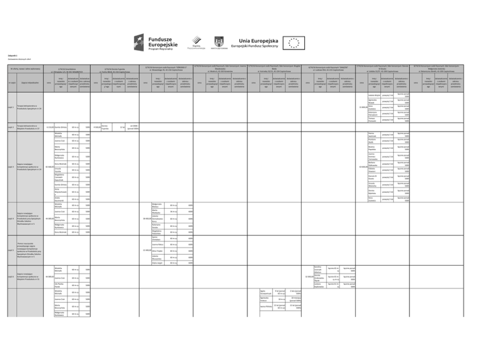 Załącznik 1 Zestawienie złożonych ofert Nr oferty, nazwa i adres wykonawcy nr części część 1 część 2 Zajęcia indywidualne 1/74/16 SmartAdvice ul. Olimpijska 1/3, 58-301 WAŁBRZYCH cena Imię i doświadczen doświadcze nazwisko ie z osobami nie z zakresu prowadzącej/- niepełnospr przedmiotu ego awnymi zamówienia część 4 część 6 część 7 Imię i doświadczenie doświadczenie nazwisko z osobami z zakresu prowadzące niepełnospraw przedmiotu j/-ego nymi zamówienia cena Imię i doświadczenie doświadczenie z nazwisko z osobami zakresu prowadzącej/- niepełnospra przedmiotu ego wnymi zamówienia cena Imię i doświadczenie doświadczenie z nazwisko z osobami zakresu prowadzącej/- niepełnospra przedmiotu ego wnymi zamówienia 5/74/16 Konsorcjum osób fizycznych, lider konsorcjum: Brygida Bieda ul. Kutrzeby 32/15, 42-224 Częstochowa cena Imię i doświadczenie doświadczenie z nazwisko z osobami zakresu prowadzącej/- niepełnospra przedmiotu ego wnymi zamówienia 6/74/16 Konsorcjum osób fizycznych "ZAKĄTEK" ul. Ludowa 95A, 42-215 Częstochowa cena Imię i doświadczenie doświadczenie z nazwisko z osobami zakresu prowadzącej/- niepełnospra przedmiotu ego wnymi zamówienia Terapia behawioralna w Miejskim Przedszkolu nr 37 Zajęcia rozwijające kompetencje społeczne w Przedszkolu Specjalnym nr 24 Zajęcia rozwijające kompetencje społeczne w Przedszkolu przy Specjalnym Ośrodku SzkolnoWychowawczym nr 5 6 210,00 Kamila Glińska Zajęcia rozwijające kompetencje społeczne w Miejskim Przedszkolu Integracyjnym nr 43 cena 82 668,00 44 089,60 4 500,00 Dorota Fujarska 12 lat powyżej 5 lat łącznie ponad 500h Agnieszka Nowak powyżej 5 lat łącznie ponad 500h Ilona Zużewicz powyżej 5 lat łącznie ponad 500h Katarzyna Patrzykont powyżej 5 lat łącznie ponad 500h Tomasz Putowski powyżej 5 lat łącznie ponad 500h od 2008 r. (ponad 500h) 500h 60 m-cy 500h Hanna Iwańczak powyżej 5 lat łącznie ponad 500h powyżej 5 lat łącznie ponad 500h Joanna Ciuk 60 m-cy 500h Marta Beszczyńska 60 m-cy 500h Bożena Papalska powyżej 5 lat łącznie ponad 500h Małgorzata Rynkiewicz 60 m-cy 500h Joanna KremiecTarnowska powyżej 5 lat łącznie ponad 500h Ilona Woźniak 60 m-cy 500h Barbara Dylkowska powyżej 5 lat łącznie ponad 500h 63 600,00 Urszula Szyszka 60 m-cy 500h Elżbieta Stawiarz powyżej 5 lat łącznie ponad 500h Magdalena CzerwieńKapuśniak 60 m-cy 500h Danuta Di Giusto powyżej 5 lat łącznie ponad 500h Kamila Glińska 60 m-cy 500h Urszula Wierecha powyżej 5 lat łącznie ponad 500h Anna Wojciechowsk a 60 m-cy 500h Dorota Rybińska powyżej 5 lat łącznie ponad 500h Aneta Kaczmarek 60 m-cy 500h Ilona Zużewicz powyżej 5 lat łącznie ponad 500h Wioletta Michalik 60 m-cy 500h Małgorzata Blukacz 60 m-cy 600h Joanna Ciuk 60 m-cy 500h Marta Madejska 36 m-cy 600h Marta Beszczyńska 60 m-cy 60 m-cy 60 m-cy 500h Jolanta 38 400,00 DomalewskaKorcz 60 m-cy 600h 500h Katarzyna Dziuba 60 m-cy 600h 500h Magdalena Palasińska 60 m-cy 600h Iwona Chmielarz 60 m-cy 600h Joanna Rakus 60 m-cy 600h 22 400,00 Alina Trepke 37 382,40 Izabela Wojtal Krystyna Skalik Małgorzata Rynkiewicz 44 089,60 Imię i doświadczenie doświadczenie z nazwisko z osobami zakresu prowadzącej/- niepełnospra przedmiotu ego wnymi zamówienia 60 m-cy Pomoc nauczyciela prowadzącego zajęcia rozwijające kompetencje społeczne w Przedszkolu przy Specjalnym Ośrodku SzkolnoWychowawczym nr 5 Zajęcia rozwijające kompetencje społeczne w Miejskim Przedszkolu nr 31 7/74/16 Konsorcjum osób fizycznych, lider konsorcjum: Danuta Di Giusto ul. Łódzka 31/57, 42-200 Częstochowa 31 800,00 Ilona Woźniak część 5 cena 4/74/16 Konsorcjum osób fizycznych, lider konsorcjum: Joanna Śliwakowska ul. Modra 6, 42-263 Korwinów 3/74/16 Konsorcjum osób fizycznych "OŚRODEK 5" ul. Słowackiego 35, 42-216 Częstochowa Terapia behawioralna w Przedszkolu Specjalnym nr 24 Wioletta Michalik część 3 2/74/16 Dorota Fujarska ul. Focha 38m8, 42-216 Częstochowa 60 m-cy 600h Jolanta Muszyńska 60 m-cy 600h Edyta Jargot 60 m-cy 600h Wioletta Michalik 60 m-cy 500h Joanna Ciuk 60 m-cy 500h Ula Pianka Panek 60 m-cy 500h Wioletta Michalik 60 m-cy 500h Agata Szczepańczyk Joanna Ciuk 60 m-cy 500h Agnieszka Srokosz Marta Beszczyńska 60 m-cy 500h Iwona Pilińska Małgorzata Rynkiewicz 60 m-cy 500h 32 000,00 24 000,00 9 lat (ponad 60 m-cy) 2 lata (ponad 500h) 18 m-cy 18 miesięcy (ponad 500h) 15 lat (ponad 60 m-cy) 15 lat (ponad 500h) Karolina JuszczykAdamus łącznie 65 mcy łącznie ponad 500h Dorota GrabowskaŚlęzak łącznie 65 mcy m-cy łącznie ponad 500h Justyna Kapkowska łącznie 61 mcy łącznie ponad 500h 8/74/16 Konsorcjum osób fizycznych, lider konsorcjum: Małgorzata Jezierska ul. Botaniczna 26m65, 42-200 Częstochowa cena Imię i doświadczenie doświadczenie z nazwisko z osobami zakresu prowadzącej/- niepełnospra przedmiotu ego wnymi zamówienia część 7 część 8 część 9 część 10 część 11 część 12 Zajęcia rozwijające kompetencje społeczne w Miejskim Przedszkolu Integracyjnym nr 43 Ilona Woźniak 60 m-cy 500h Urszula Szyszka 60 m-cy 500h 60 m-cy 500h Kamila Glińska 60 m-cy 500h Anna Wojciechowsk a 60 m-cy 500h Aneta Kaczmarek 60 m-cy 500h Maryla Dutkiewicz Vogel 60 m-cy 500h Dorota Czebatul 60 m-cy 500h 37 382,40 Magdalena CzerwieńKapuśniak 24 000,00 Terapia ręki w Przedszkolu Specjalnym nr 24 Terapia ręki w Miejskim Przedszkolu Integracyjnym nr 35 im. Małego Księcia Kamila Glińska 60 m-cy 500h Ula Pianka Panek 60 m-cy 100h 41 334,00 Joanna Śliwakowska od 1996 r. od 1996 r. (łącznie ponad 500h) Daria Nowak od 2014 r. od 2014 r. (łącznie ponad 500h) 17 400,00 Terapia polisensoryczna w Miejskim Przedszkolu Integracyjnym nr 43 6 000,00 Dorota Fujarska 12 lat od 2008 r. (ponad 500h) 3 240,00 Joanna Śliwakowska od 1996 r. Terapia polisensoryczna w Miejskim Przedszkolu nr 37 część 14 Terapia polisensoryczna w Miejskim Przedszkolu Integracyjnym nr 35 im. Małego Księcia cz
